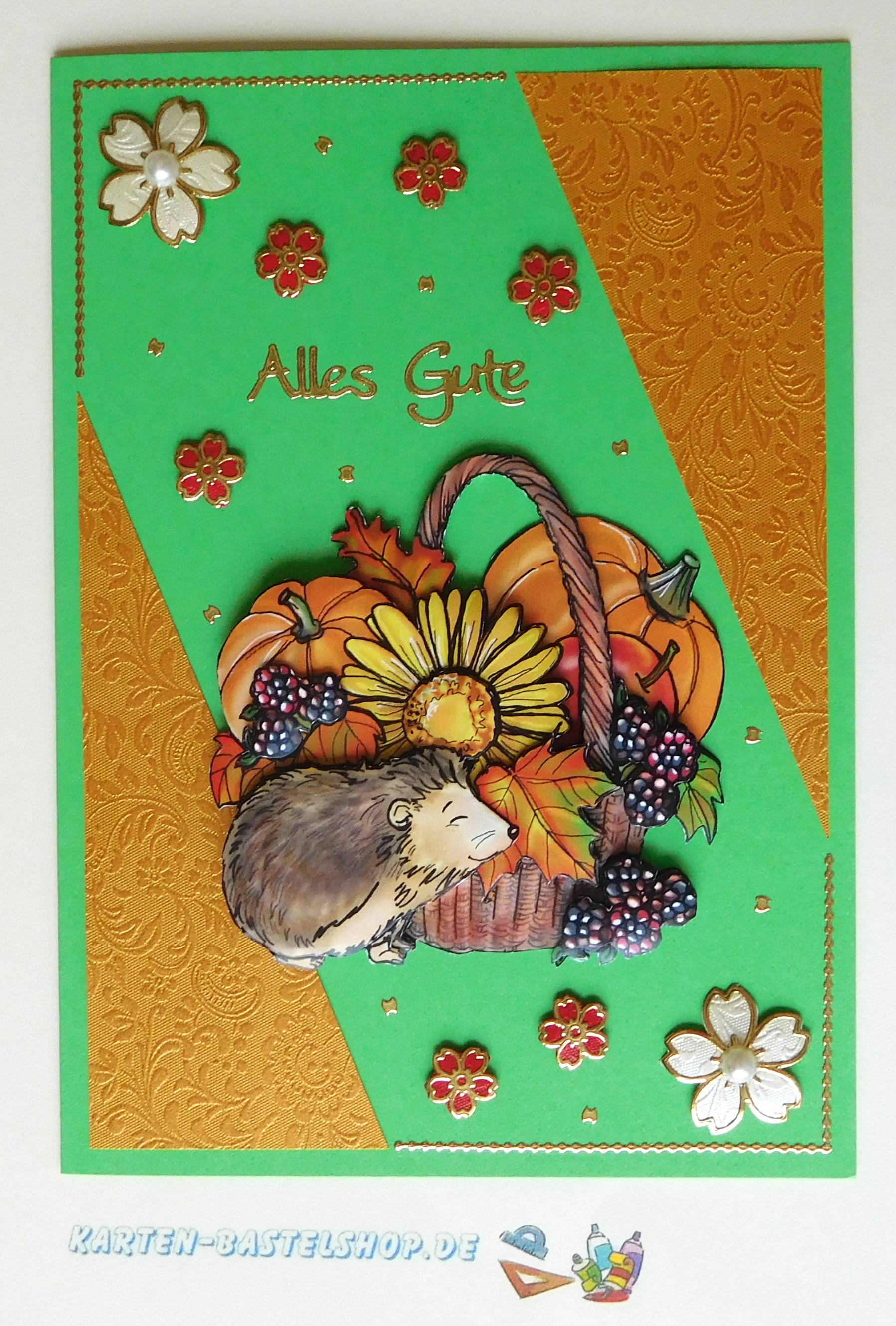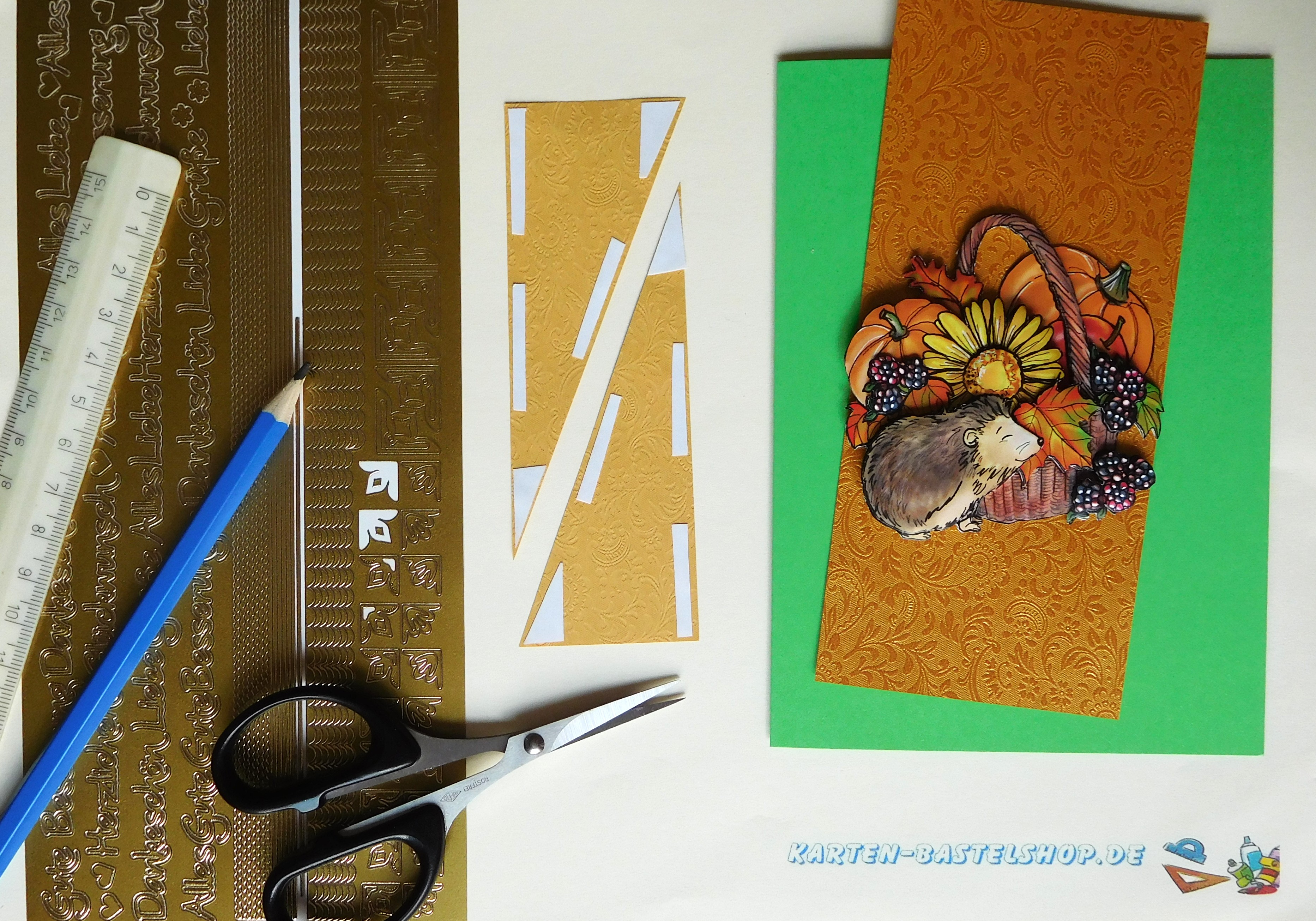 Für diese Karte nehmt ihr eine grüne A6-Klappkarte als Basis. Das warme Herbstmotiv mit einem Korb und einem kleinen Igel wird von farbigen Papieren eingerahmt. Vom altgoldenen Bastelpapier schneidet ihr einen 4 cm breiten Streifen ab, kürzt ihn auf 10 cm und teilt ihn diagonal. Diese beiden Dreiecke klebt ihr in die rechte obere und linke untere Kartenecke. Achtet darauf, dass rundum etwa 4 mm Abstand zum Kartenrand bleibt. Mit einer 4 cm und einer 5,7 cm langen Pünktchenbordüre rahmt ihr die beiden freien Ecken ein – so entsteht ein harmonischer Rahmen, der das Motiv schön betont.