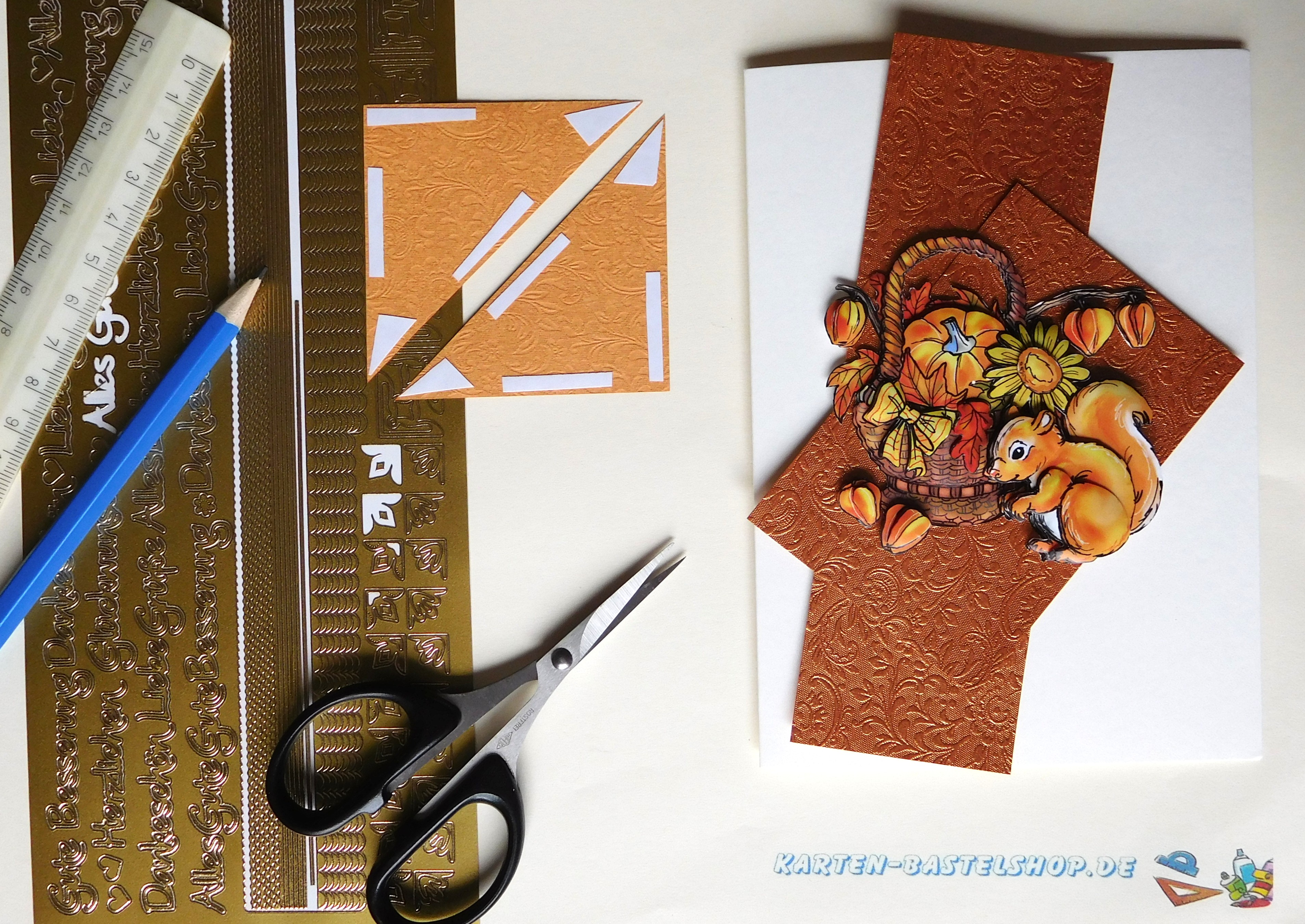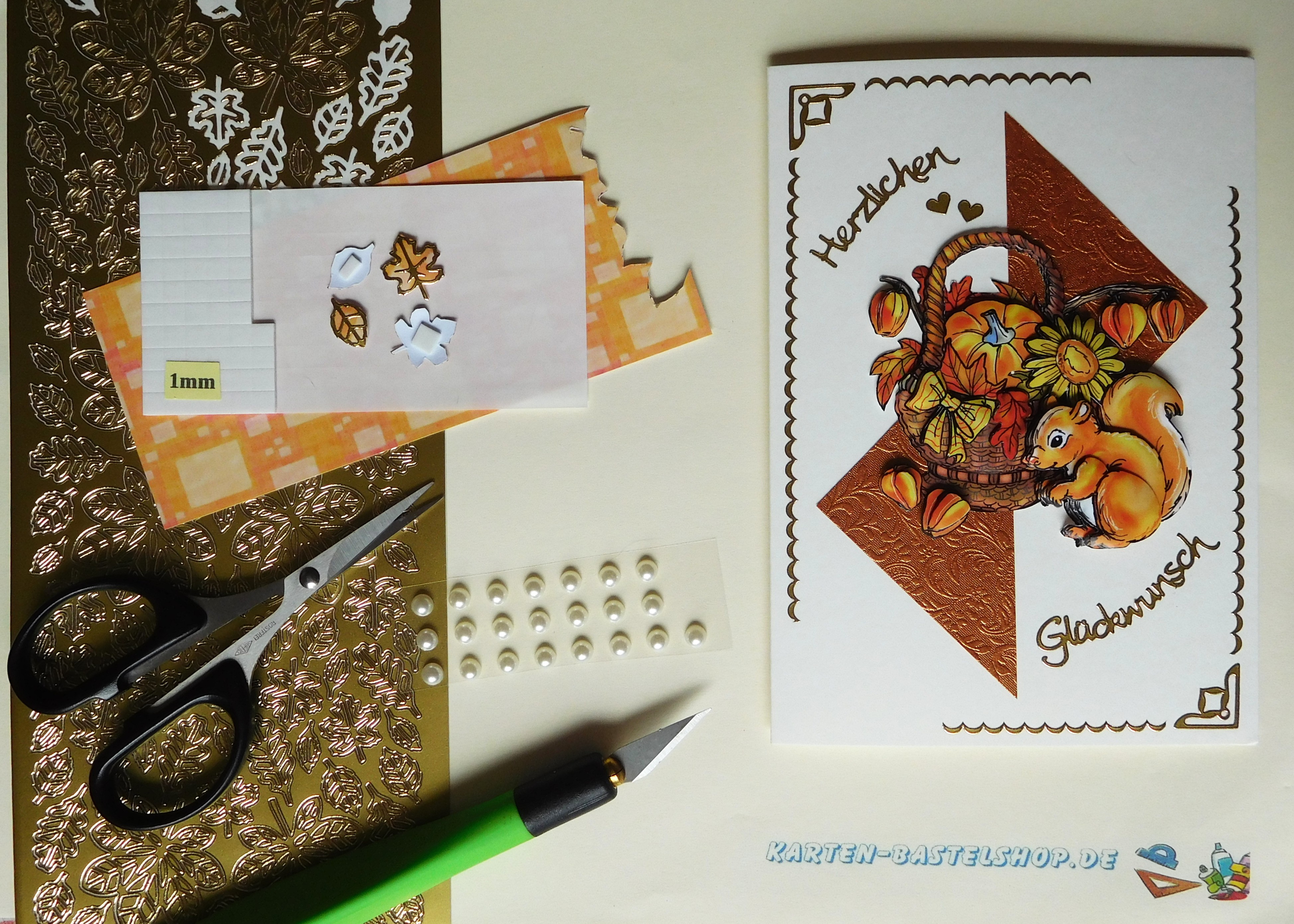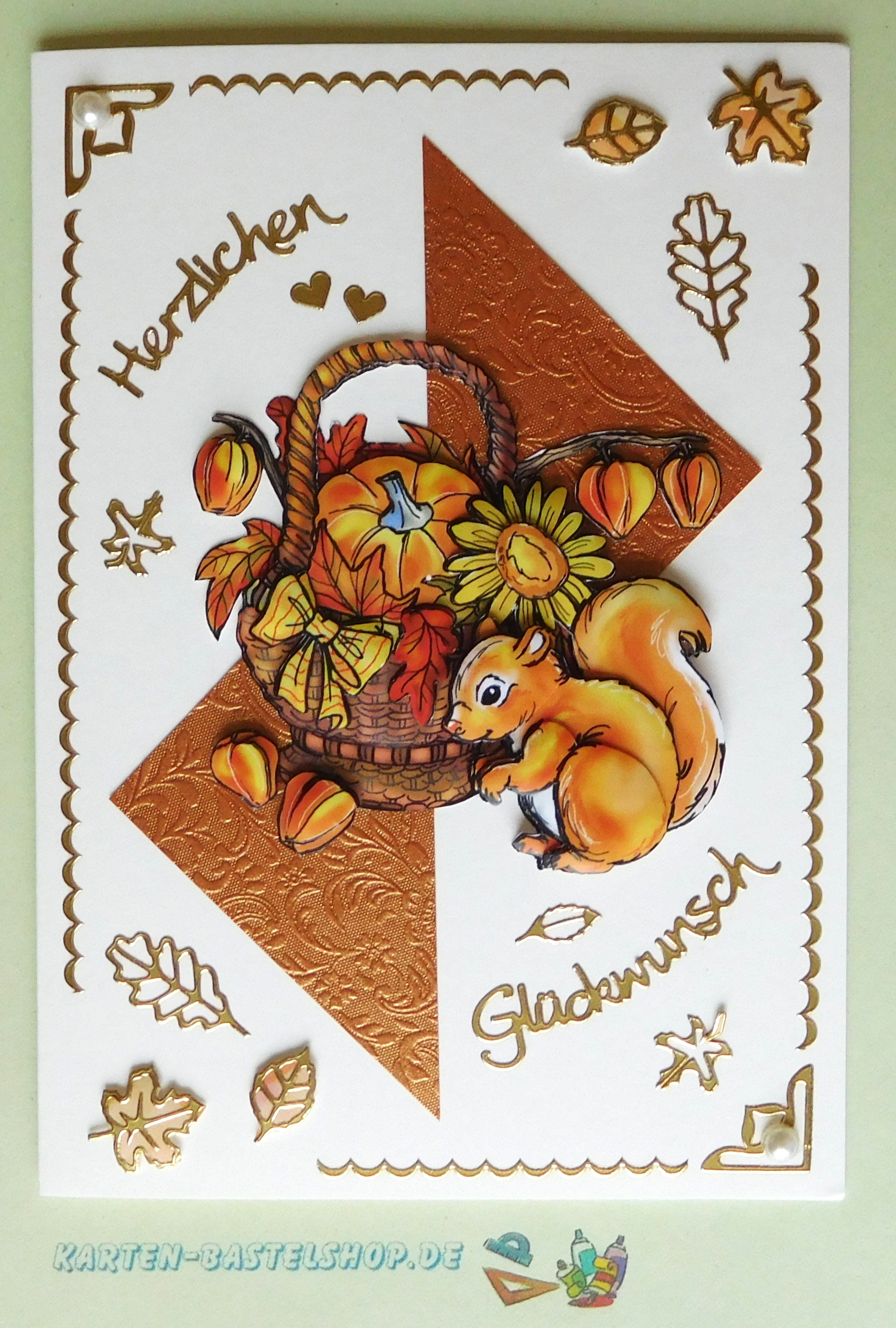 Diese naturweiße Karte wirkt besonders edel und zeigt ein herbstliches 3D-Motiv mit einem Eichhörnchen im Korb. Als Basis dient bronzefarbenes „Ornament“-Bastelpapier, dazu goldene Sticker mit den Aufschriften „Gute Besserung“ und „Herbstlaub“, weiße Halbperlen sowie der gelb-orange Hintergrundstreifen. Die warme Farbgestaltung bringt das Motiv besonders schön zur Geltung.