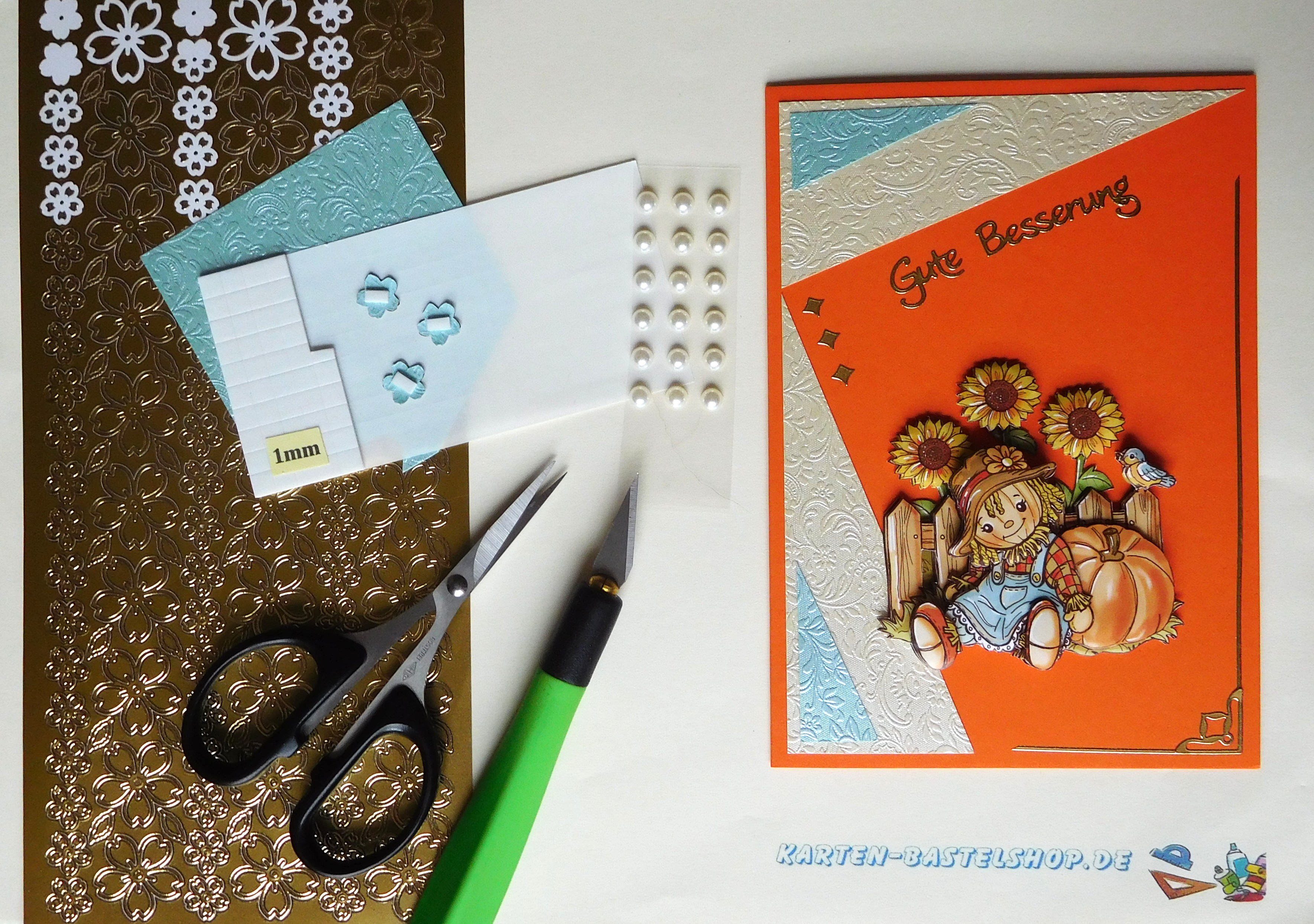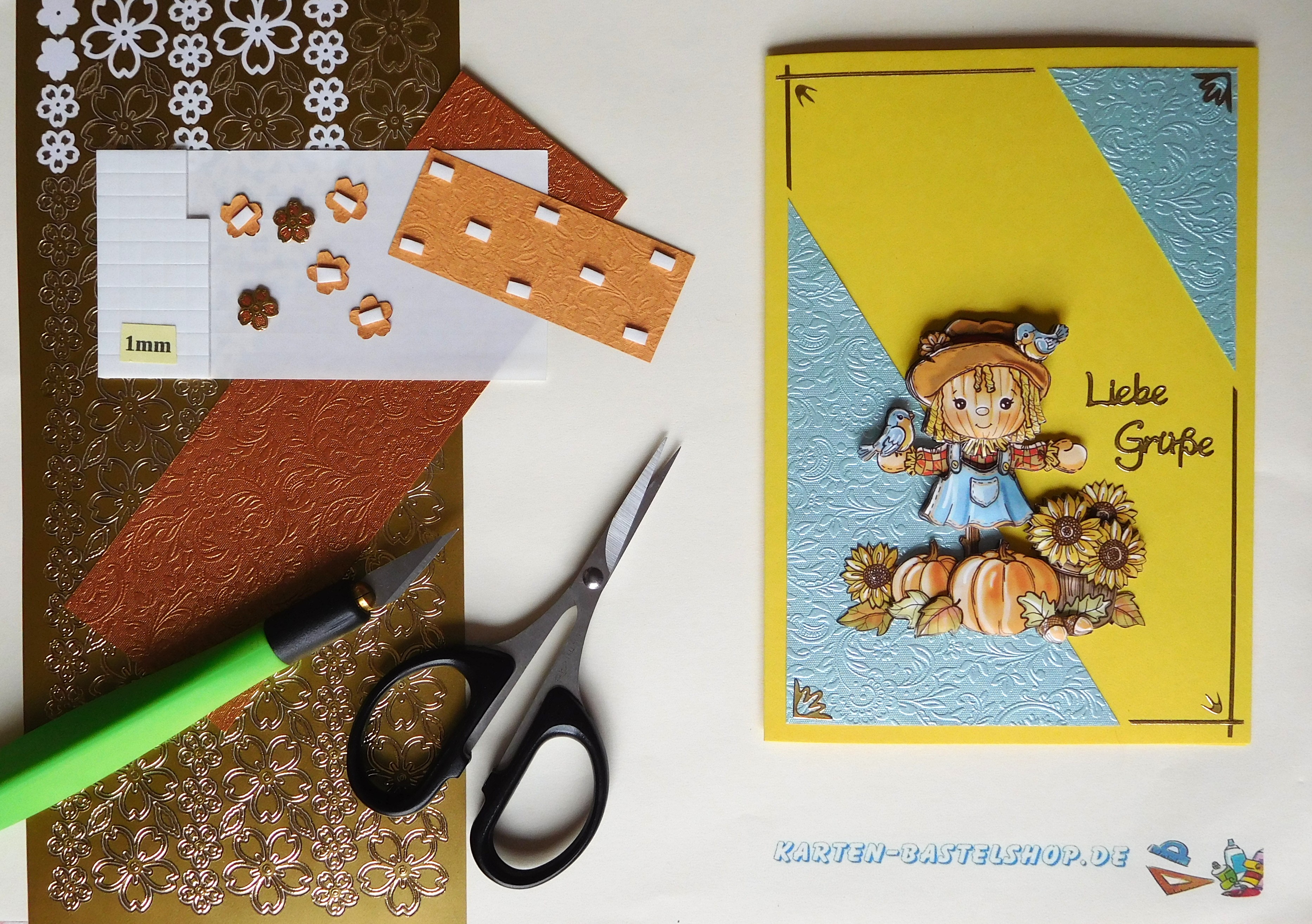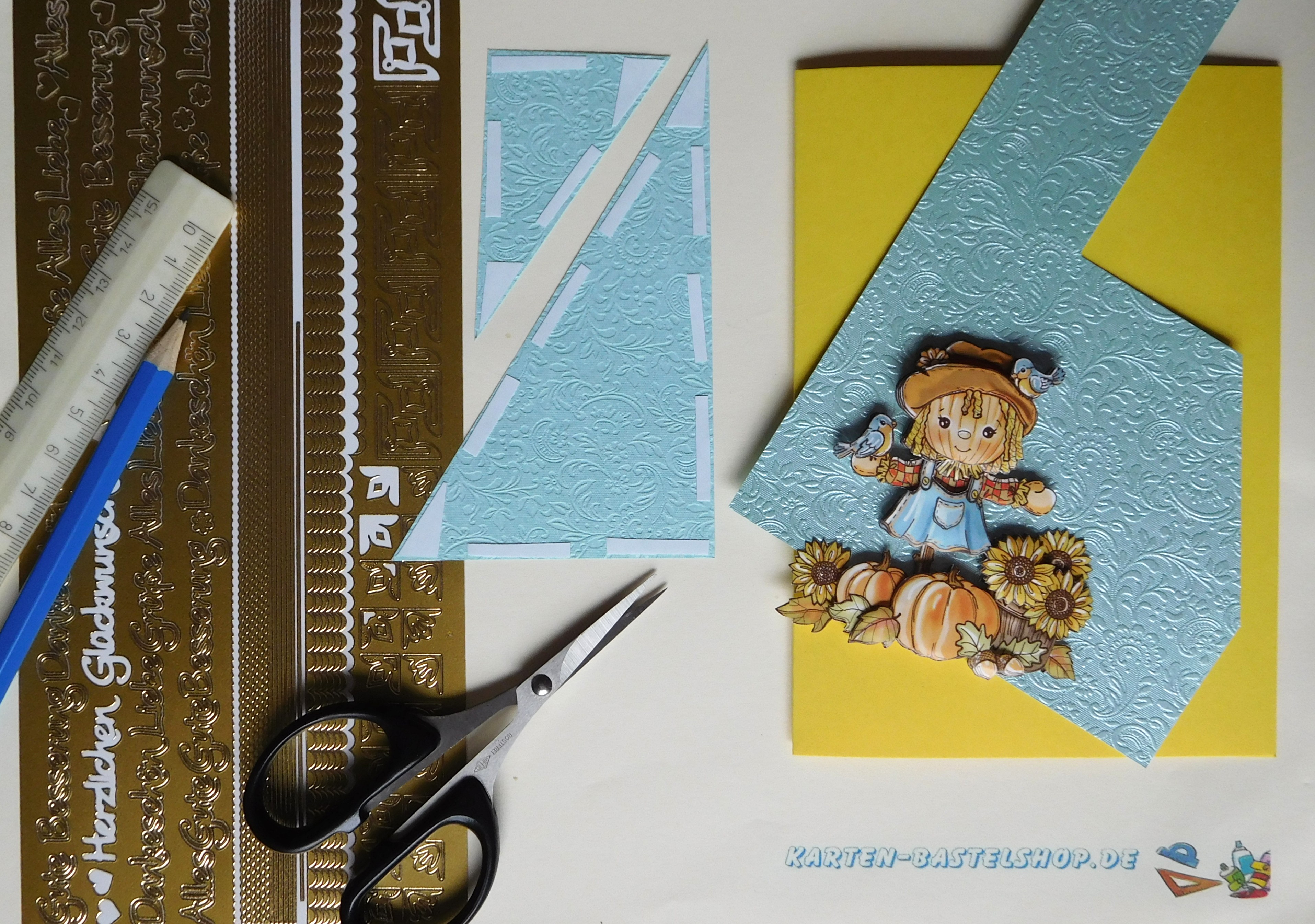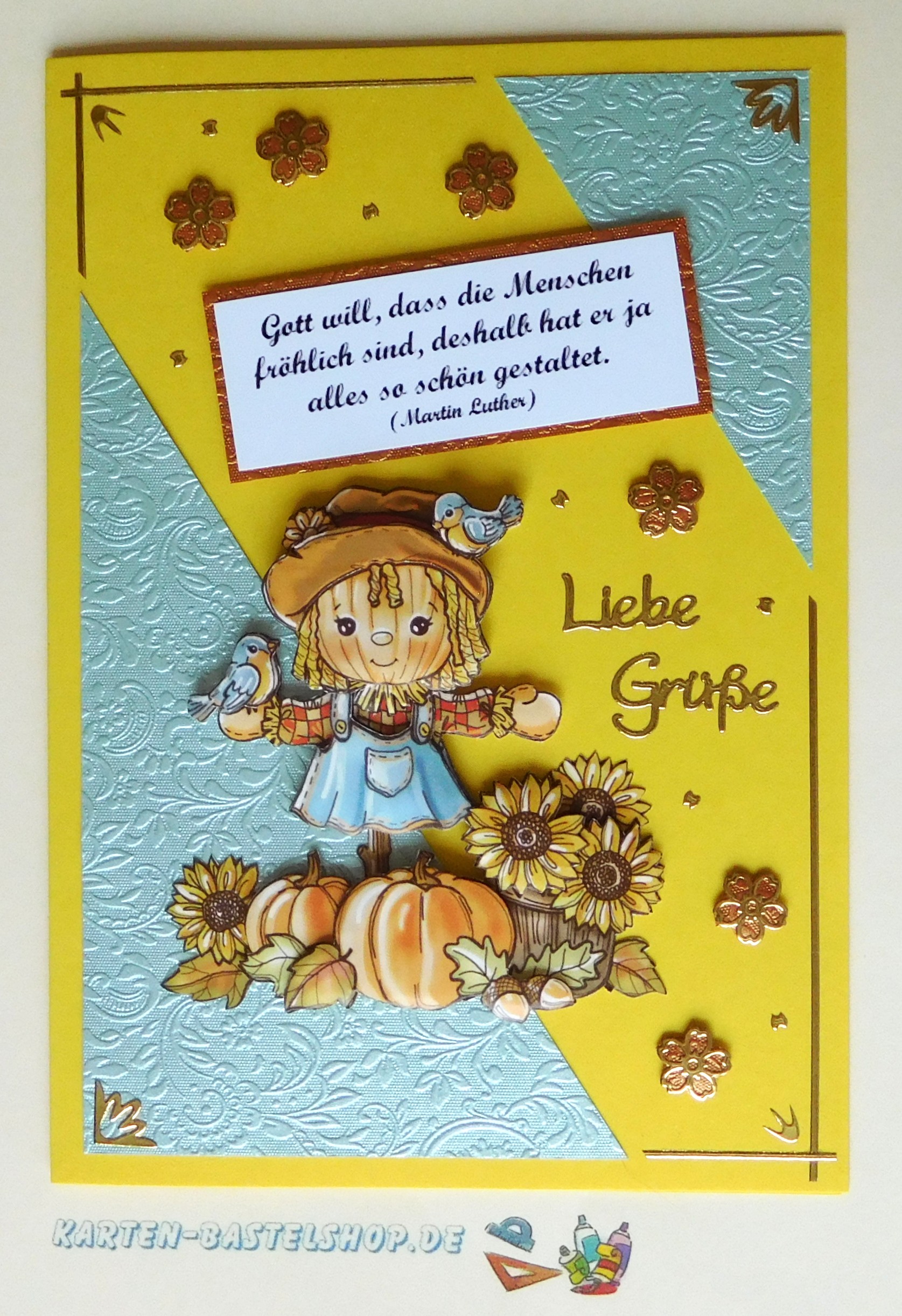 Diese gelbe Karte bringt sofort herbstliche Stimmung auf den Basteltisch. Das Highlight ist ein 3D-Motiv mit einer stehenden Vogelscheuche, die neben einem großen Kürbis und Sonnenblumen platziert ist. Ergänzt wird das Ganze durch hellblaues und bronzefarbenes „Ornament“-Bastelpapier, goldene Sticker mit den Schriftzügen „Gute Besserung“ und „Kirschblüte“ sowie einen passenden Spruch. Durch die kräftigen Farben und die liebevollen Details entsteht ein freundlicher Herbstgruß, der wunderbar zur Jahreszeit passt.