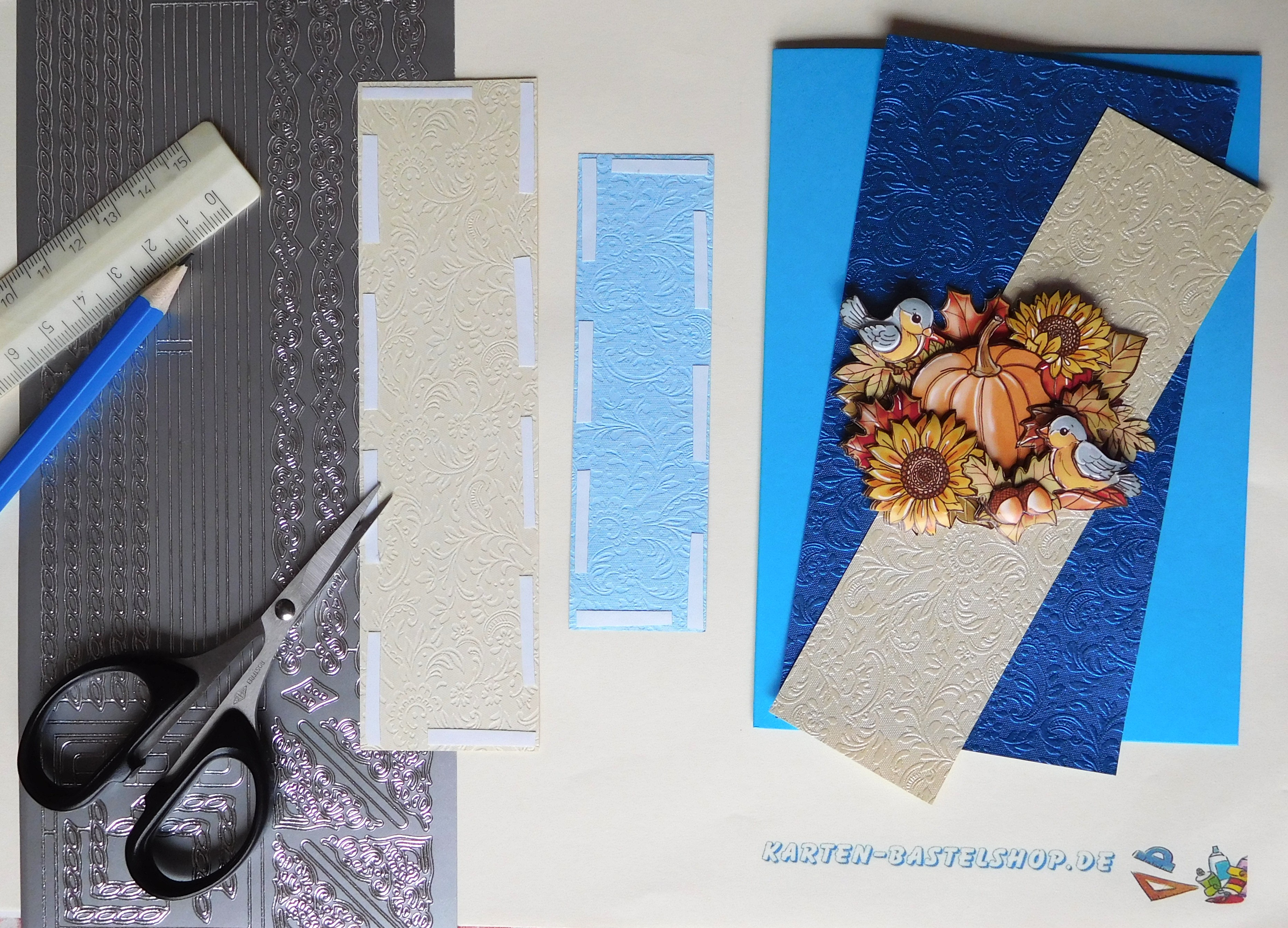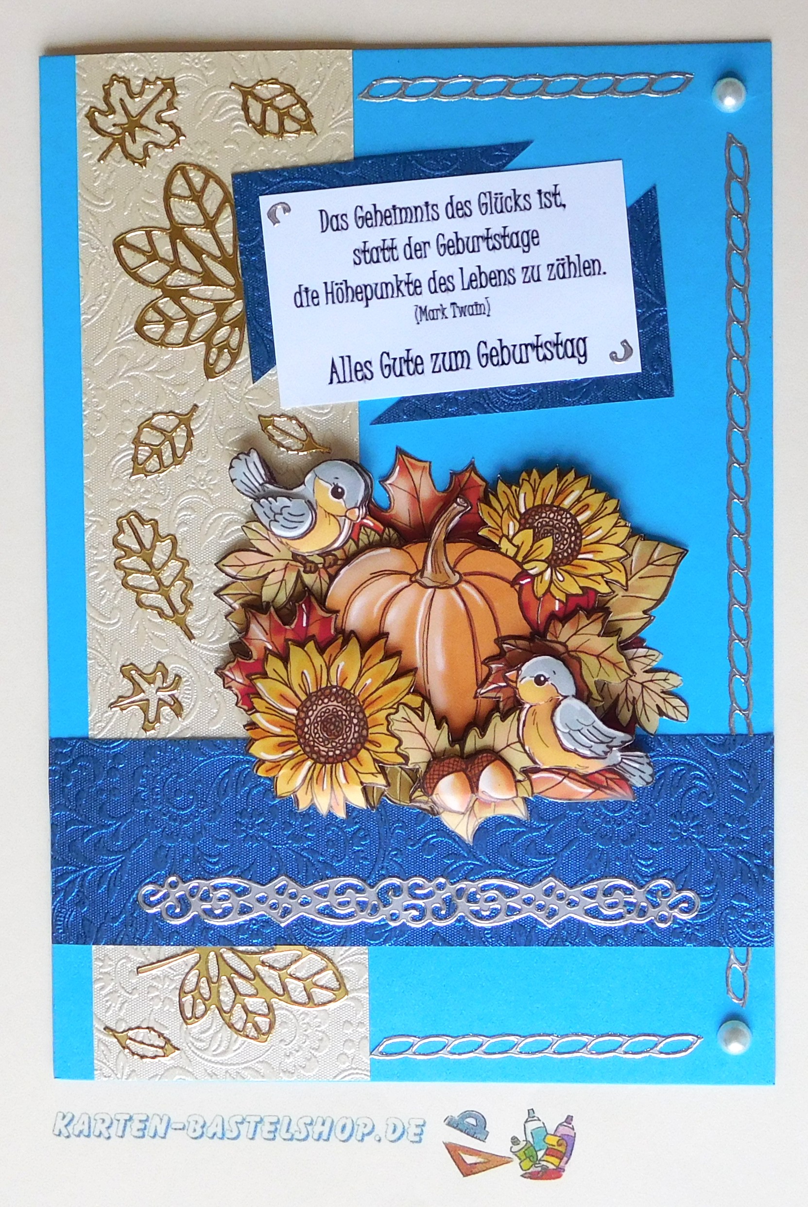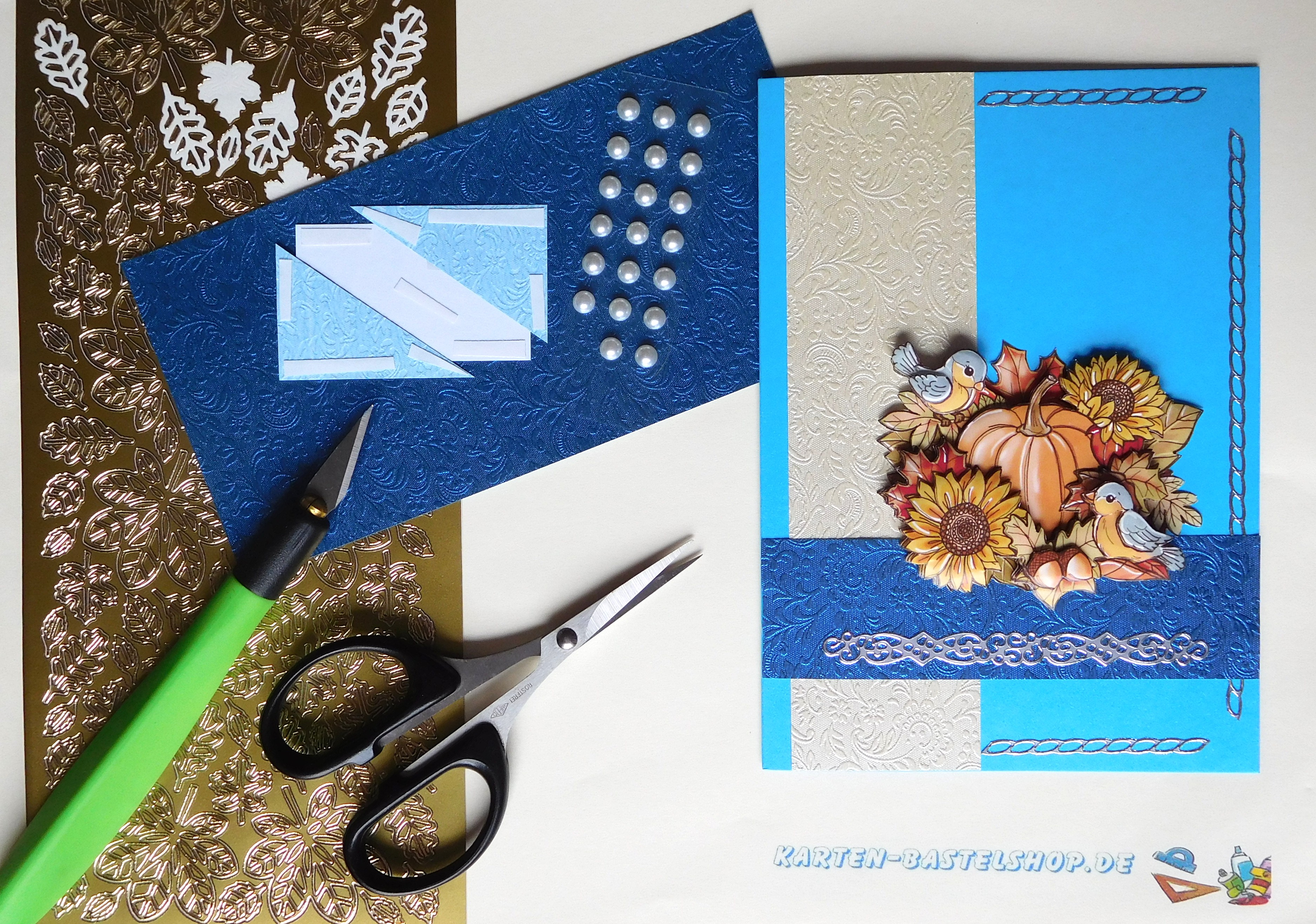 Diese blaue Karte bringt das volle Herbstgefühl zu Euch nach Hause. Im Mittelpunkt steht ein 3D-Motiv mit Vögeln, die sich auf einem Kürbis und zwischen Sonnenblumen niedergelassen haben. Dazu kombinieren wir elfenbein- und dunkelblaues „Ornament“-Bastelpapier, silberne Sticker aus der Serie „Ränder und Ecken“, goldene „Herbstlaub“-Sticker, weiße Halbperlen und einen feierlichen Spruch. Die Farbzusammenstellung wirkt besonders edel, da das tiefe Blau und das warme Elfenbein einen schönen Kontrast bilden, während die herbstlichen Akzente für Stimmung sorgen.