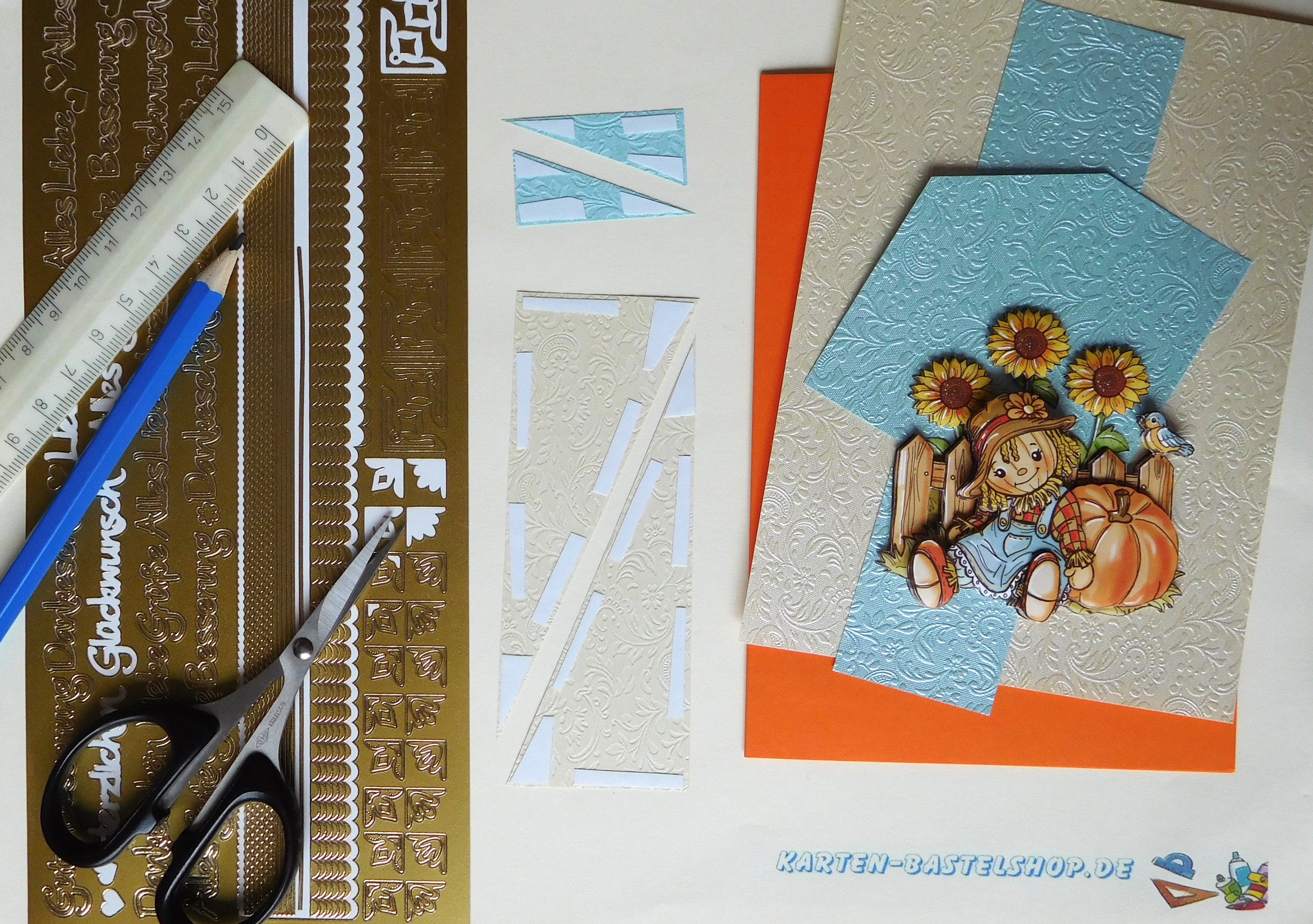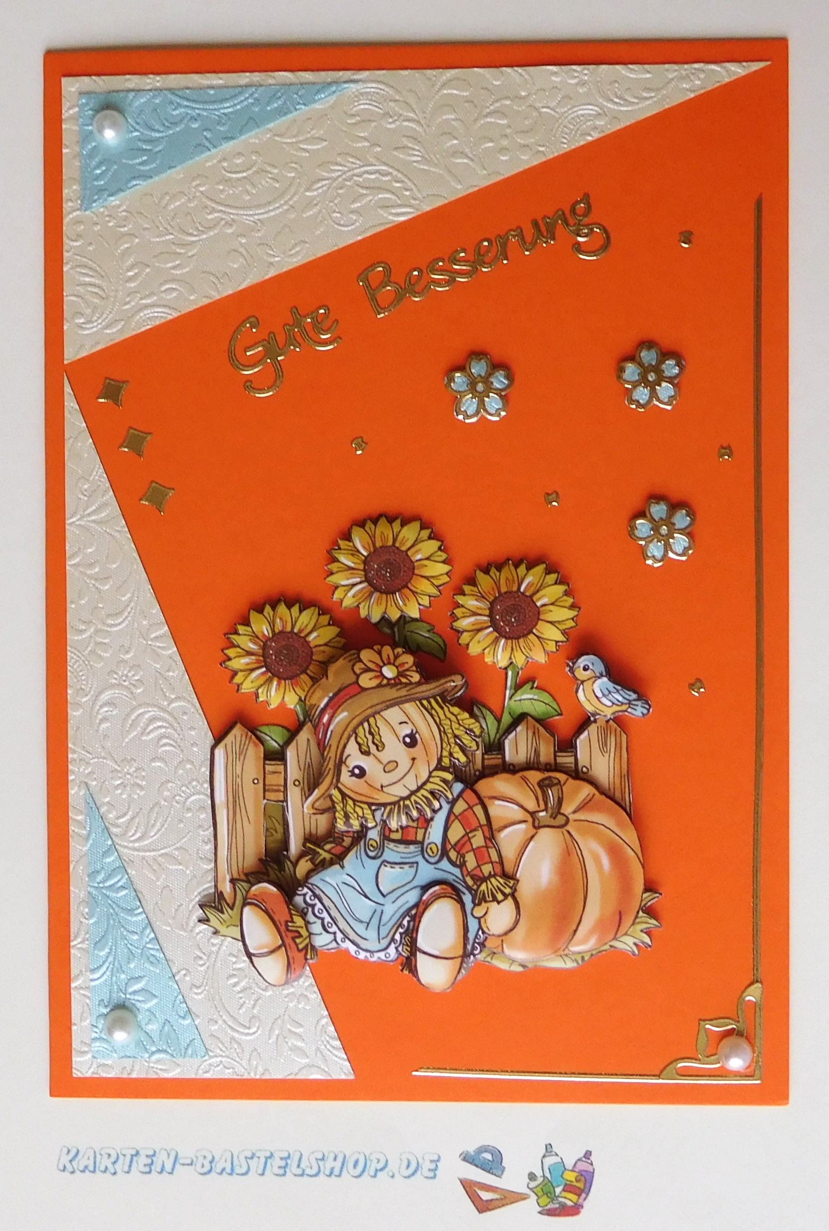 Diese orange Karte bringt herbstliche Stimmung pur. Im Mittelpunkt steht eine freundliche Vogelscheuche, die es sich vor einem Kürbis und einem kleinen Gartenzaun gemütlich gemacht hat. Passend dazu werden elfenbein- und hellblaues „Ornament“-Bastelpapier verwendet, ergänzt durch goldene Sticker aus den Serien „Gute Besserung“ und „Kirschblüte“ sowie einige weiße Halbperlen. Das Zusammenspiel aus warmen und kühlen Farben sorgt für eine ausgewogene Gestaltung, die lebendig und freundlich wirkt.