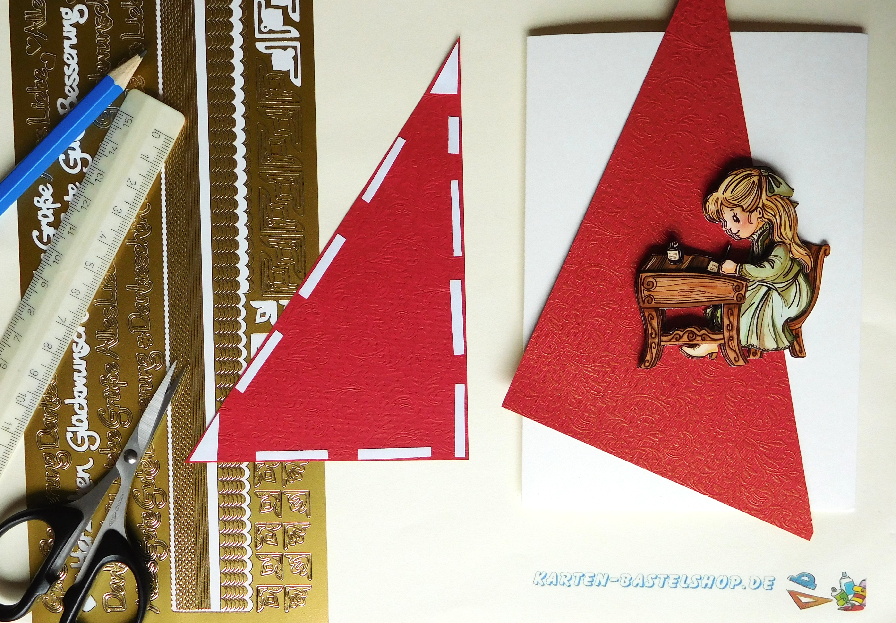 Beginnt mit dem roten Bastelpapier: Schneidet ein großes Dreieck von 9,5 × 13,5 cm aus und klebt es passgenau in die linke untere Ecke der Karte. Mit einer goldenen Bogenbordüre umrahmt ihr das Dreieck und sorgt so für einen eleganten Abschluss. Das Reststück des Papiers könnt ihr nutzen, um die gegenüberliegende freie Ecke ebenfalls zu umranden. Achtet dabei auf einen gleichmäßigen Abstand von etwa 4 mm zum Kartenrand. In die Ecke des roten Dreiecks klebt ihr einen kleinen Ecksticker, das Innenstück davon platziert ihr dekorativ in die gegenüberliegende Stickerecke.