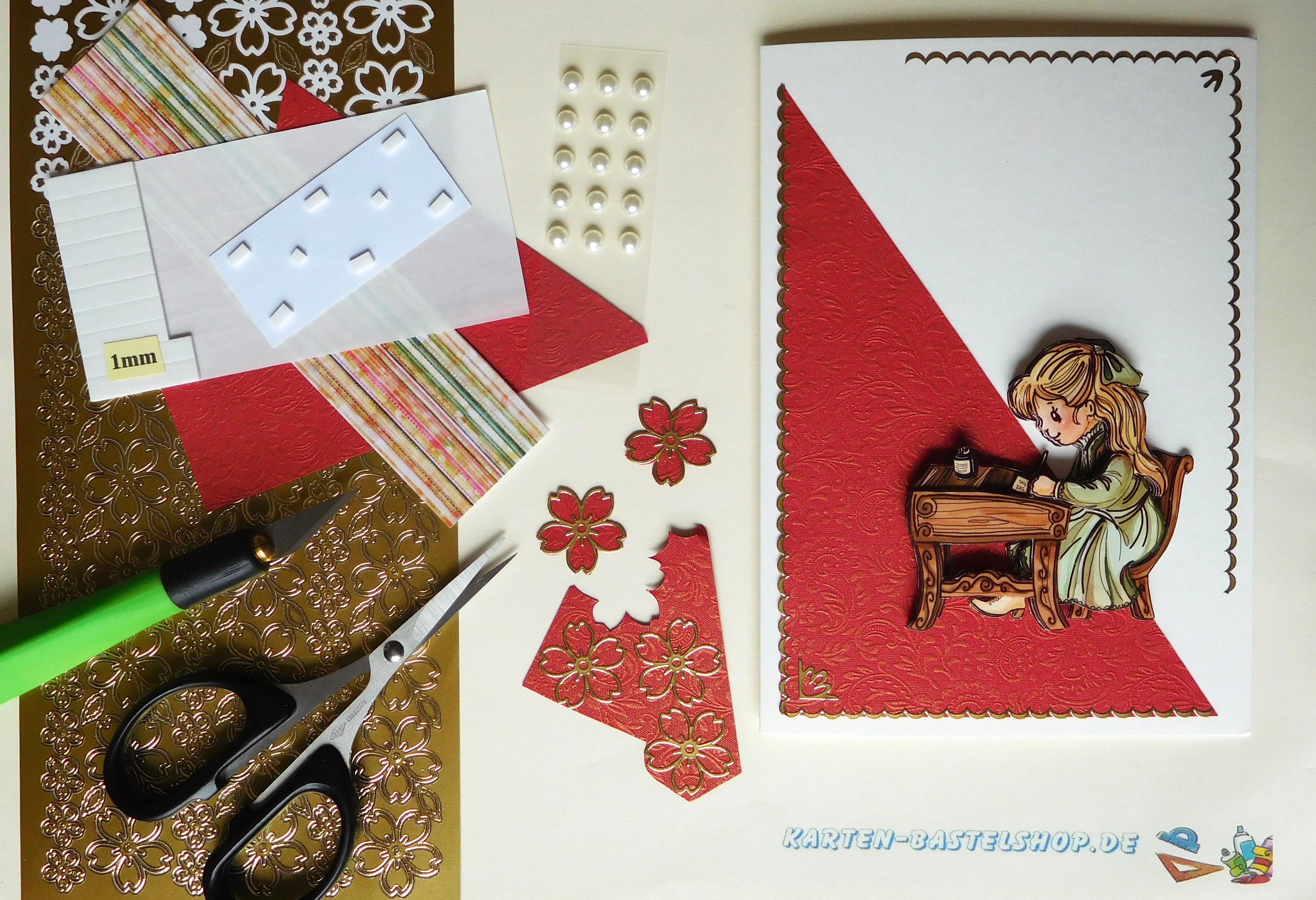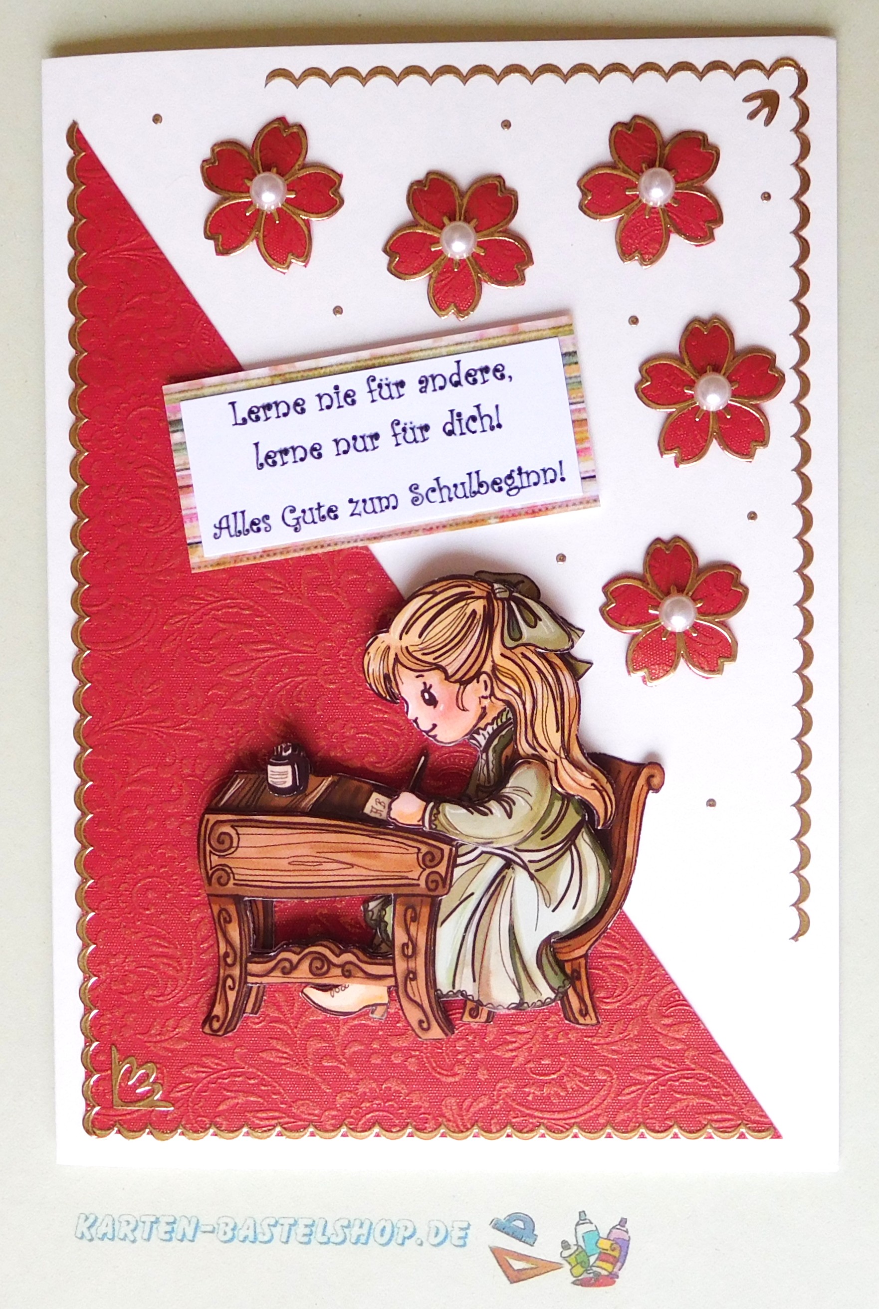Diese naturweiße Karte ist perfekt für den Start ins neue Schuljahr gestaltet. Das Hauptmotiv zeigt ein kleines Mädchen am Schreibtisch – ein liebevolles 3D-Bild, das durch die warmen Farben und Details sofort ins Auge fällt. Dazu kombiniert ihr rot-goldenes „Ornament“-Bastelpapier, goldene Sticker der Serien „Gute Besserung“ und „Kirschblüte“ sowie weiße Halbperlen. Ein farbenfroher Hintergrundstreifen ergänzt die Gestaltung, sodass die Karte feierlich wirkt und gute Wünsche zum Schulbeginn übermittelt.