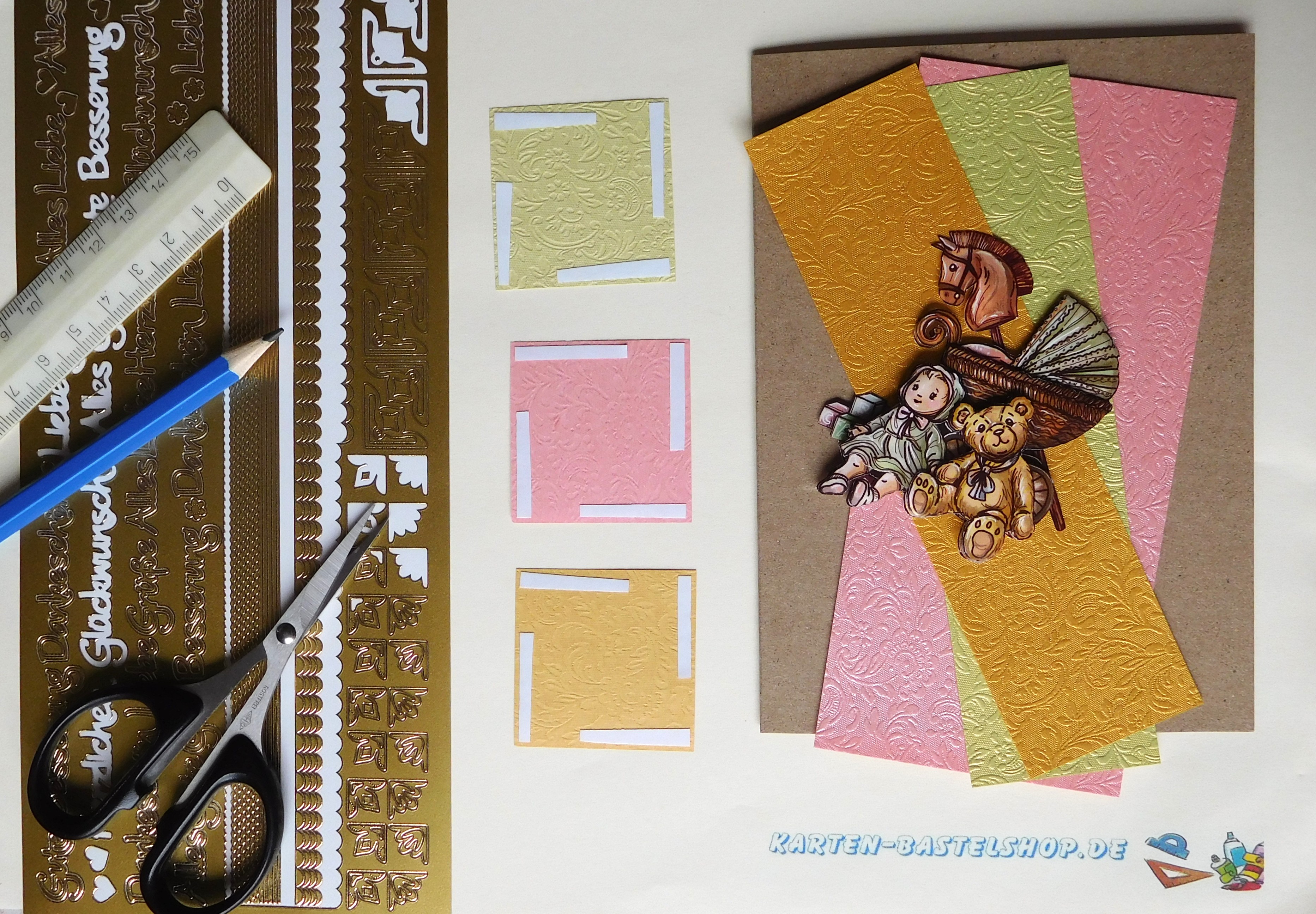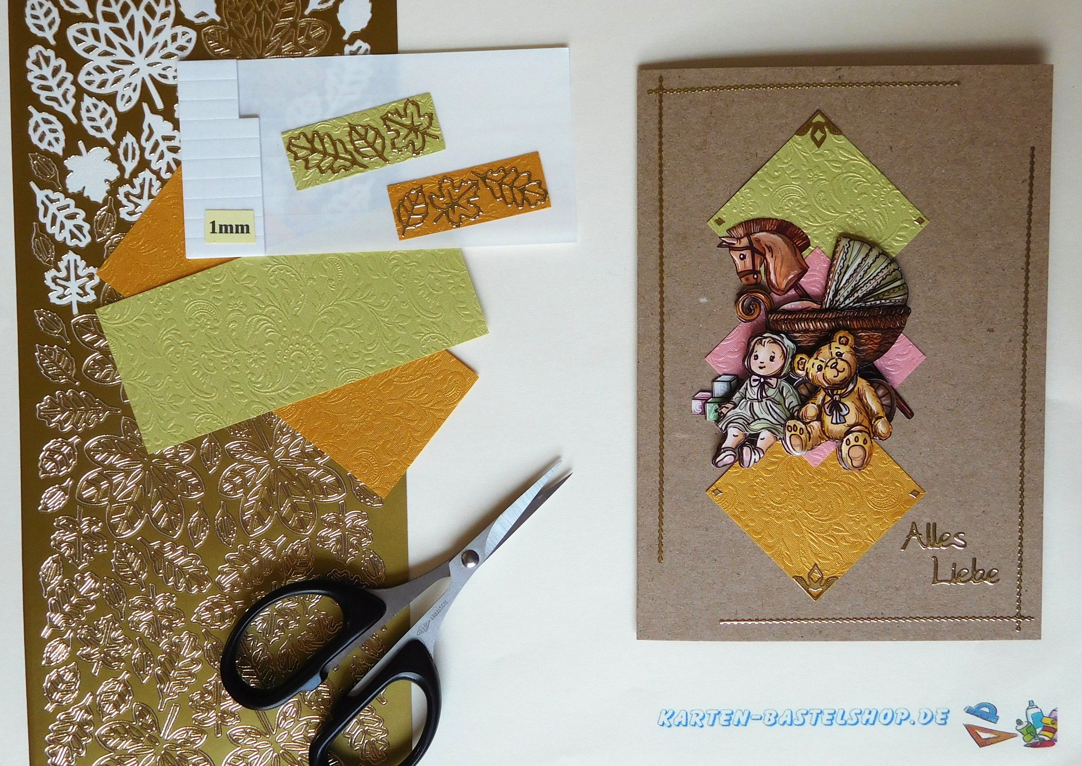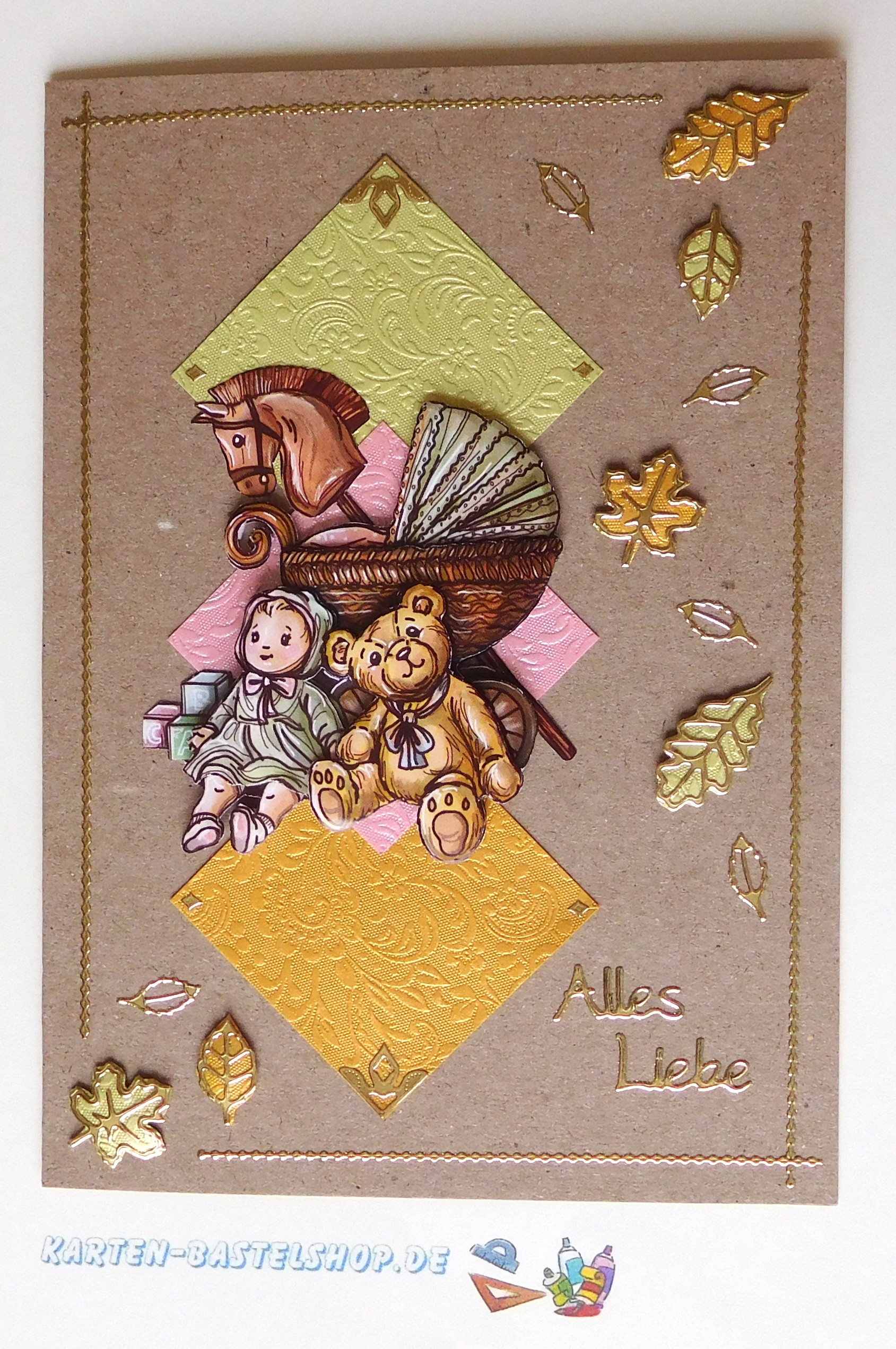 Diese naturfarbene Karte wirkt verspielt und gleichzeitig elegant. Im Mittelpunkt steht ein liebevolles 3D-Motiv mit einem Kinderwagen, einer Puppe und einem Teddy – ein herzerwärmendes Bild, das sich ideal für Glückwünsche rund um Familie, Geburt oder Kinder eignet. Farblich harmonieren dazu goldenes, hellgrünes und rosafarbenes „Ornament“-Bastelpapier. Goldene Sticker aus den Serien „Gute Besserung“ und „Herbstlaub“ runden die Gestaltung ab und verleihen der Karte ein feines, hochwertiges Finish.