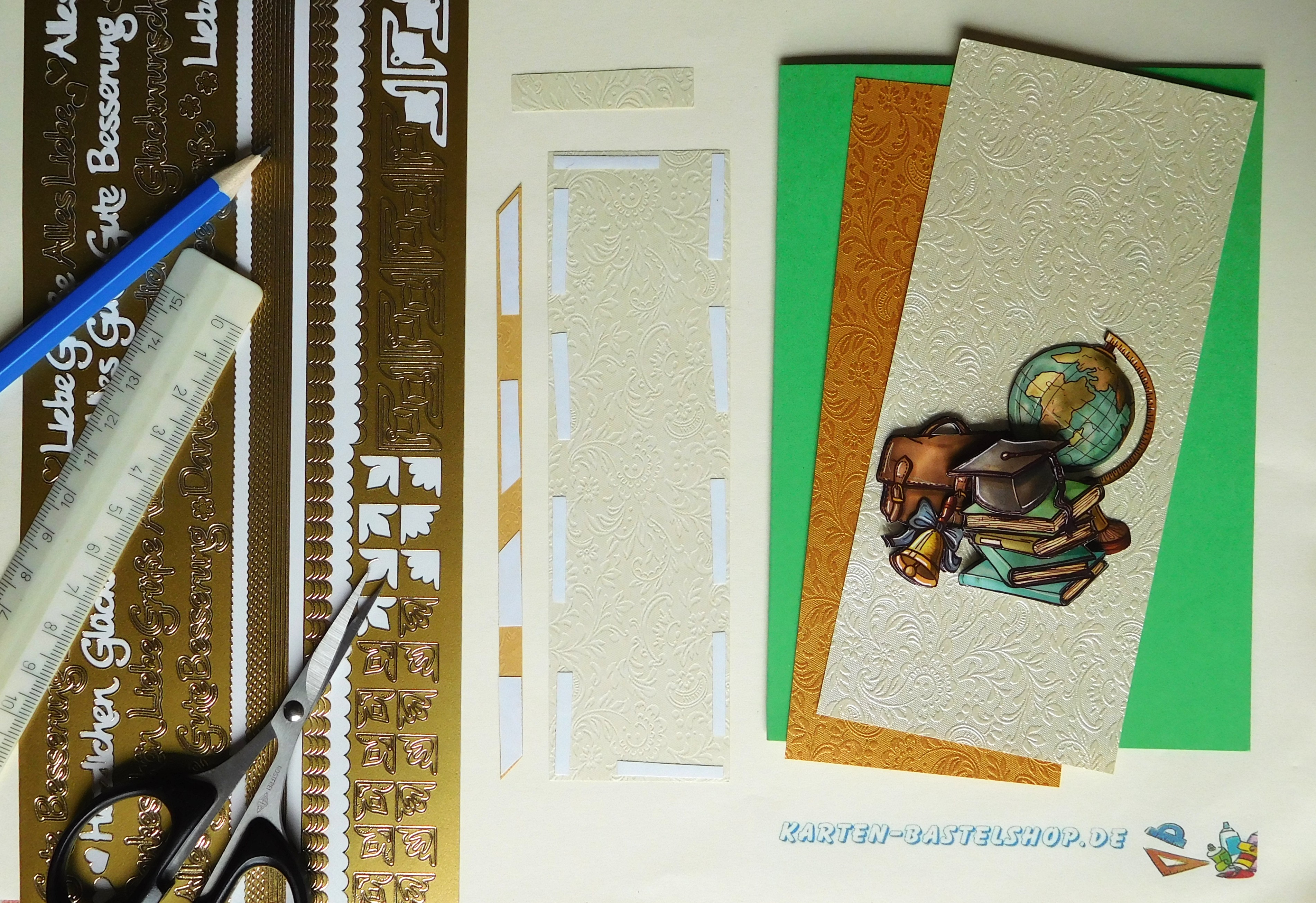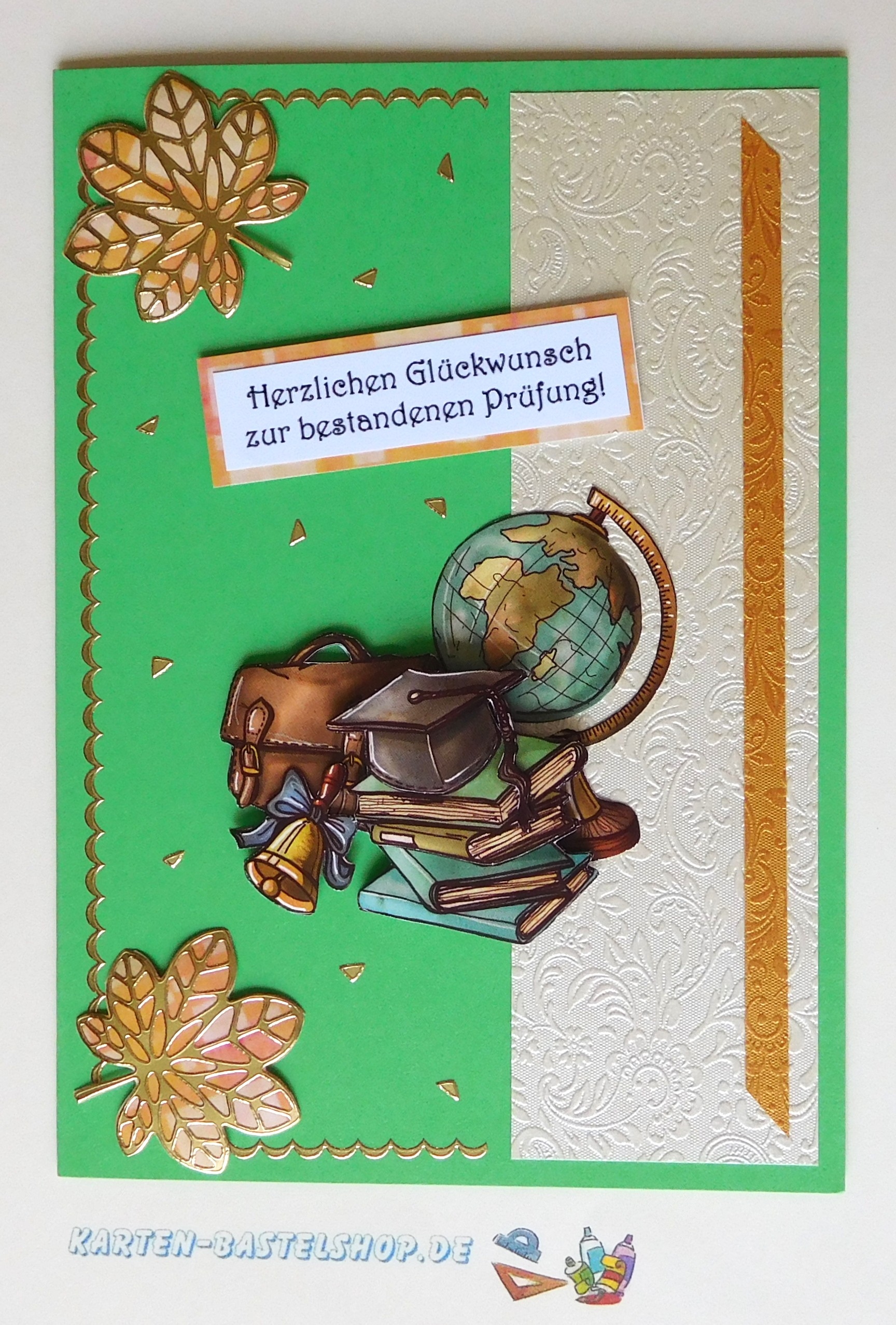 Diese grüne Karte ist perfekt für alle, die ein wichtiges Ziel erreicht haben. Im Mittelpunkt steht ein 3D-Motiv mit Examenhut, Büchern und einem Globus – ein Sinnbild für Fleiß, Wissen und Erfolg. Unterstützt wird die Gestaltung durch edles elfenbeinfarbenes und altgoldenes „Ornament“-Bastelpapier. Dazu kommen goldene Sticker aus den Serien „Gute Besserung“ und „Herbstlaub“ sowie ein passender Spruch auf dem gelb-orangenen Hintergrundstreifen. Zusammen ergibt sich eine festliche und zugleich warme Karte, die stolz und Freude zum Ausdruck bringt.
