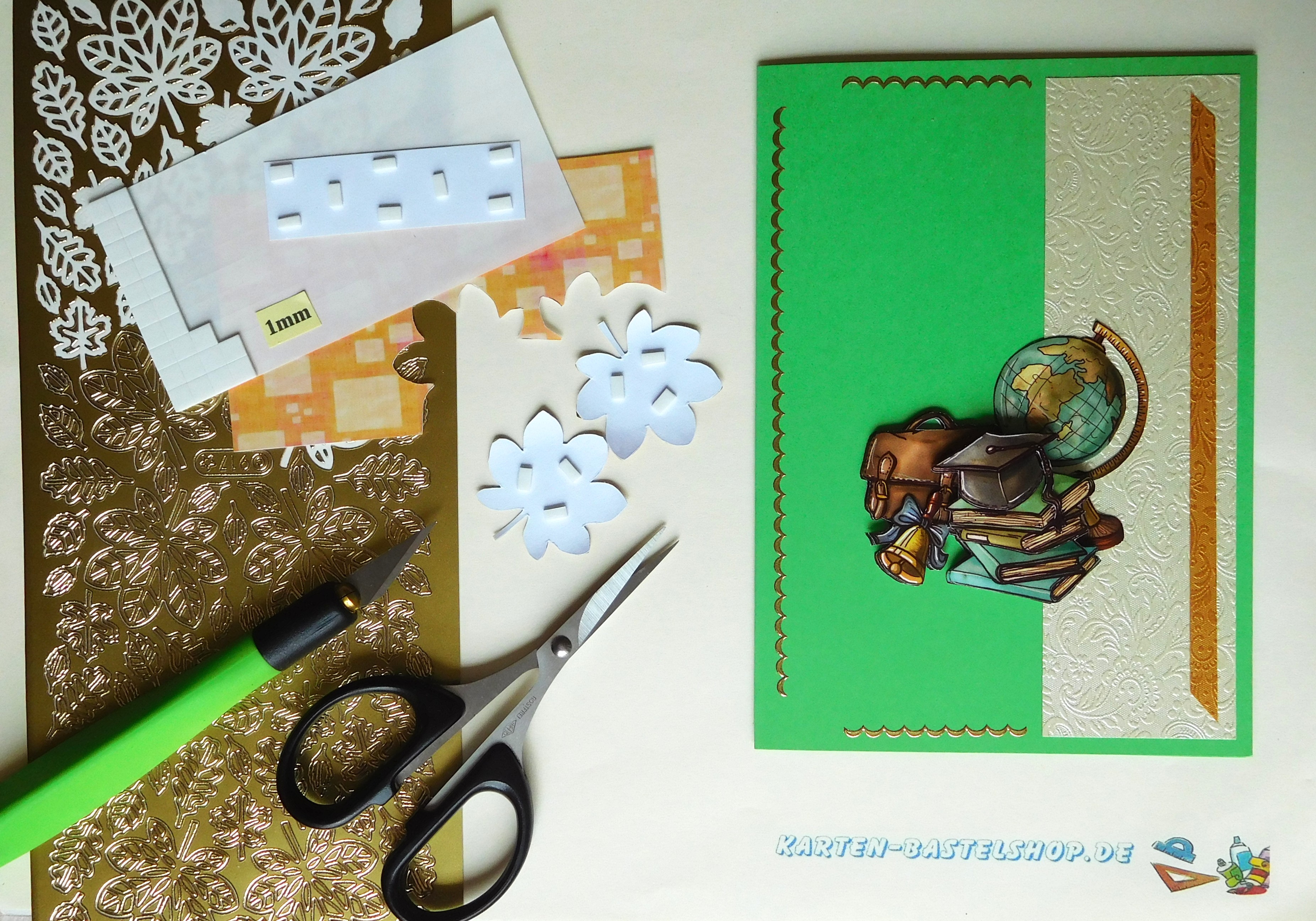 Nun wird der Spruch vorbereitet: Klebt den Glückwunsch zum Schulbeginn auf den bunt gestreiften Hintergrundstreifen und schneidet ihn so aus, dass ein feiner Rand von etwa 2 mm bleibt. Das 3D-Motiv mit dem Mädchen positioniert ihr mittig auf der Karte, mit ungefähr 1,5 cm Abstand zum unteren Rand. Direkt darüber befestigt ihr den Gruß mit 1 mm Klebepads leicht erhöht, sodass er optisch hervorgehoben wird.