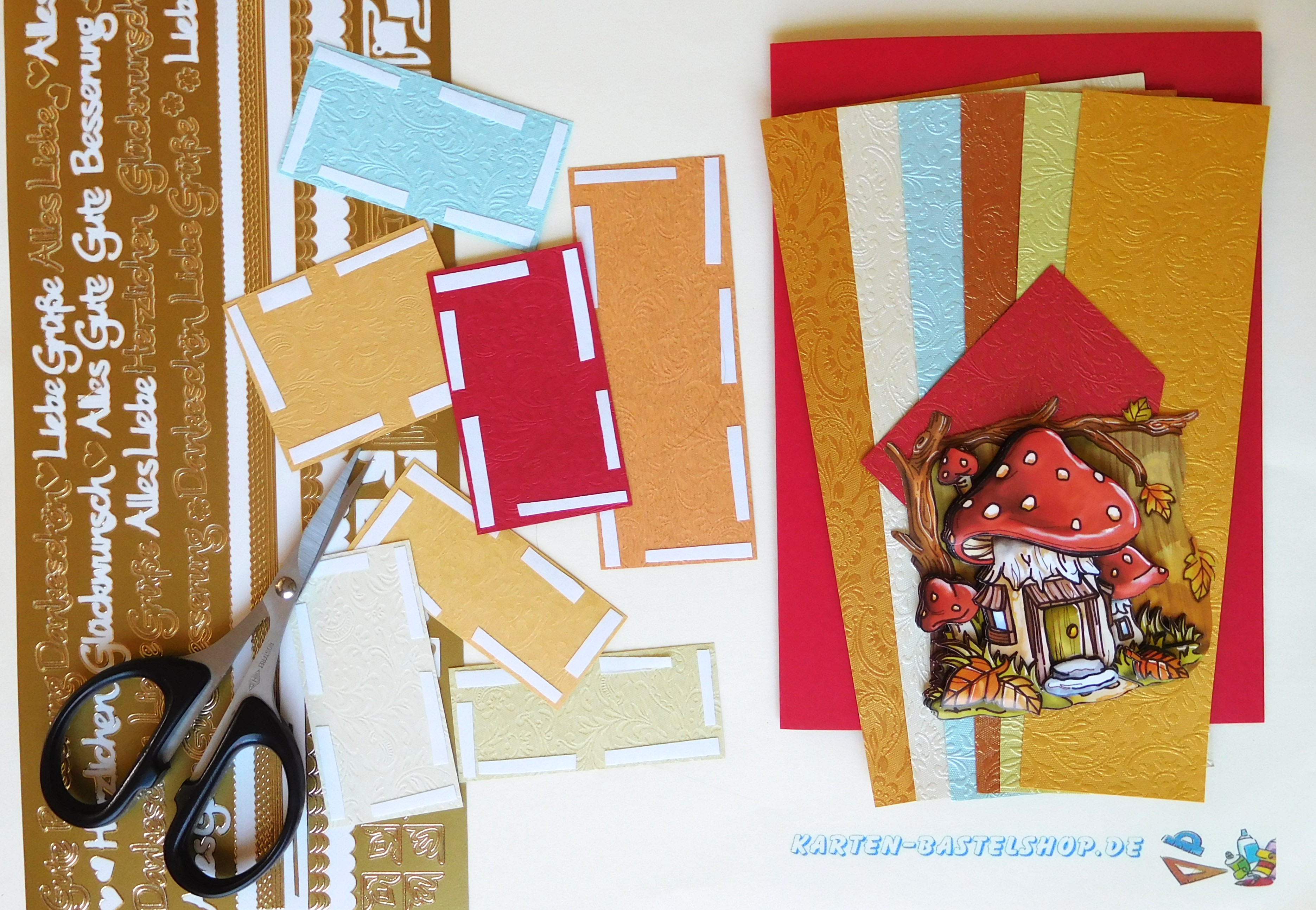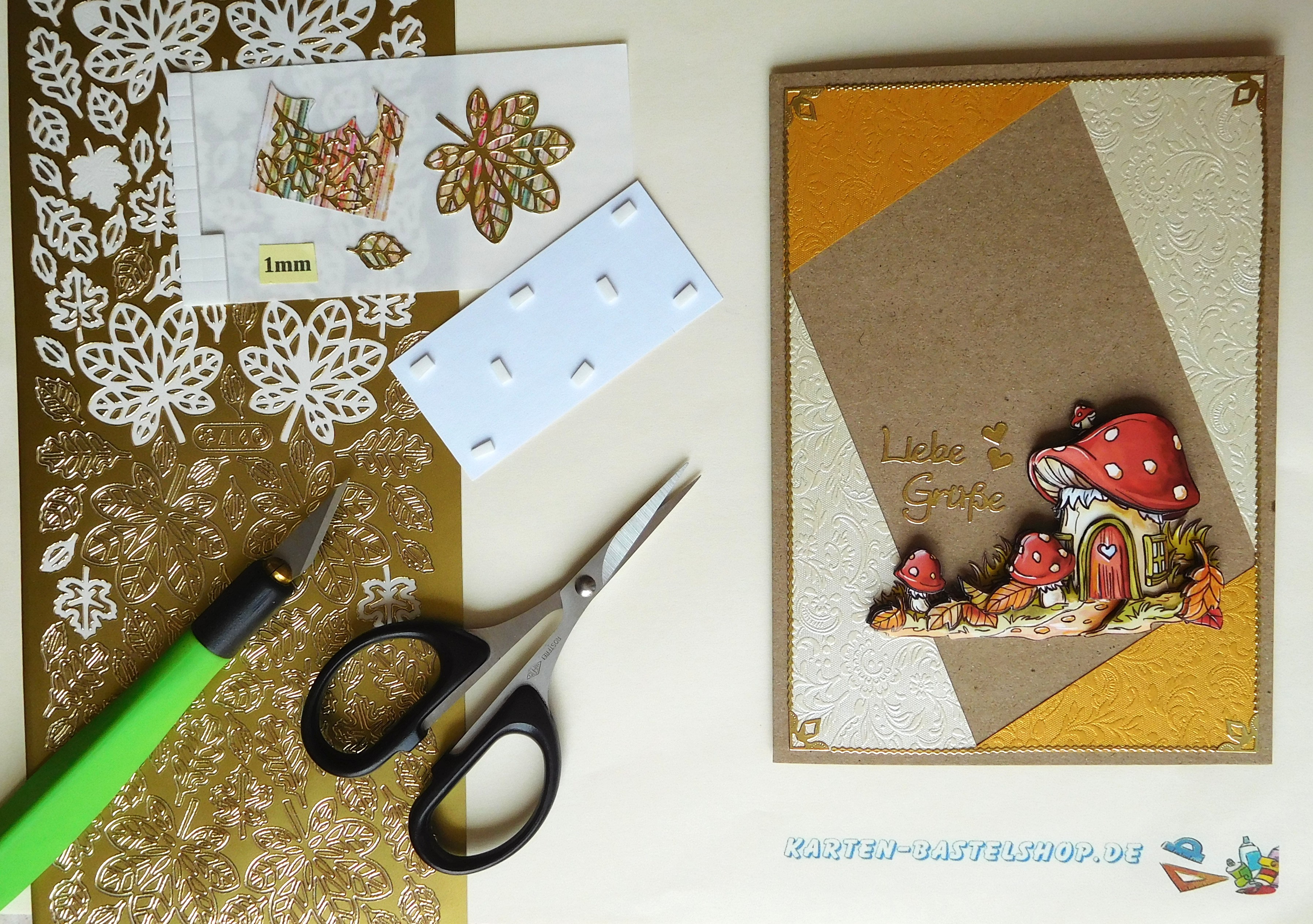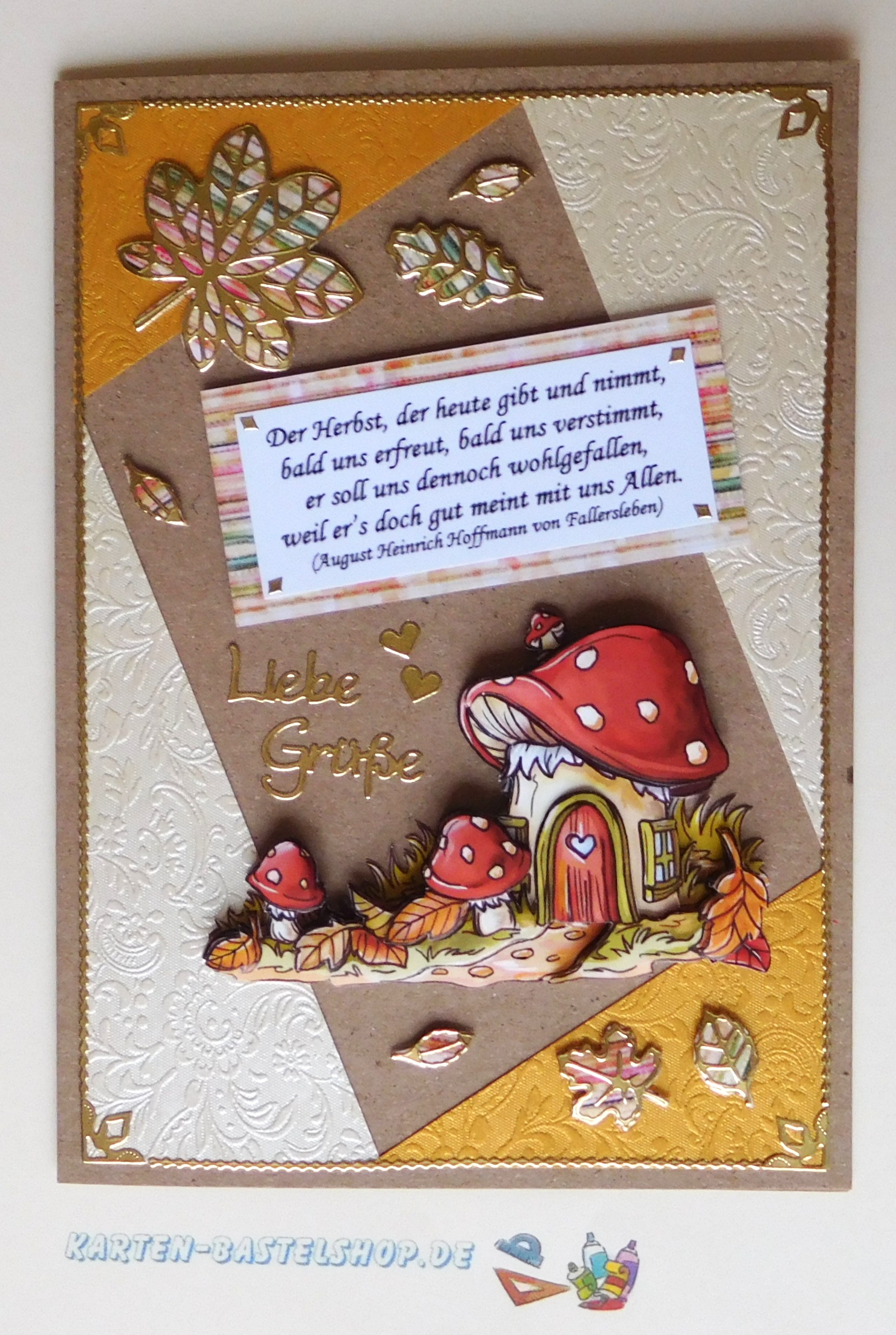 Das 3D-Motiv mit dem Pilzhaus wird im unteren Bereich der Karte platziert. Direkt daneben bringt ihr den Gruß „Liebe Grüße“ an, den ihr entlang des elfenbeinfarbenen Papierrands untereinander klebt, ergänzt durch zwei kleine Herzen. Der vorbereitete Spruch wird leicht schräg über Motiv und Gruß gesetzt, dabei sorgen 1 mm Klebepads für eine plastische Wirkung. Zum Abschluss verteilt ihr das hinterklebte Herbstlaub auf den freien Flächen oberhalb und unterhalb sowie auf den goldenen Dreiecken. So entsteht ein stimmiges, detailreiches Bild, das den Zauber des Herbstes liebevoll einfängt.