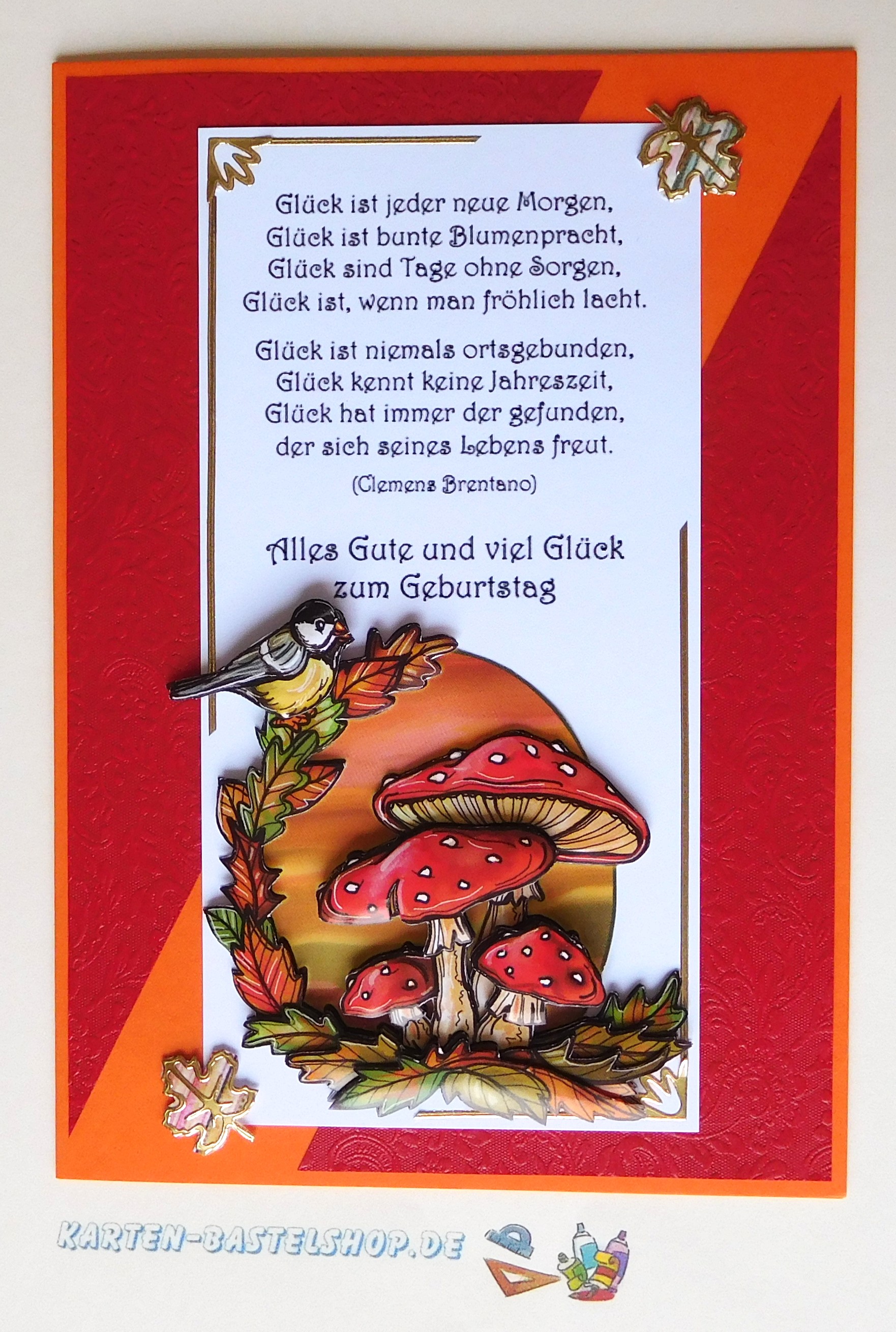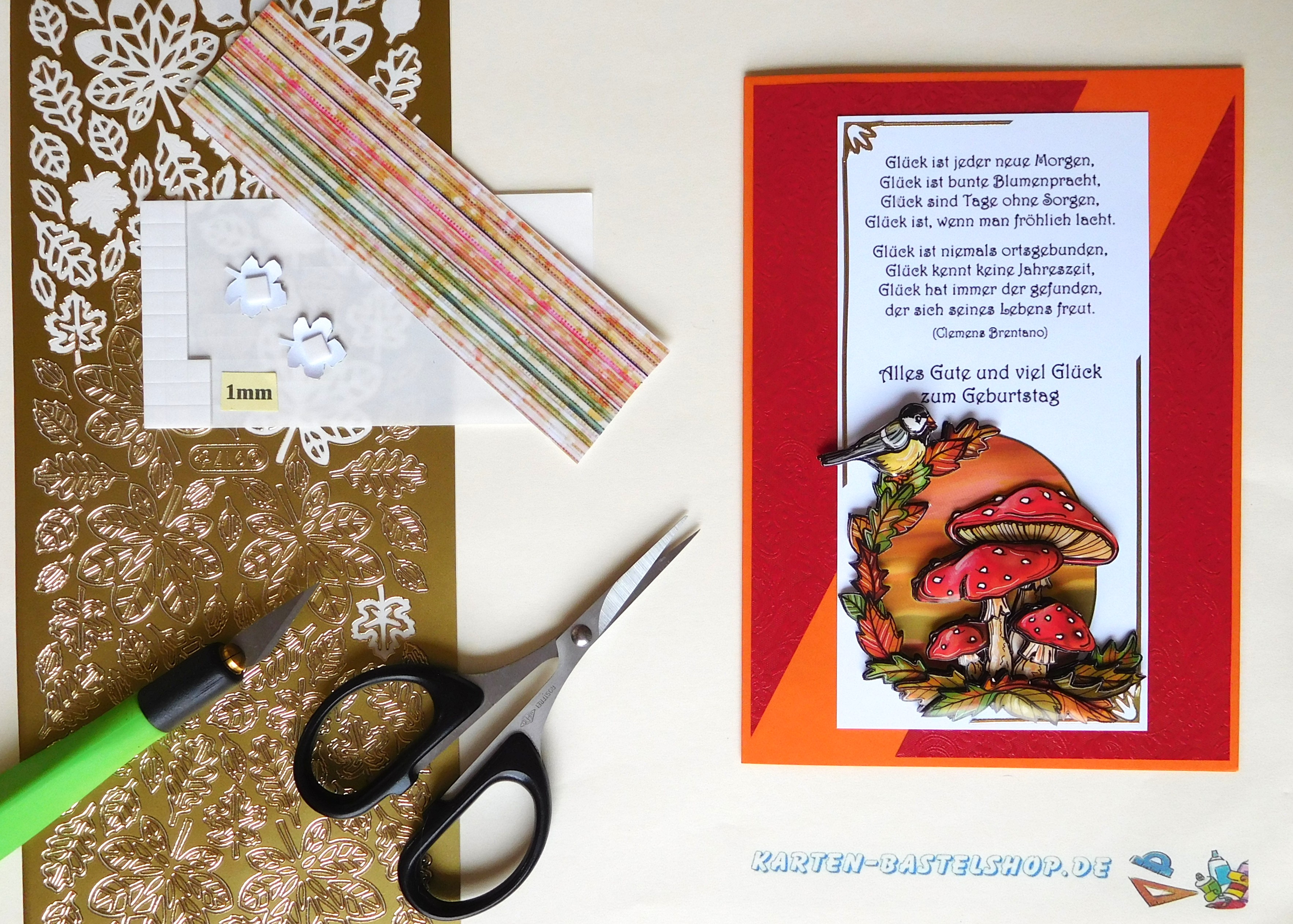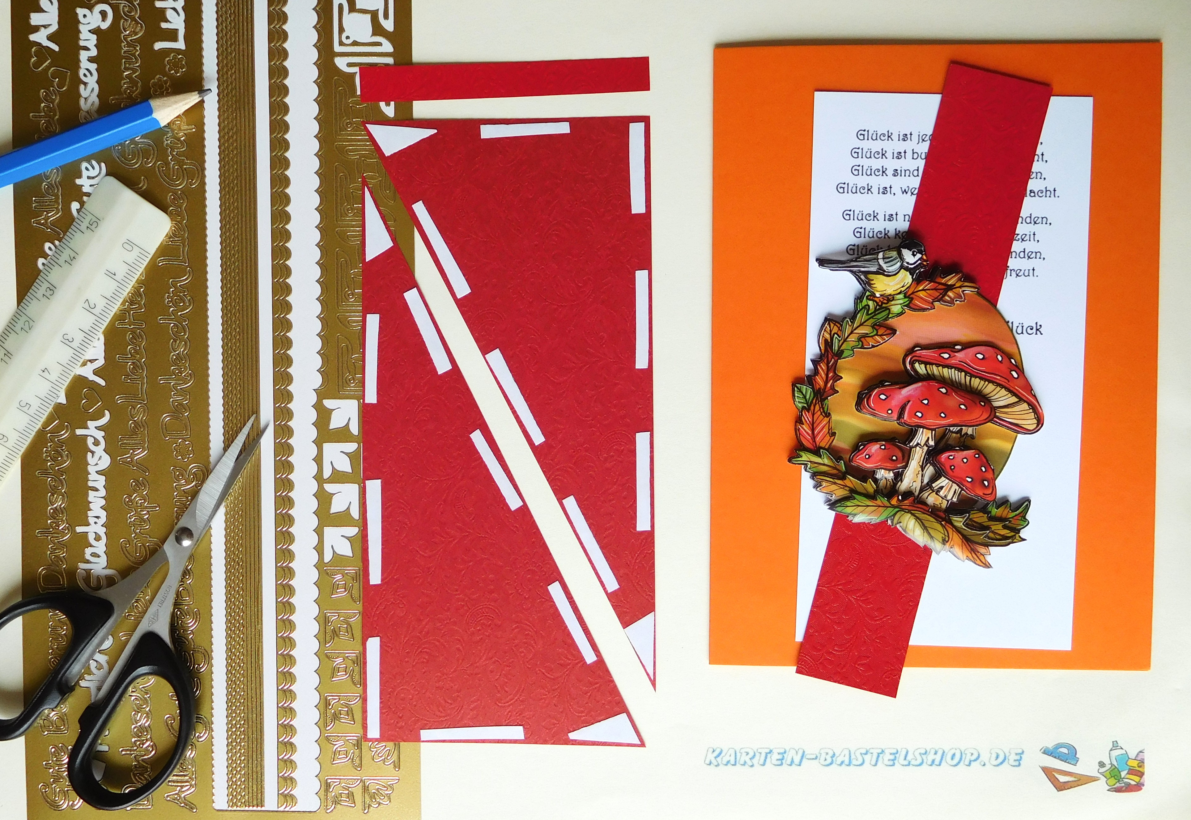 Das 3D-Motiv mit dem Pilzhaus wird im unteren Bereich der Karte platziert. Direkt daneben bringt ihr den Gruß „Liebe Grüße“ an, den ihr entlang des elfenbeinfarbenen Papierrands untereinander klebt, ergänzt durch zwei kleine Herzen. Der vorbereitete Spruch wird leicht schräg über Motiv und Gruß gesetzt, dabei sorgen 1 mm Klebepads für eine plastische Wirkung. Zum Abschluss verteilt ihr das hinterklebte Herbstlaub auf den freien Flächen oberhalb und unterhalb sowie auf den goldenen Dreiecken. So entsteht ein stimmiges, detailreiches Bild, das den Zauber des Herbstes liebevoll einfängt.