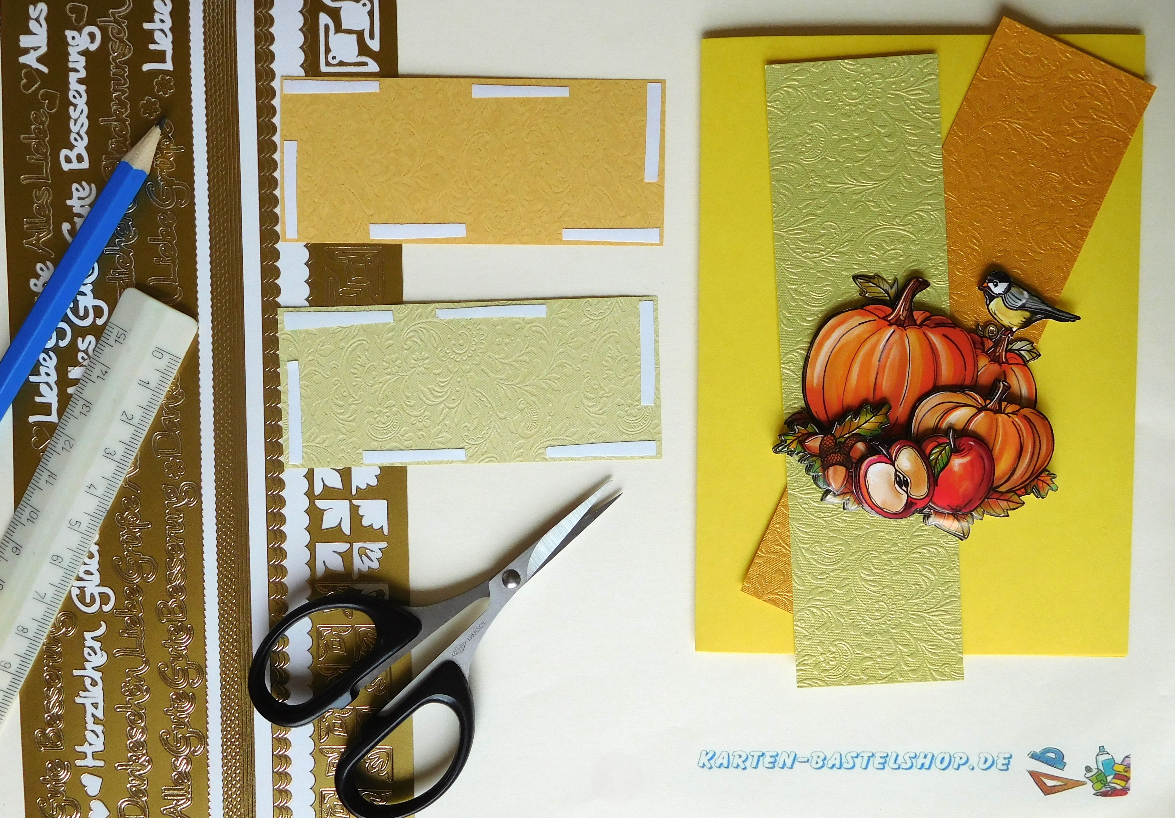 Für die Basis schneidet ihr vom goldenen und hellgrünen Bastelpapier jeweils ein Rechteck von 4 × 9,3 cm aus. Alternativ könnt ihr auch Reststücke aus früheren Karten nutzen – so spart ihr Material und bleibt nachhaltig. Der hellgrüne Streifen wird in die linke untere Ecke geklebt, der goldene gegenüber in die rechte obere Ecke. Achtet darauf, dass die Papiere sauber ausgerichtet sind. In die äußeren Ecken dieser beiden Felder setzt ihr je einen großen Ecksticker, der die Flächen edel betont. Mittig über die beiden Papierstreifen klebt ihr dann das 3D-Bild mit dem Vogel und dem Kürbis, sodass es beide Farben harmonisch verbindet.