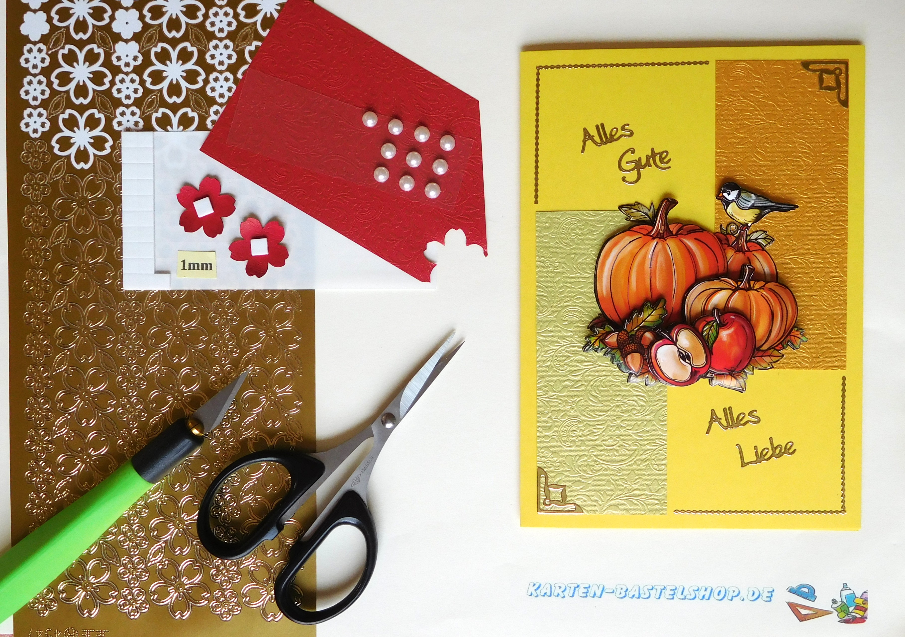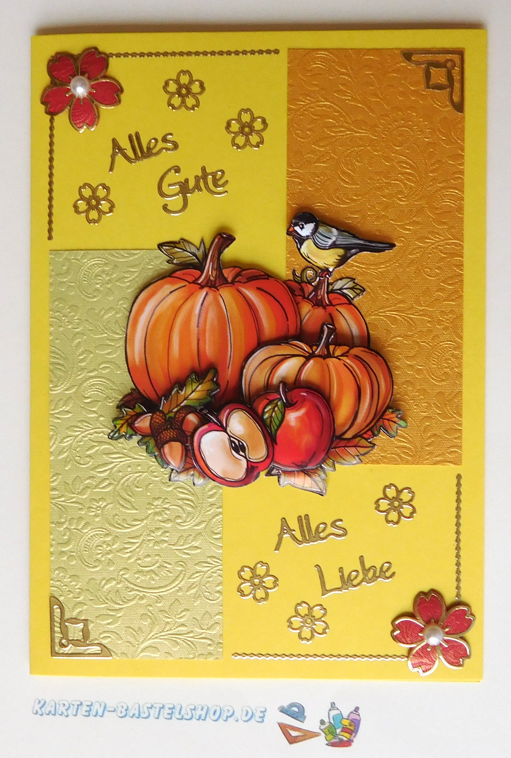 Diese gelbe Karte strahlt pure Herbstfreude aus und wird durch ein zauberhaftes 3D-Motiv mit Vogel auf einem Kürbis zum Mittelpunkt jeder Bastelrunde. Das Motiv vermittelt sofort Wärme und Gemütlichkeit und harmoniert wunderbar mit den leuchtenden Farben der Saison. Verwendet wird goldenes, hellgrünes und rot-goldenes „Ornament“-Bastelpapier, dazu goldene Sticker aus den Serien „Gute Besserung“ und „Kirschblüte“ sowie edle weiße Halbperlen, die für funkelnde Akzente sorgen.