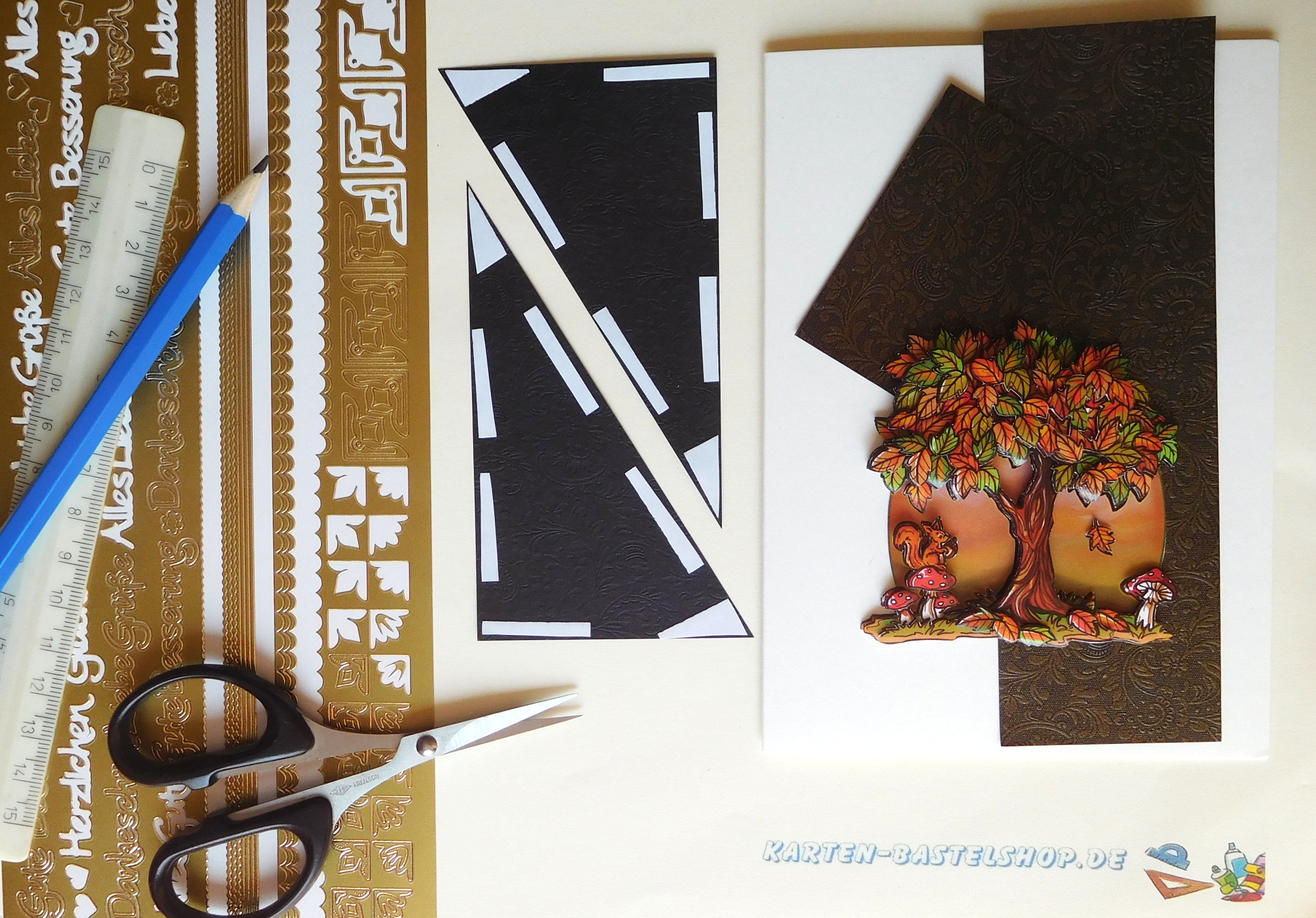 Das 3D-Bild des Herbstbaums platziert ihr mittig mit etwa 2 cm Abstand zum unteren Kartenrand. Mit doppelseitigem Klebeband wird der Gruß leicht schräg über das Motiv gesetzt – so wirkt die Karte lebendiger, ohne ihre ruhige Wirkung zu verlieren. Zum Abschluss dekoriert ihr die Ecken: Drei kleine Blätter werden übereinander in die rechte untere Ecke geklebt, drei weitere Blätter übereinander links oben. So rundet ihr die Karte harmonisch ab und schenkt ihr eine feine, aber würdige Detailgestaltung.
