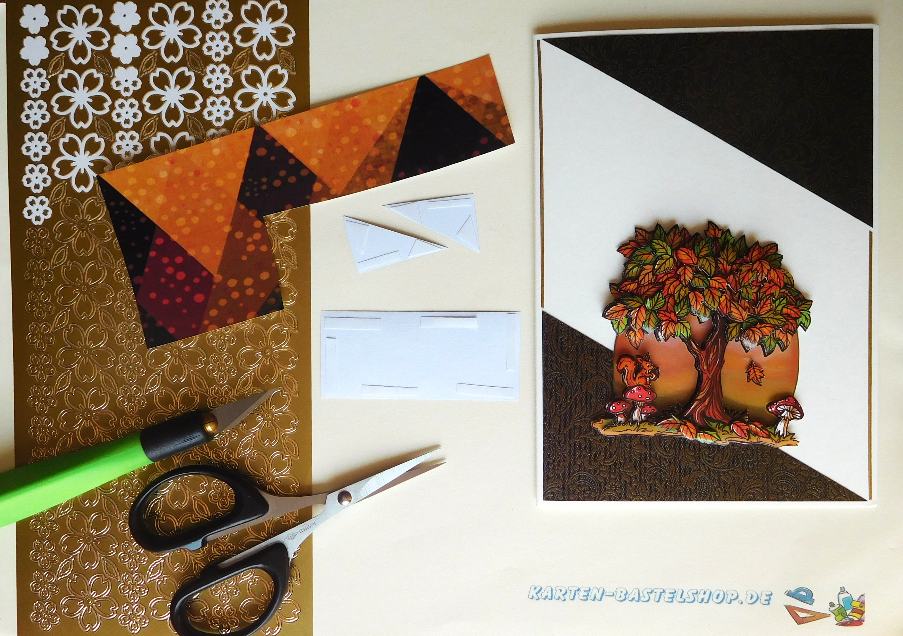 Das 3D-Motiv mit dem Eichhörnchen klebt ihr mittig auf die vorbereiteten Dreiecke. Den goldenen Gruß „Herzlichen Glückwunsch“ bringt ihr leicht gebogen an, sodass das Wort „Herzlichen“ links oben an der Dreieckskante und das Wort „Glückwunsch“ rechts unten entlangläuft. So entsteht ein eleganter Schwung, der das Motiv umrahmt. Nun schneidet ihr vom gelb-orangen Hintergrundstreifen vier Blätterpaare aus: Zwei Blätter werden jeweils zusammen auf den Streifen geklebt und an der Kontur ausgeschnitten. Mit 1 mm Klebepads setzt ihr die Paare in die freien Ecken der Karte und ergänzt jeweils ein weiteres Blatt.