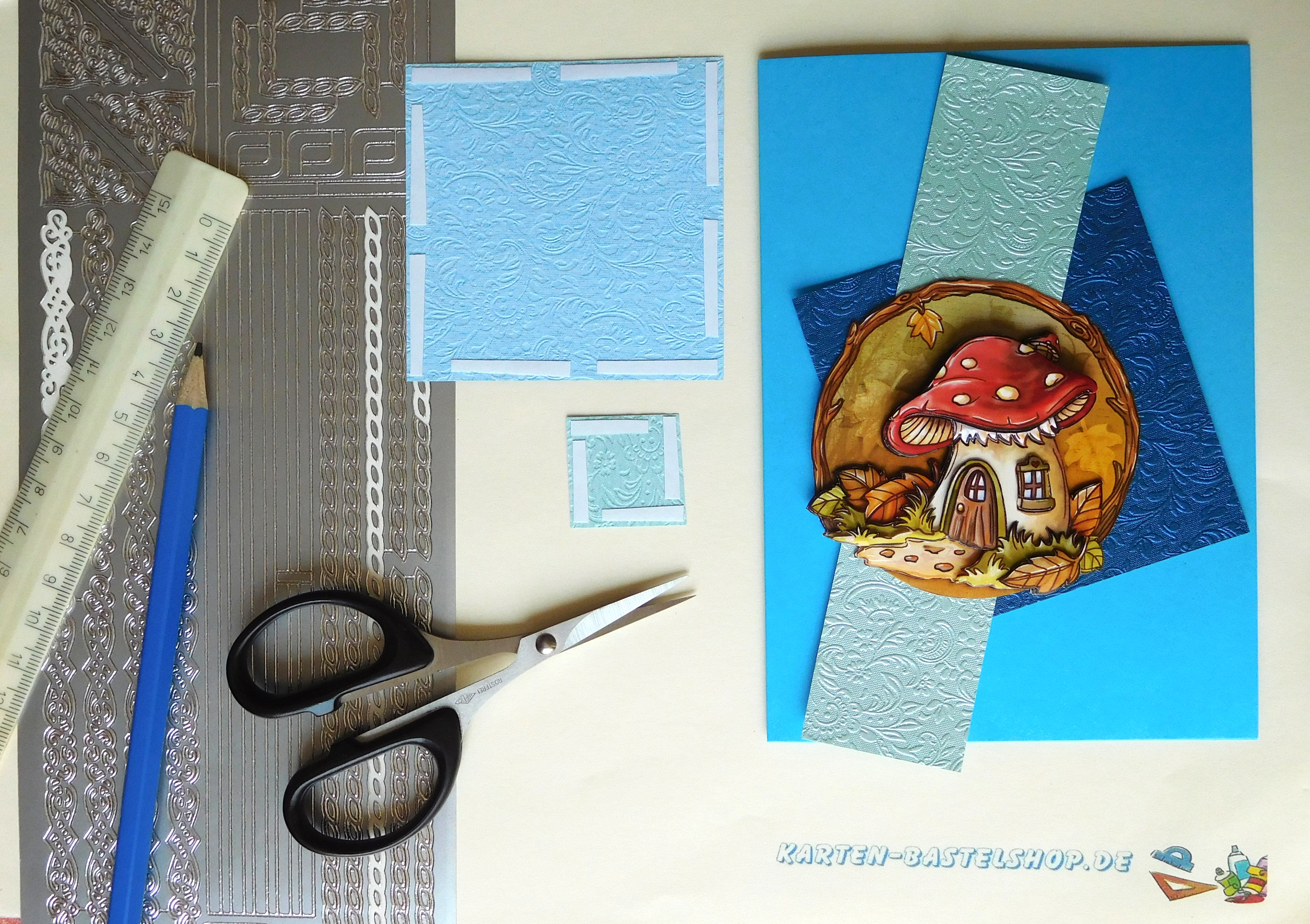 Als Nächstes wird das große dunkelblaue Quadrat mittig auf die Karte gesetzt, sodass die Papierecken exakt auf den Randstickern aufliegen. Über die obere Ecke des Quadrats klebt ihr den Haussegen leicht schräg, was der Gestaltung eine lockere Note verleiht. Nun ist es Zeit für das Highlight: Das 3D-Bild mit dem Pilzhaus wird mittig auf das dunkelblaue Quadrat geklebt, wo es durch die kontrastreichen Farben besonders gut zur Geltung kommt. Zum Abschluss verteilt ihr noch kleine Innenteile der Schnörkel-Bordüre auf der freien Kartenfläche – so setzt ihr dezente, verspielte Akzente, die das Bild harmonisch abrunden.