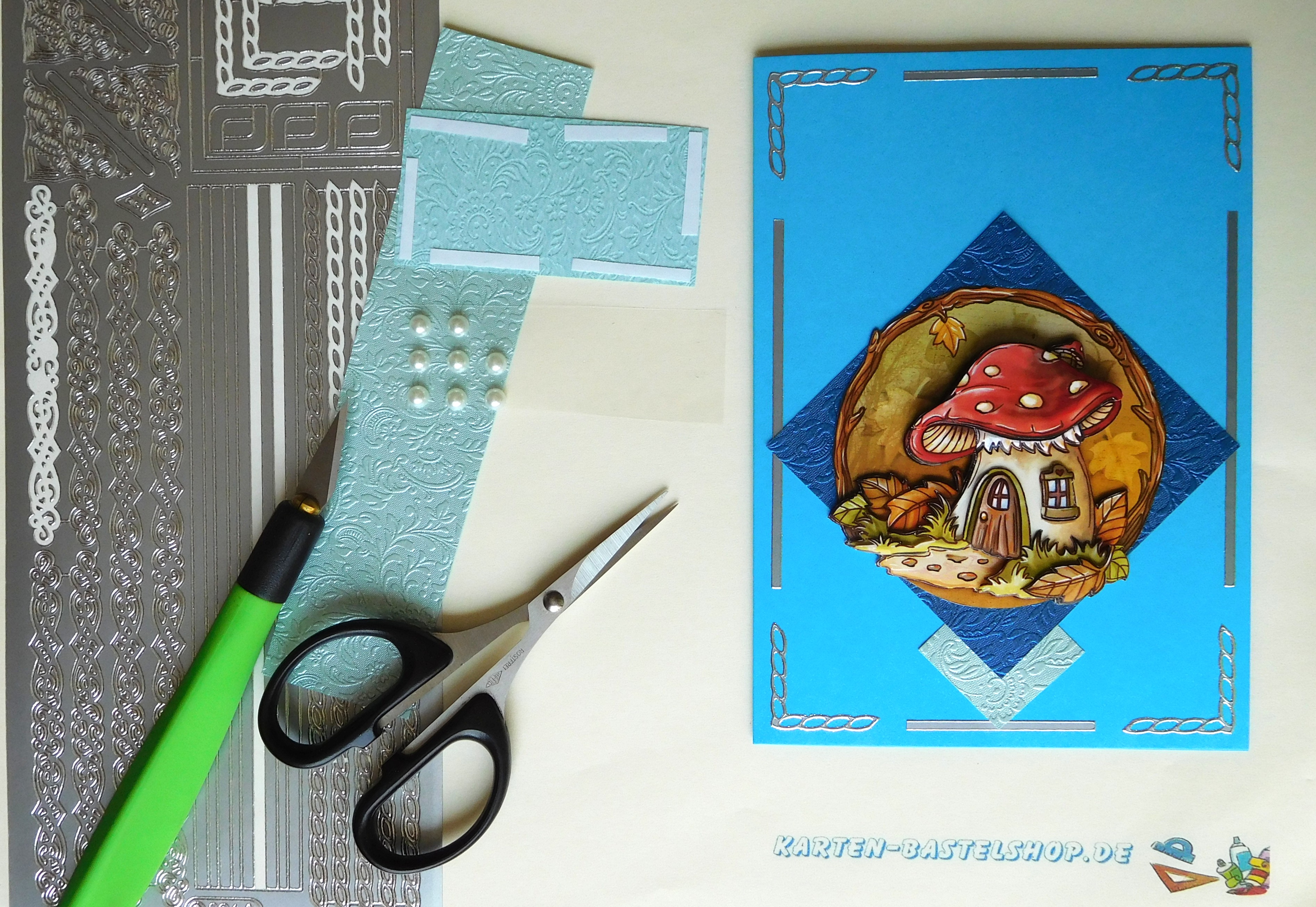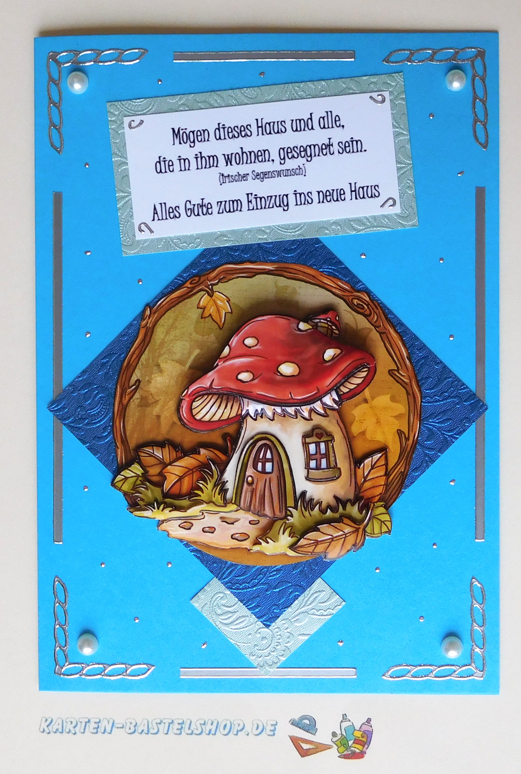 Diese blaue Karte bringt mit ihrem verspielten Pilzhaus-Motiv eine märchenhafte Note in eure Herbstkollektion. Der besondere Hingucker ist die runde Astumrandung um das 3D-Bild, die durch den Einsatz von hell- und dunkelblauem „Ornament“-Bastelpapier sowie silbernen Stickern wunderschön betont wird. Ergänzt wird die Gestaltung durch weiße Halbperlen und einen Gruß in Form eines kleinen irischen Haussegens. So verbindet die Karte liebevolle Details mit einem harmonischen Gesamtbild, das sowohl freundlich als auch elegant wirkt.
