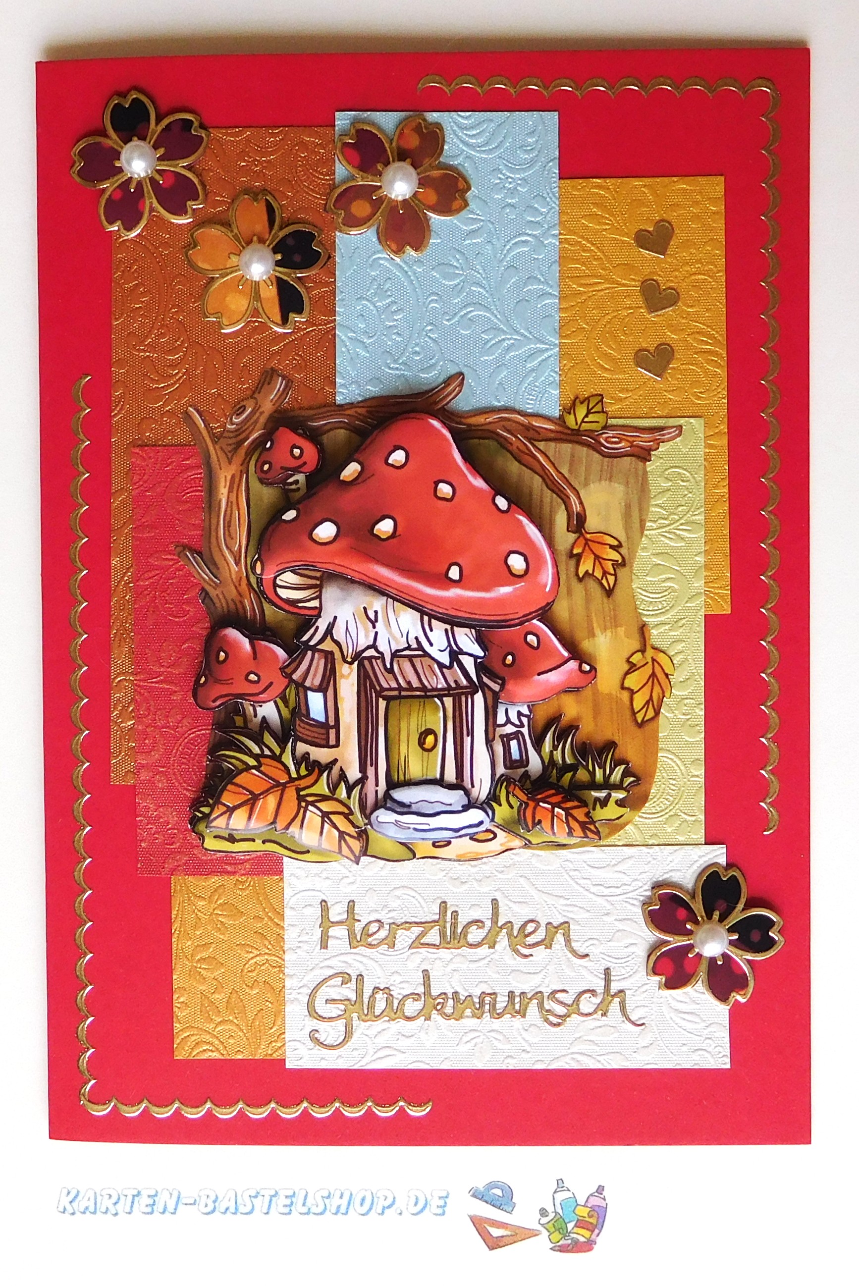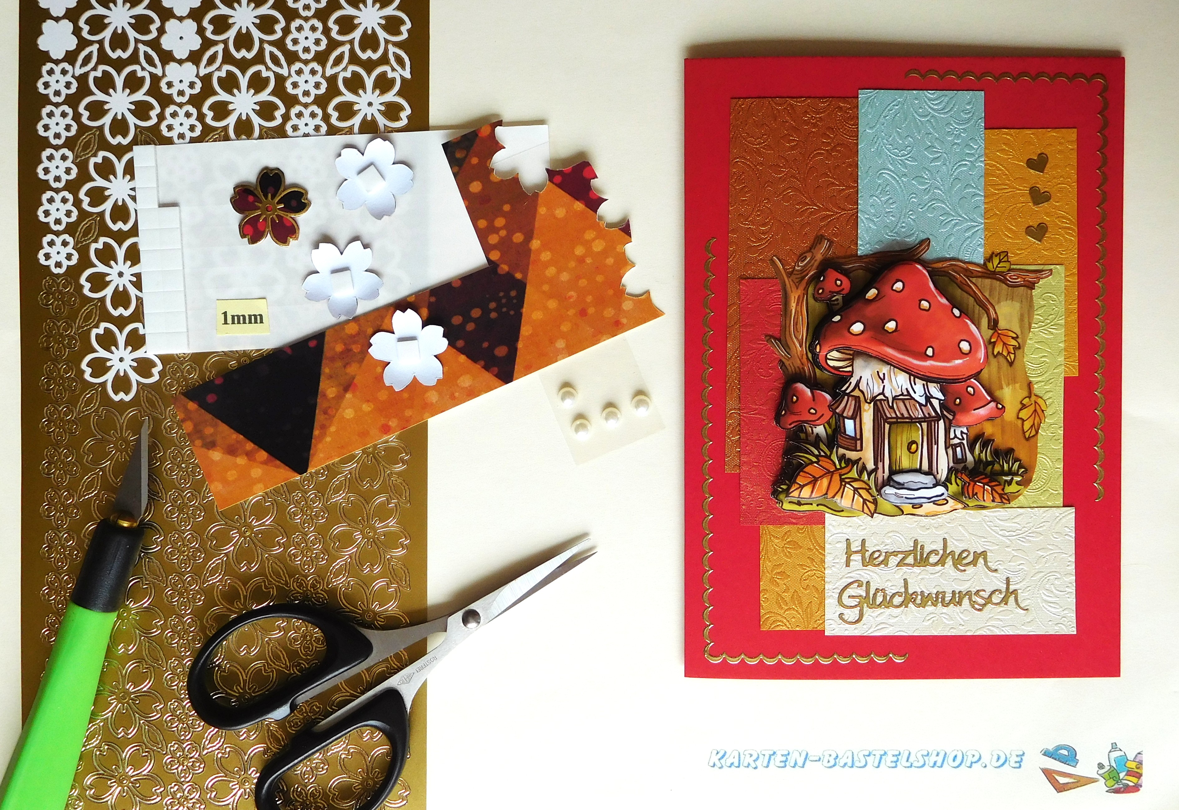 Das Pilzhaus-Motiv wird nun mittig aufgesetzt und bildet den Blickfang der Karte. Den Gruß „Herzlichen Glückwunsch“ klebt ihr in zwei Zeilen auf das elfenbeinfarbene Feld unten rechts. Drei kleine Herzen werden dekorativ rechts daneben gesetzt, sodass ein harmonischer Abschluss entsteht.