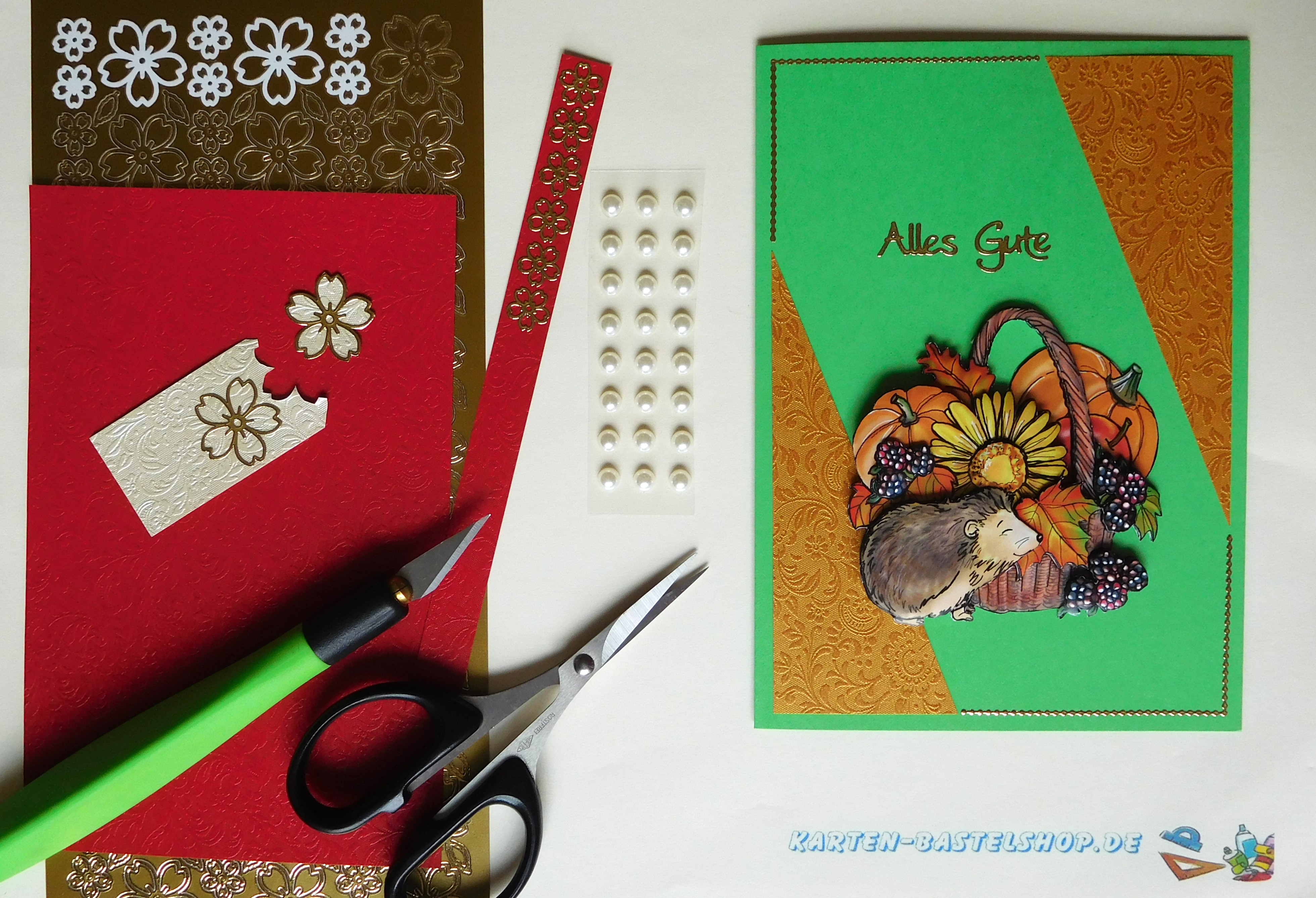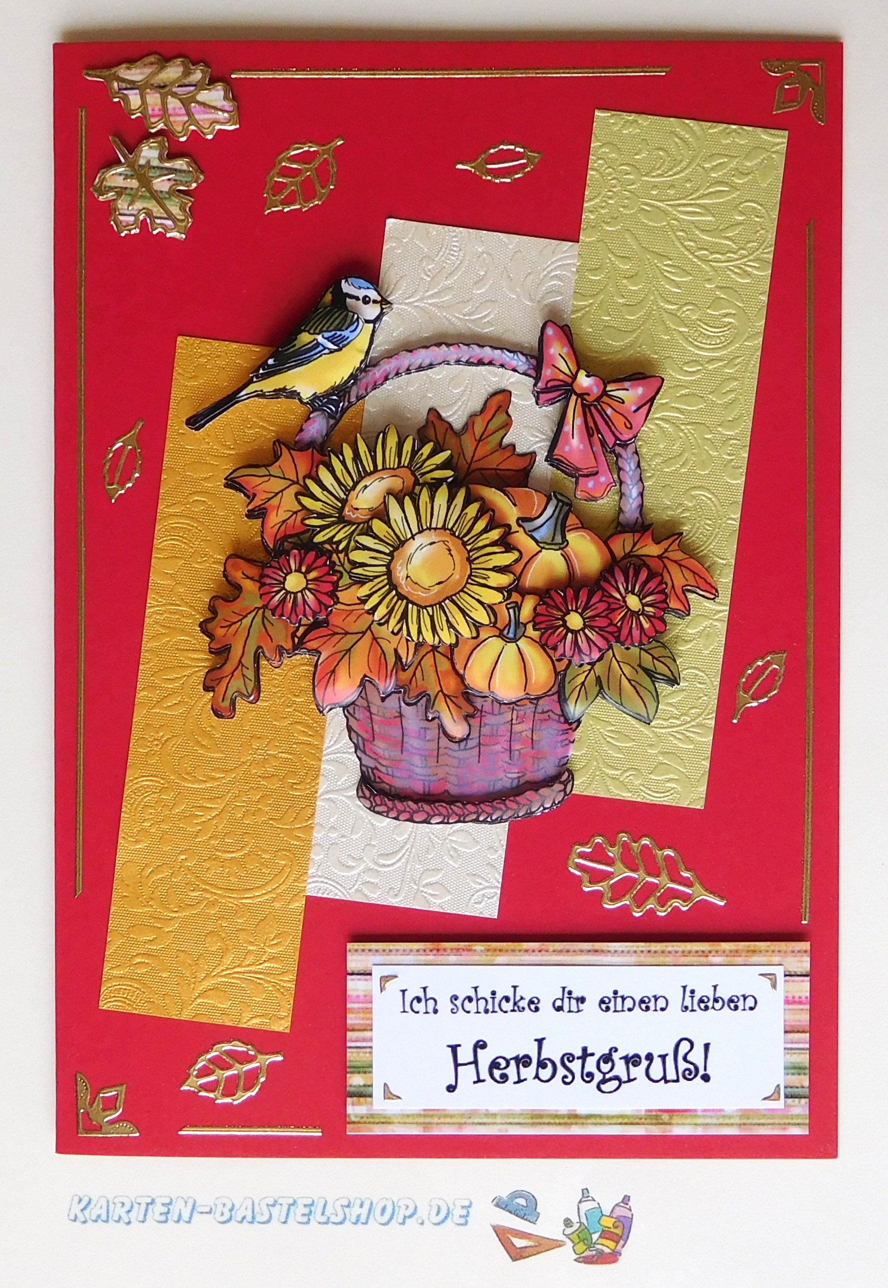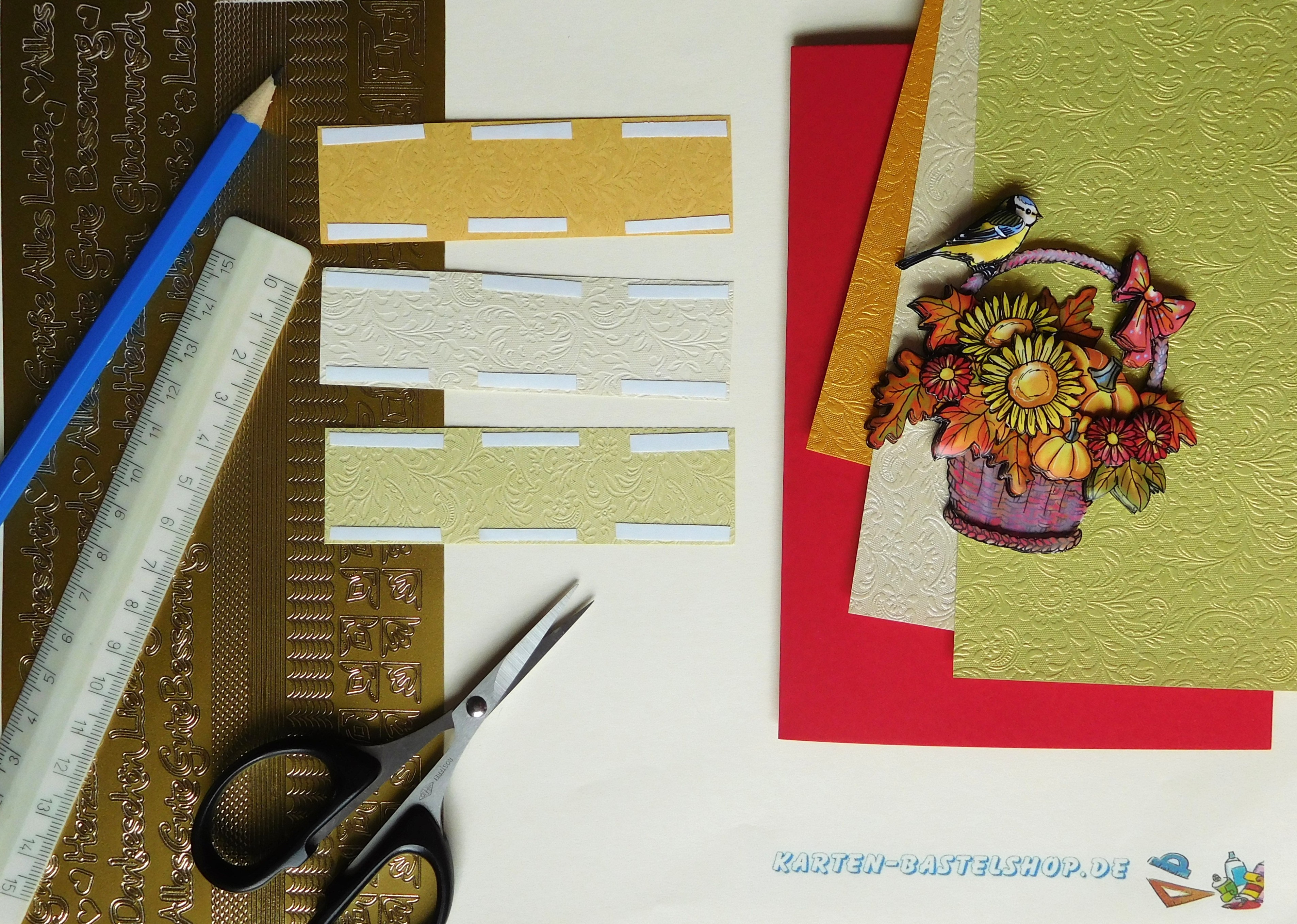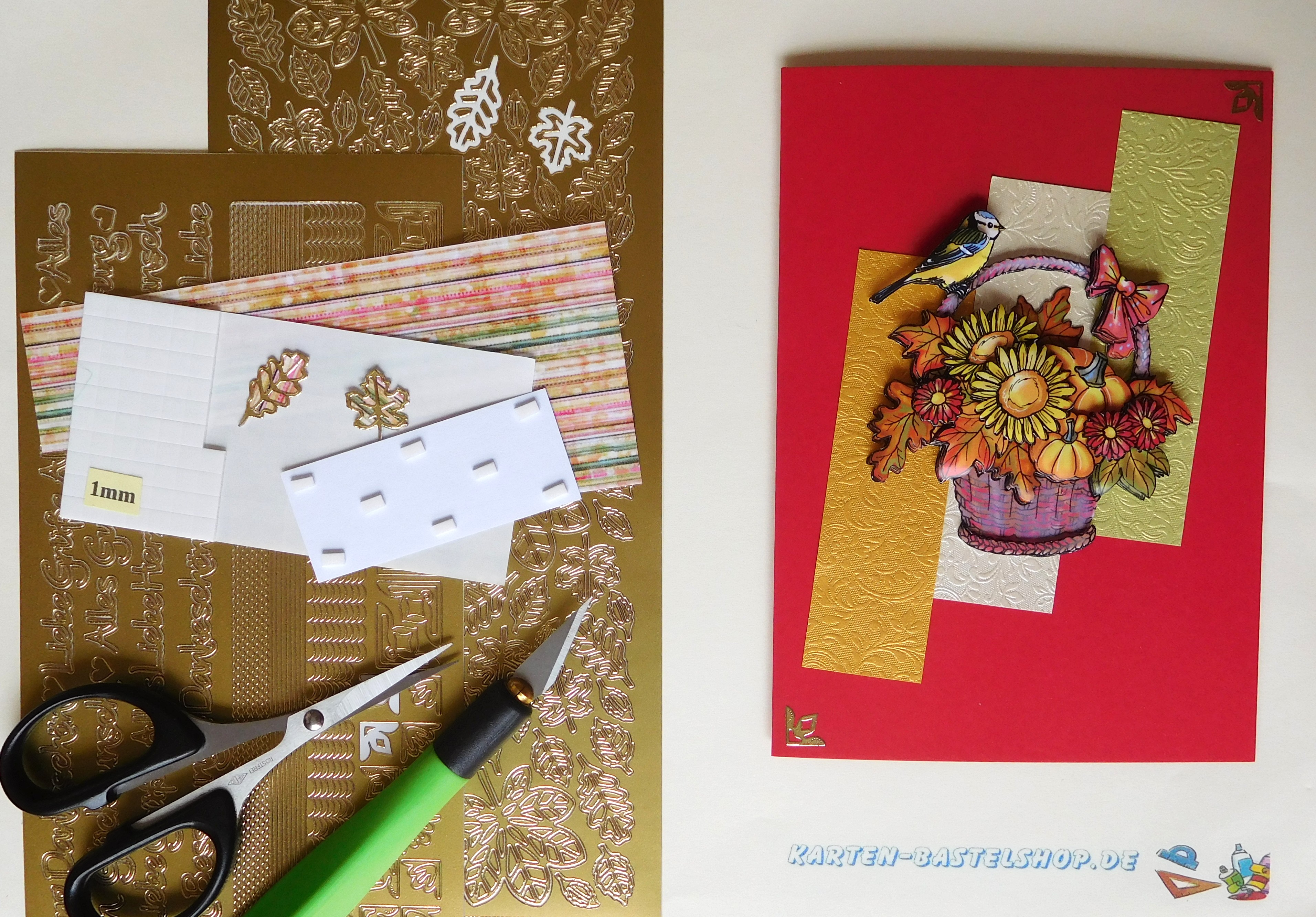 Karte 1 – Herbstgruß mit VogelFür diese Karte nehmt ihr eine leuchtend rote A6-Klappkarte. Sie bildet den farbenfrohen Hintergrund für das 3D-Motiv mit einem liebevoll gestalteten Korb und einem kleinen Vogel. Damit die Karte harmonisch wirkt, werden drei Streifen aus Bastelpapier vorbereitet: in Hellgrün, Elfenbein und Gold.