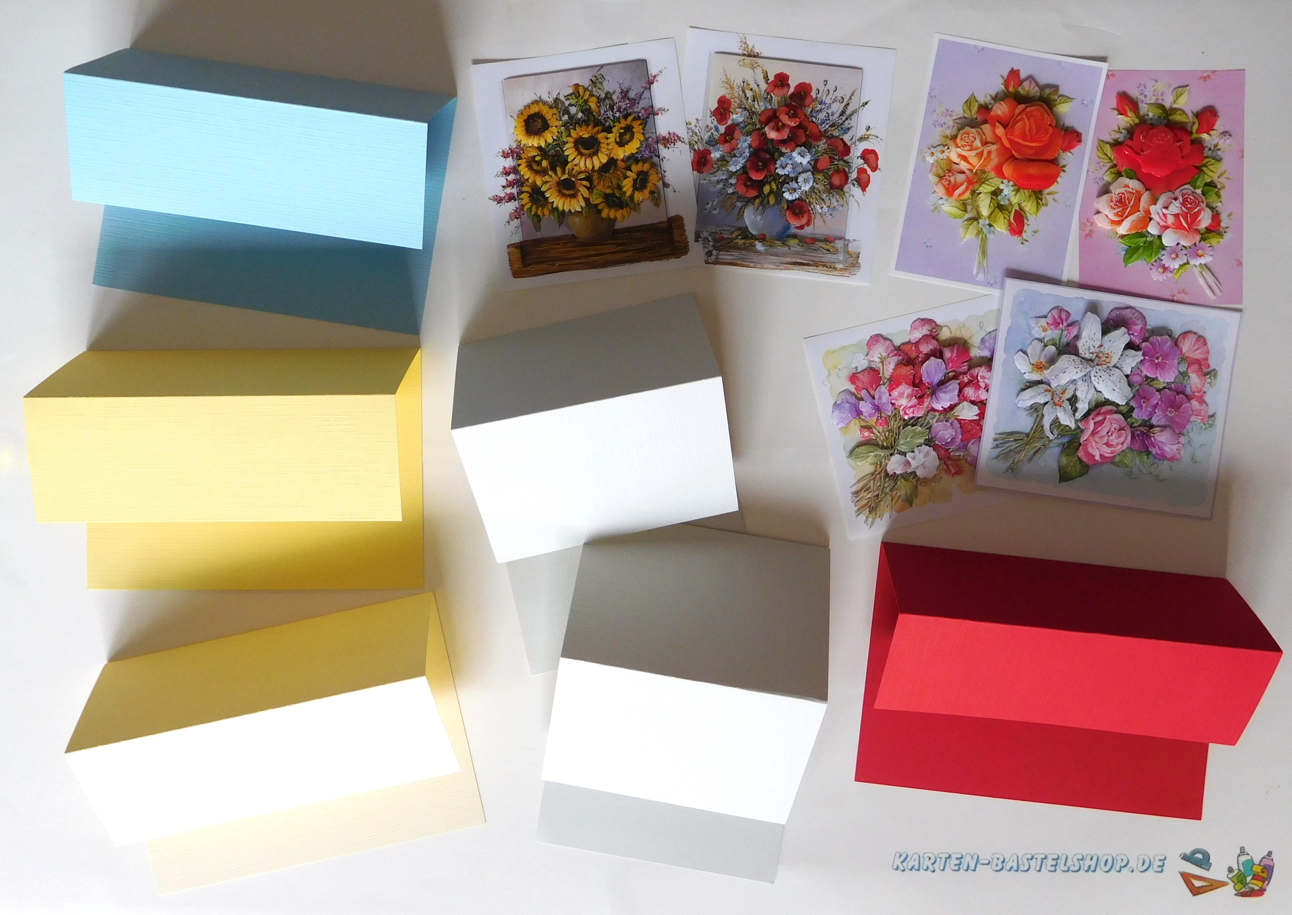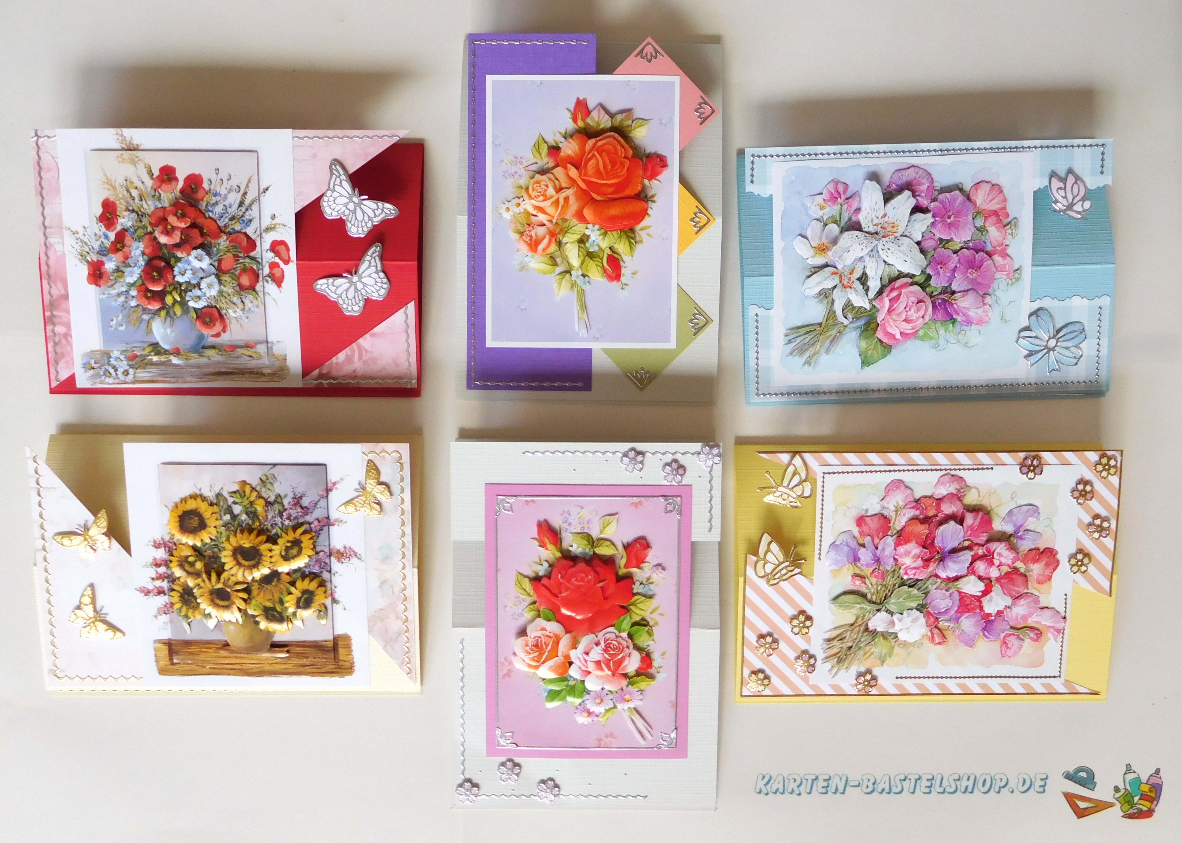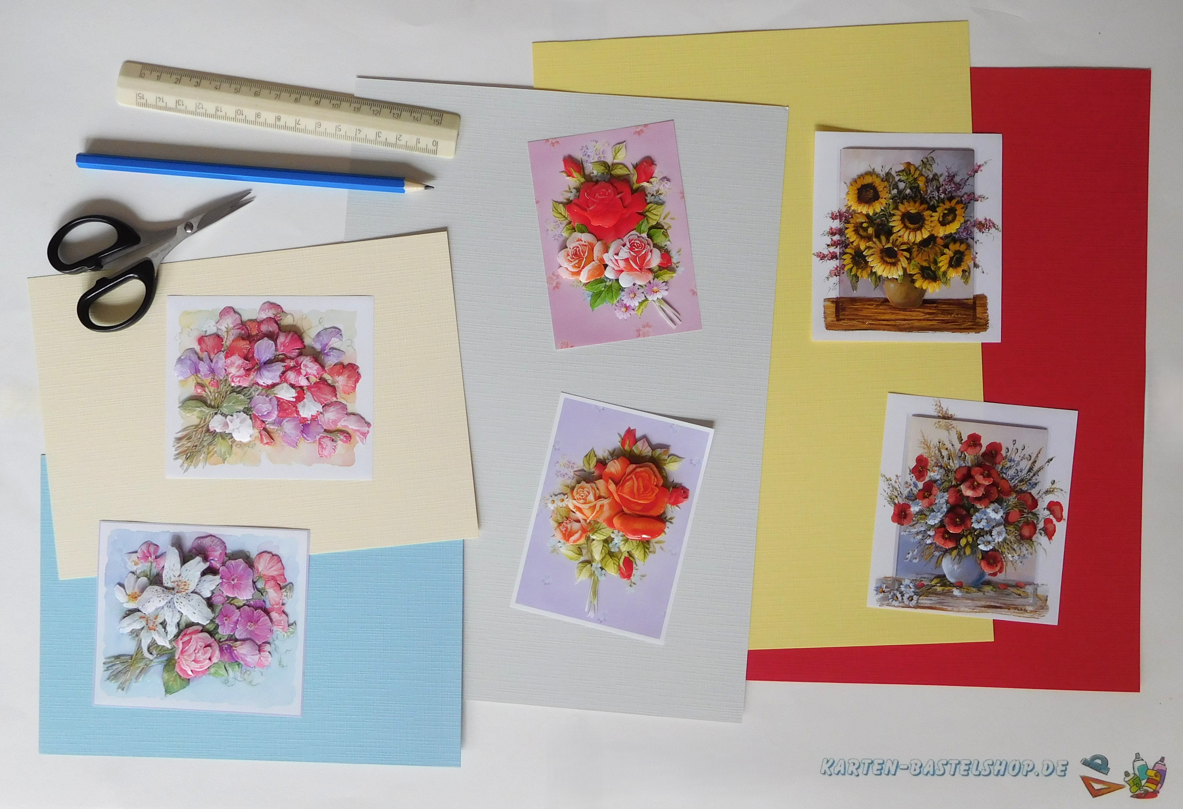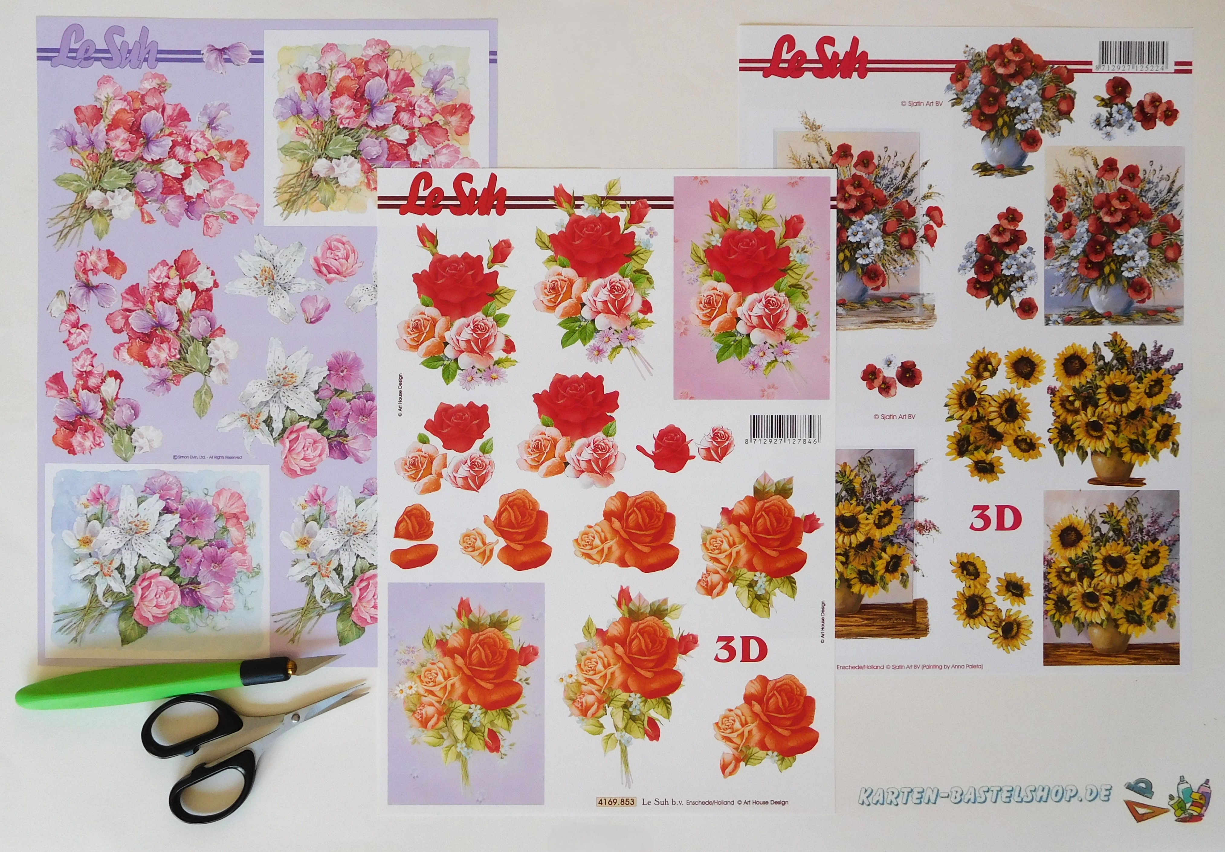 Für unsere Aufstellkarten haben wir eine bunte Auswahl an Materialien zusammengestellt, mit denen ihr gleich mehrere Varianten gestalten könnt. Im Mittelpunkt stehen drei wunderschöne 3D-Bögen von LeSuh: der „Blumenstrauß“ (Nr. 4169.448), die „Mohn- und Sonnenblumen“ (Nr. 4169.775) und die romantischen „Rosen“ (Nr. 4169.853). Damit habt ihr große Motive zur Hand, die sich hervorragend als Blickfang für die Vorderseite eignen und sofort für gute Laune sorgen.