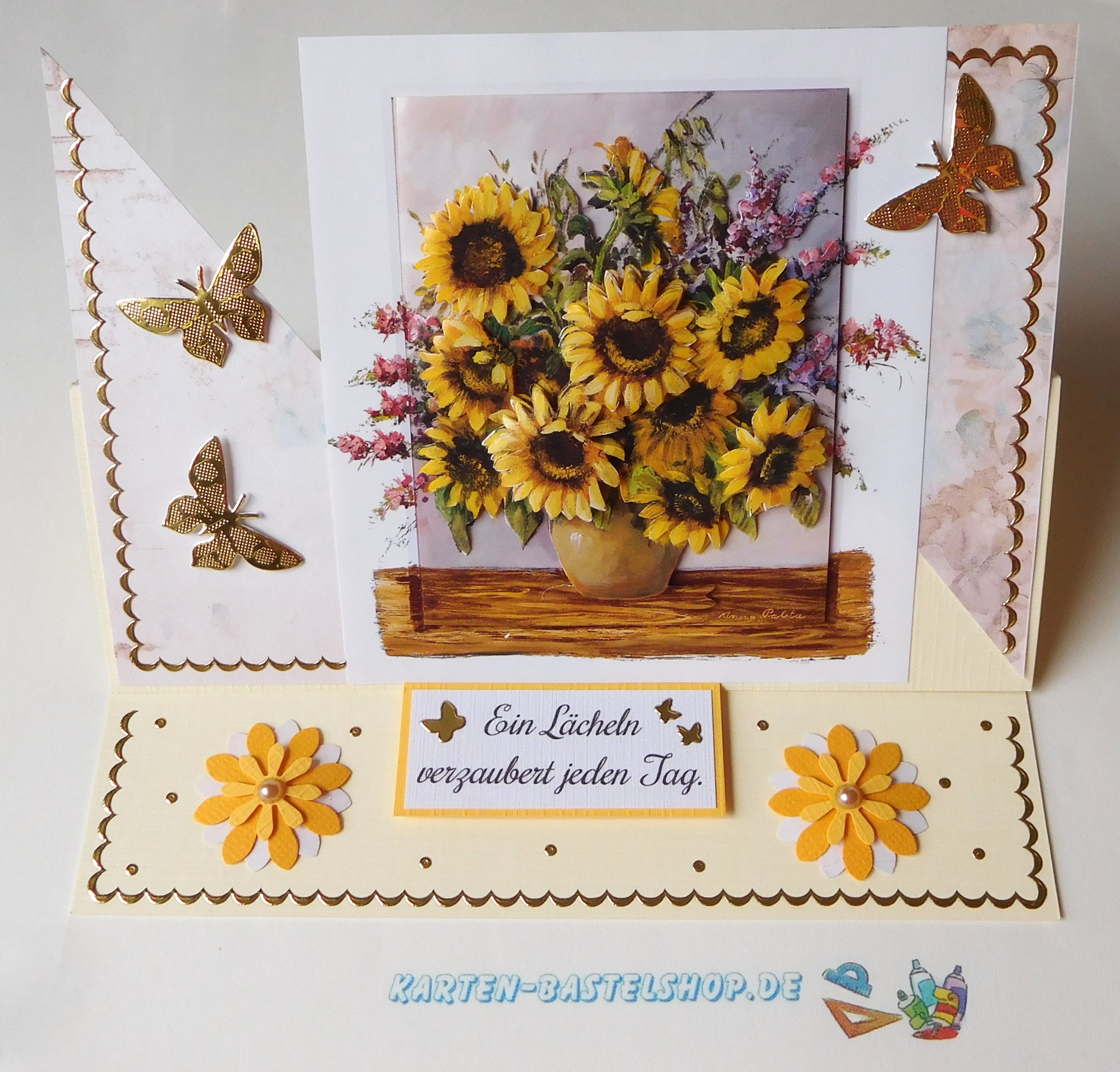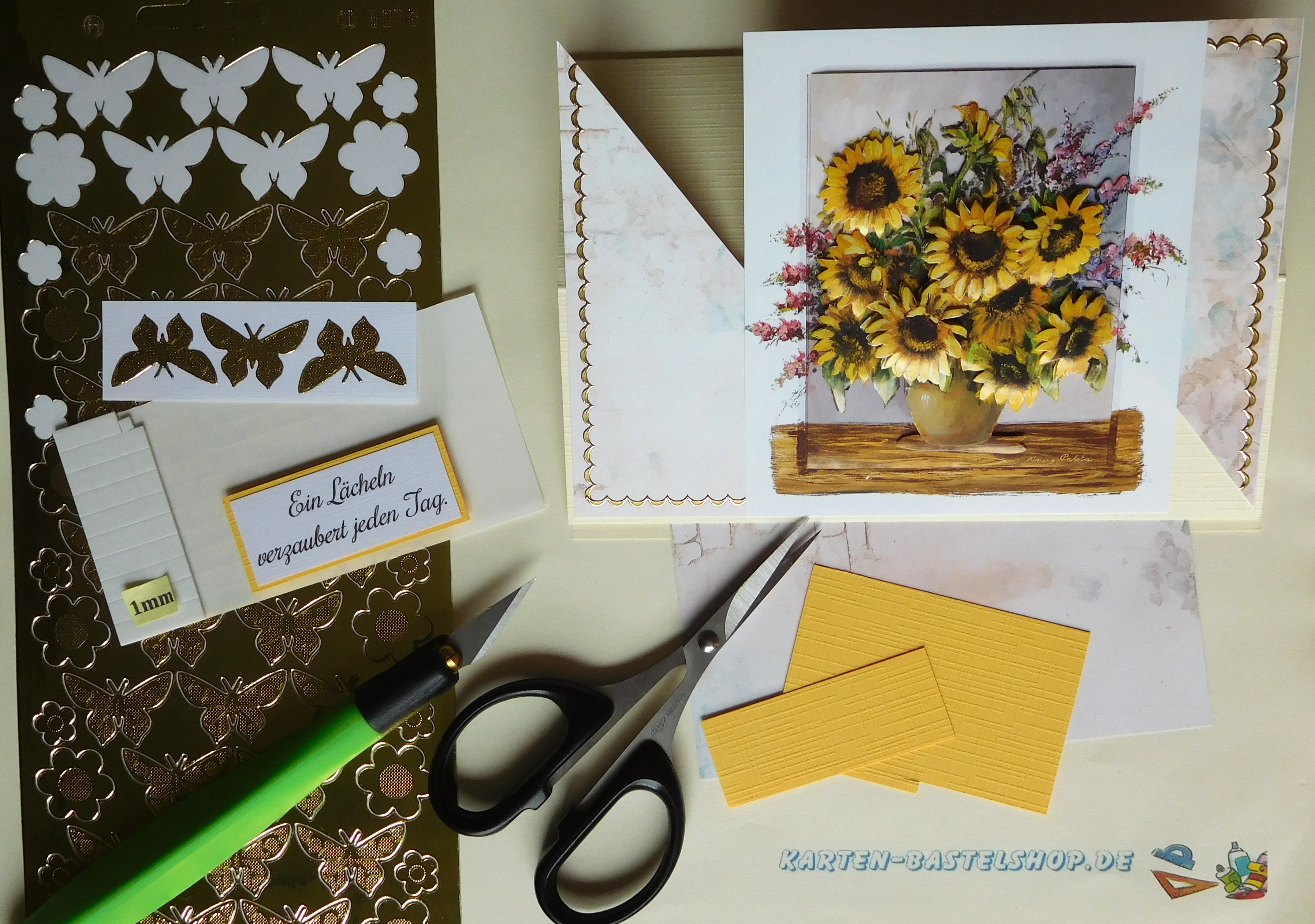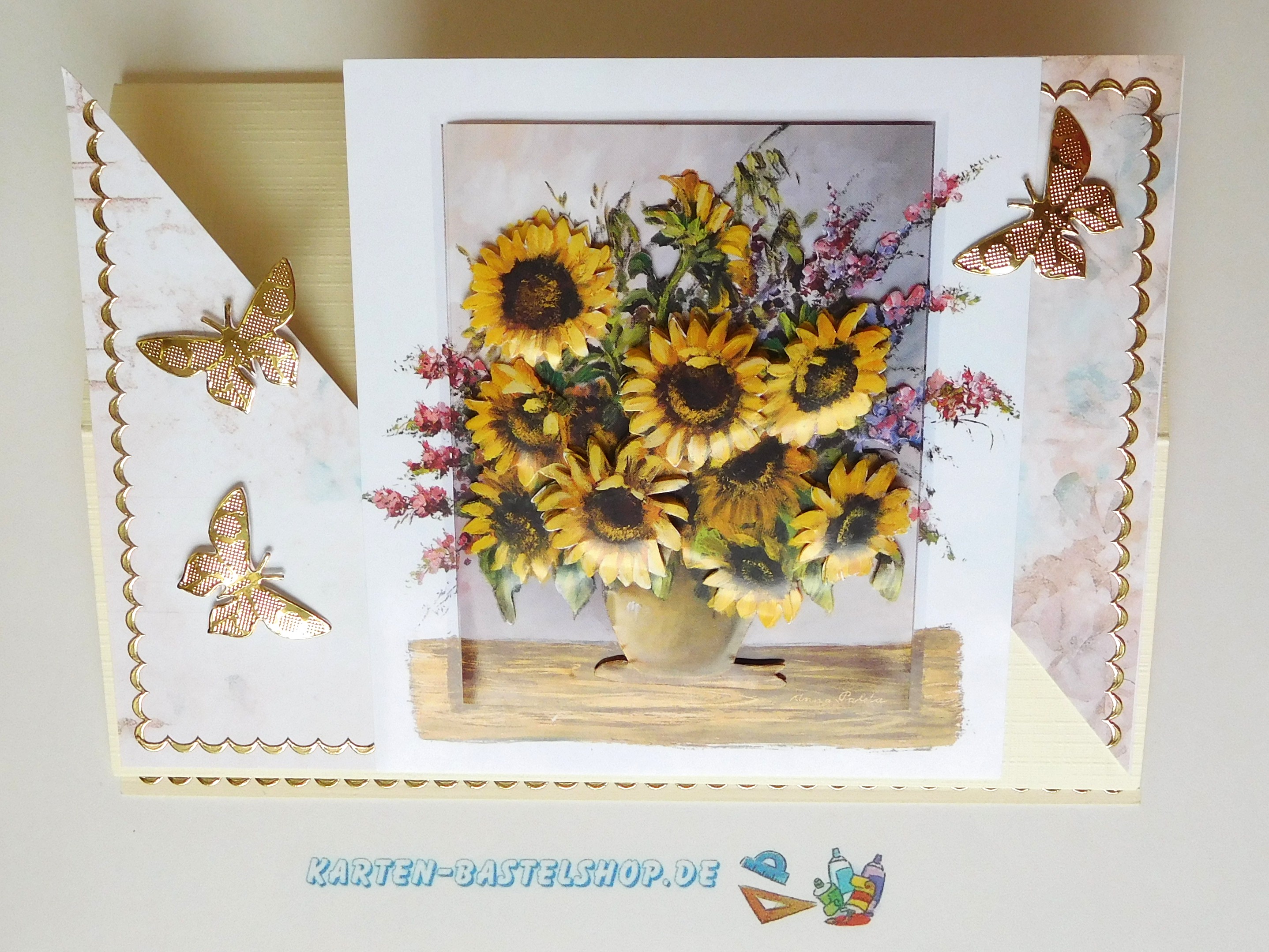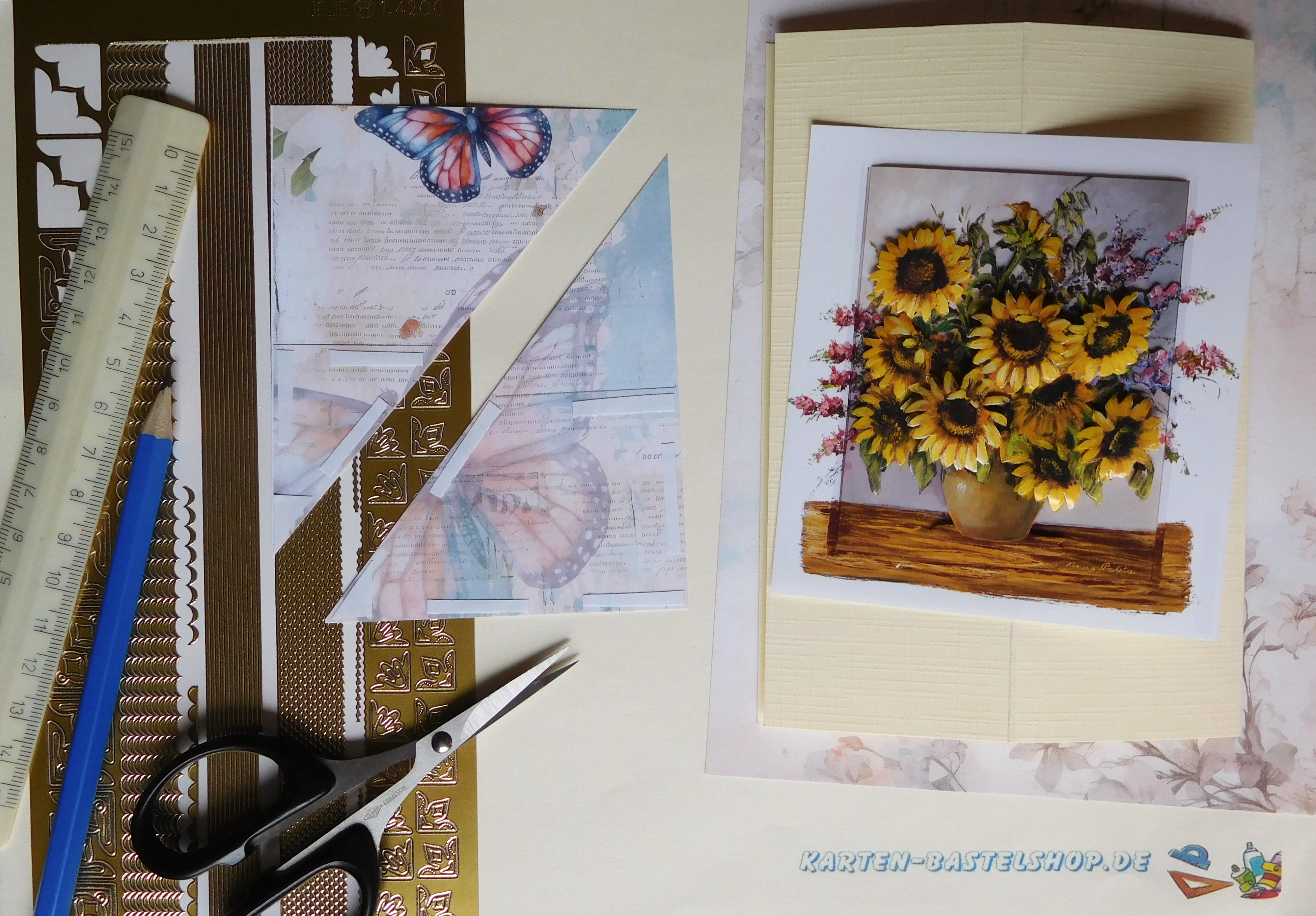 Die zweite Karte entsteht aus einer hellgelben Klappkarte mit dem 3D-Motiv „Sonnenblumen im Rahmen“. Für Stabilität hinterlegen wir das Motiv mit einem weißen Karton, der rundum ca. 2 mm kleiner zugeschnitten ist und später nicht mehr sichtbar ist. Als Hintergrund nutzen wir den blau-beige-braun gemusterten Bastelkarton aus dem Paperpack „Schmetterlinge“ sowie Bordüren- und Schmetterlingssticker in glänzendem Gold.