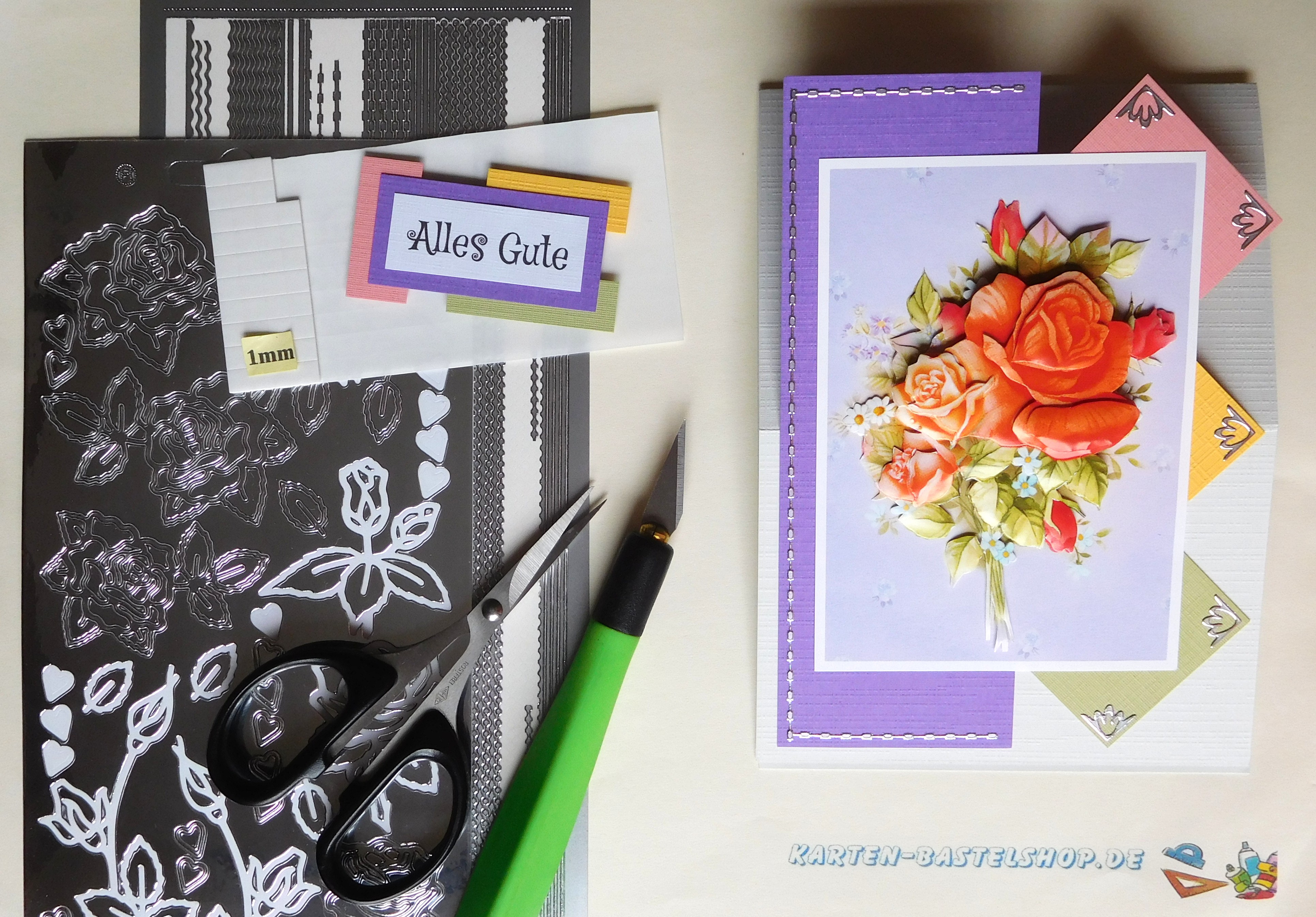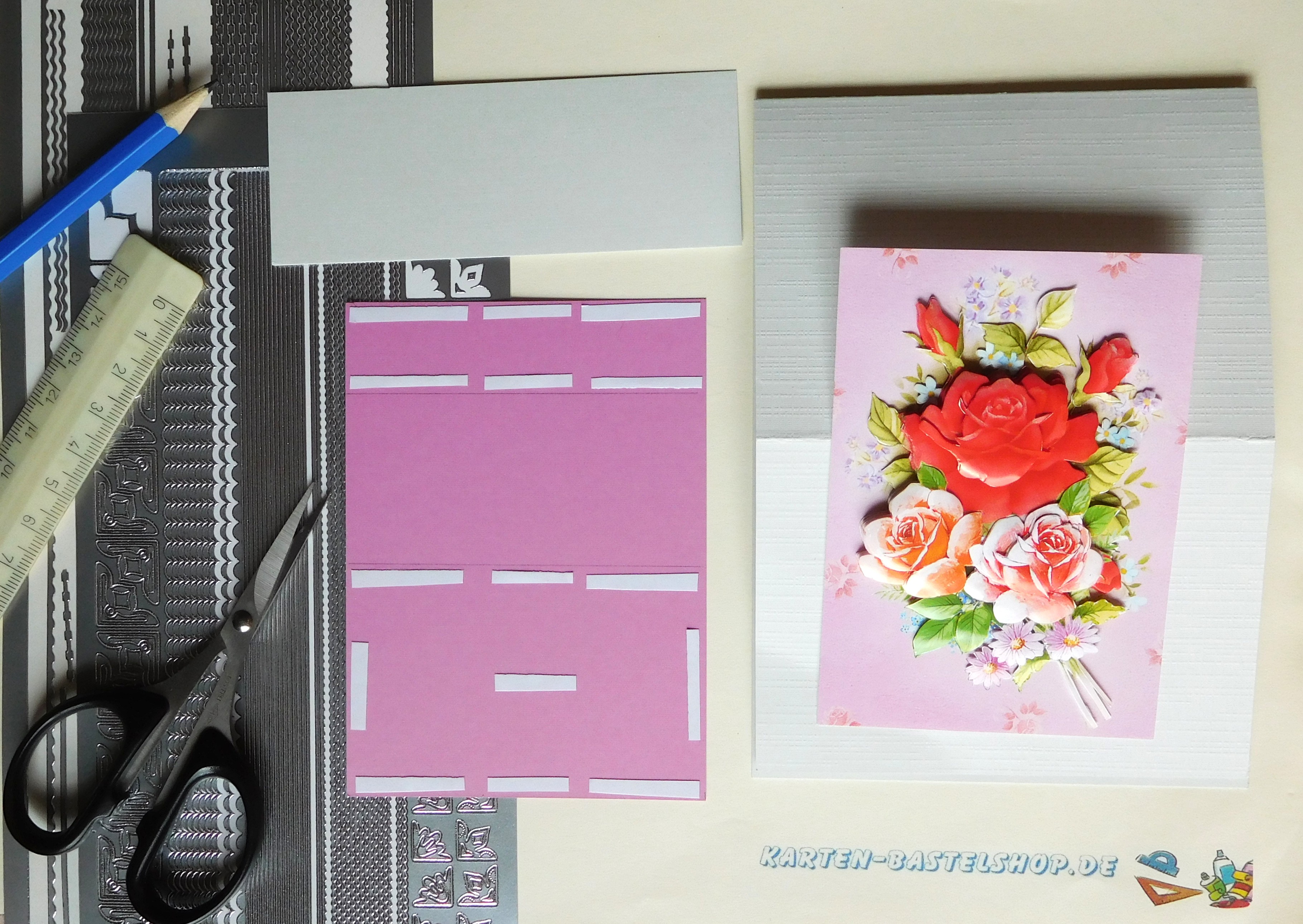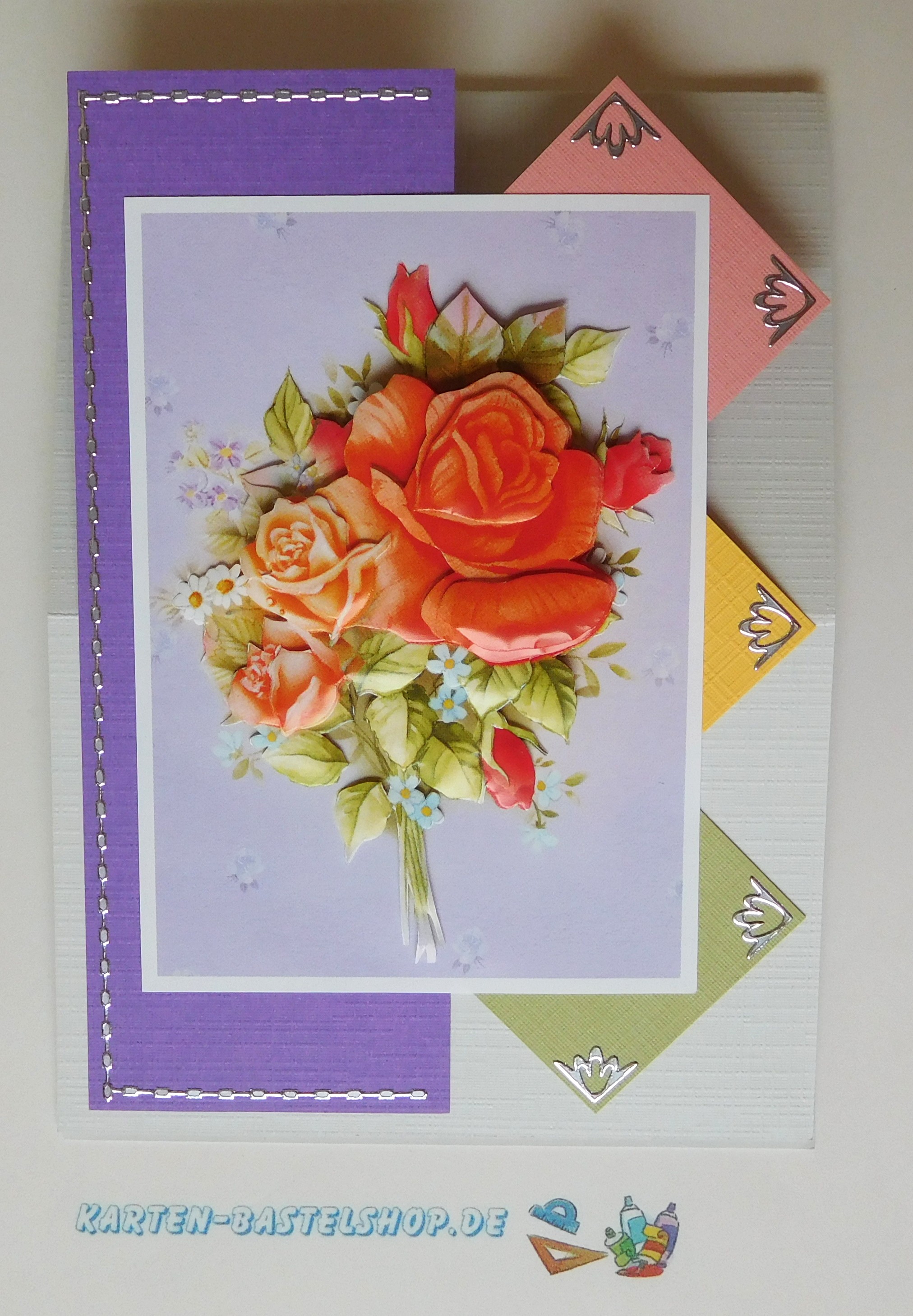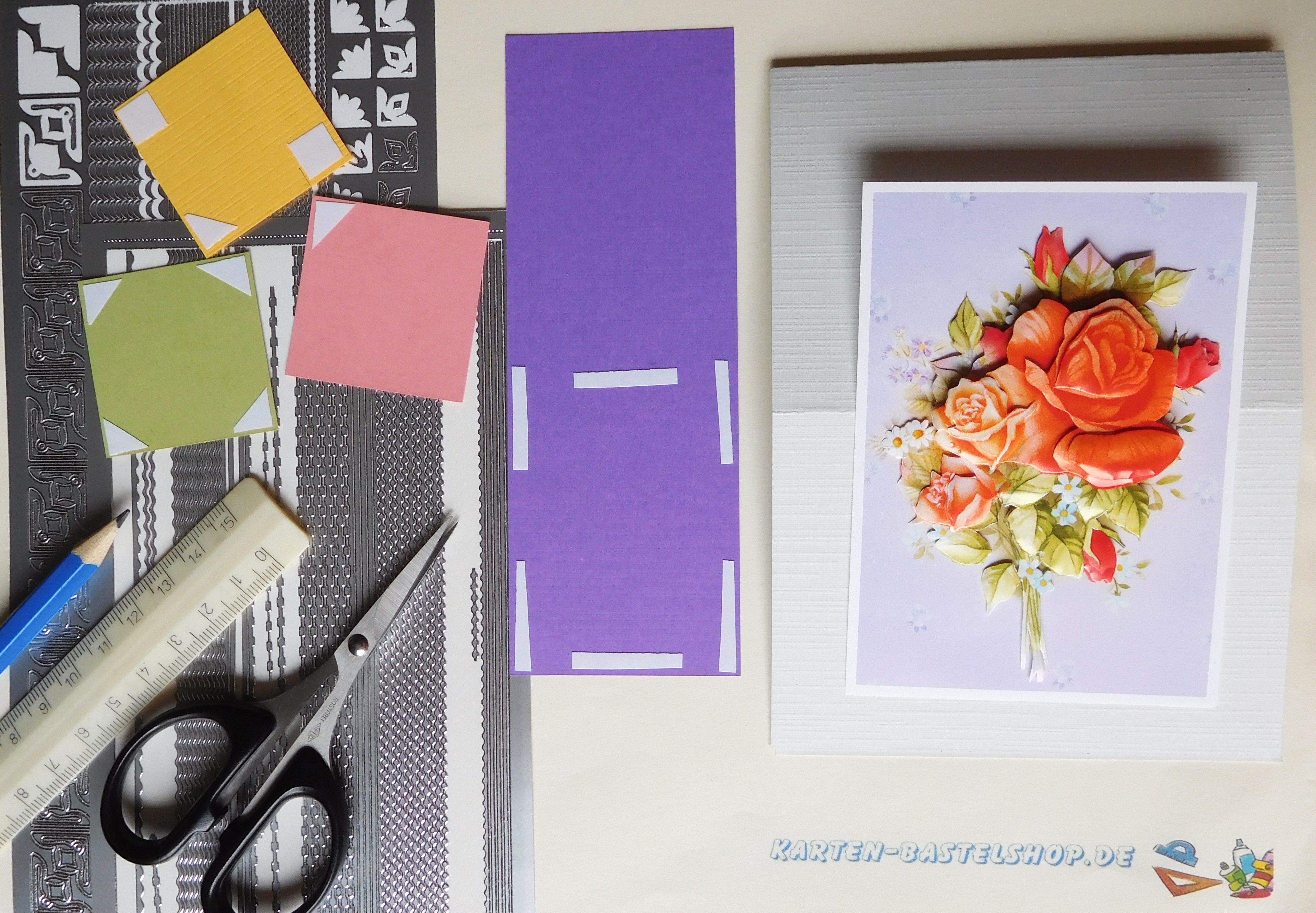 Für die dritte Karte nehmen wir eine A6-Karte im Querformat in Hellgrau und das 3D-Motiv „Rotes Rosengebinde“. Da die Karte an sich sehr neutral wirkt, greifen wir kräftige Farben als Hintergrund auf. Besonders schön lassen sich dafür kleine Reststücke vom Leinenkarton verwenden – in Lila, Rosa, Gelb und Grün. Diese Farben finden sich im Rosenmotiv wieder und bringen Lebendigkeit in die Gestaltung.