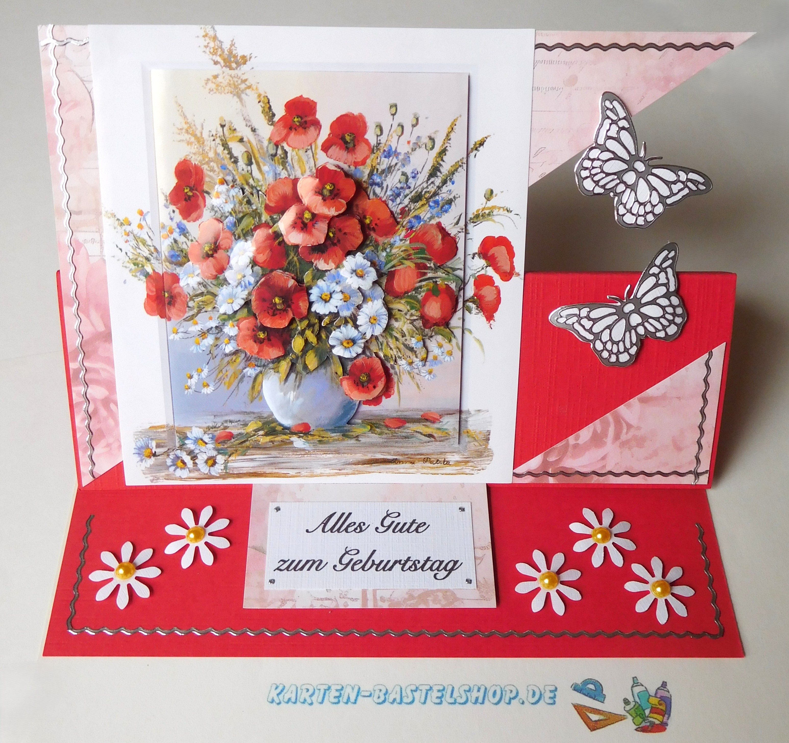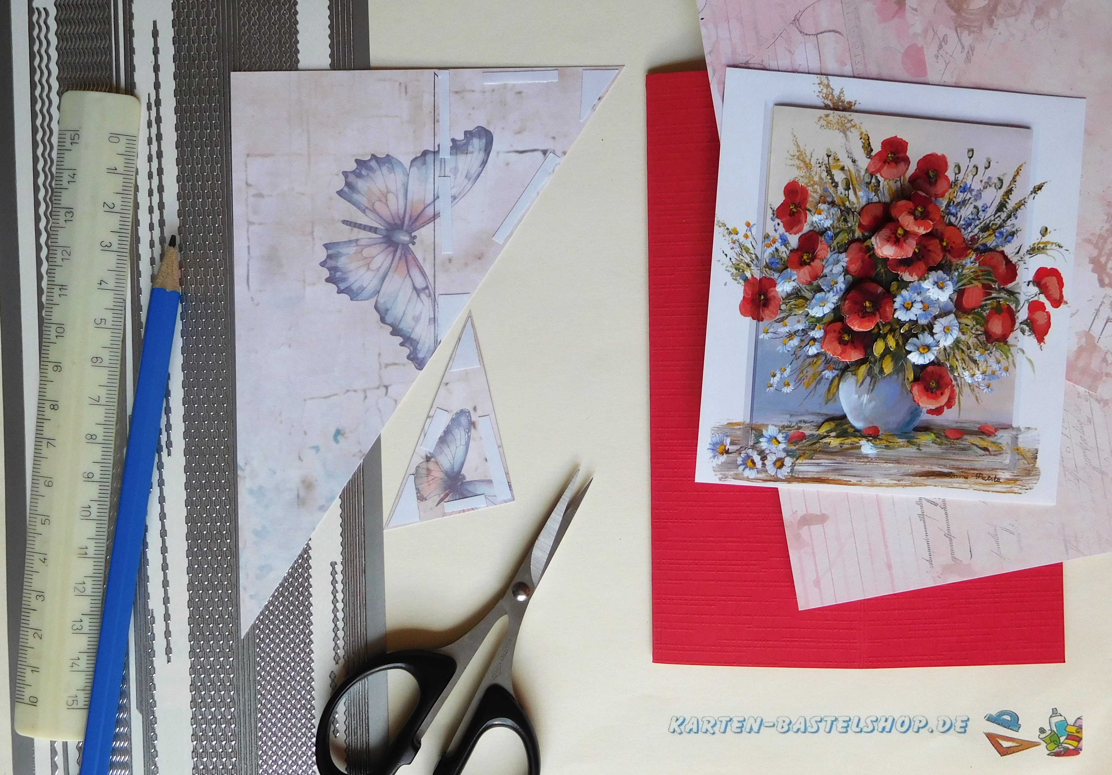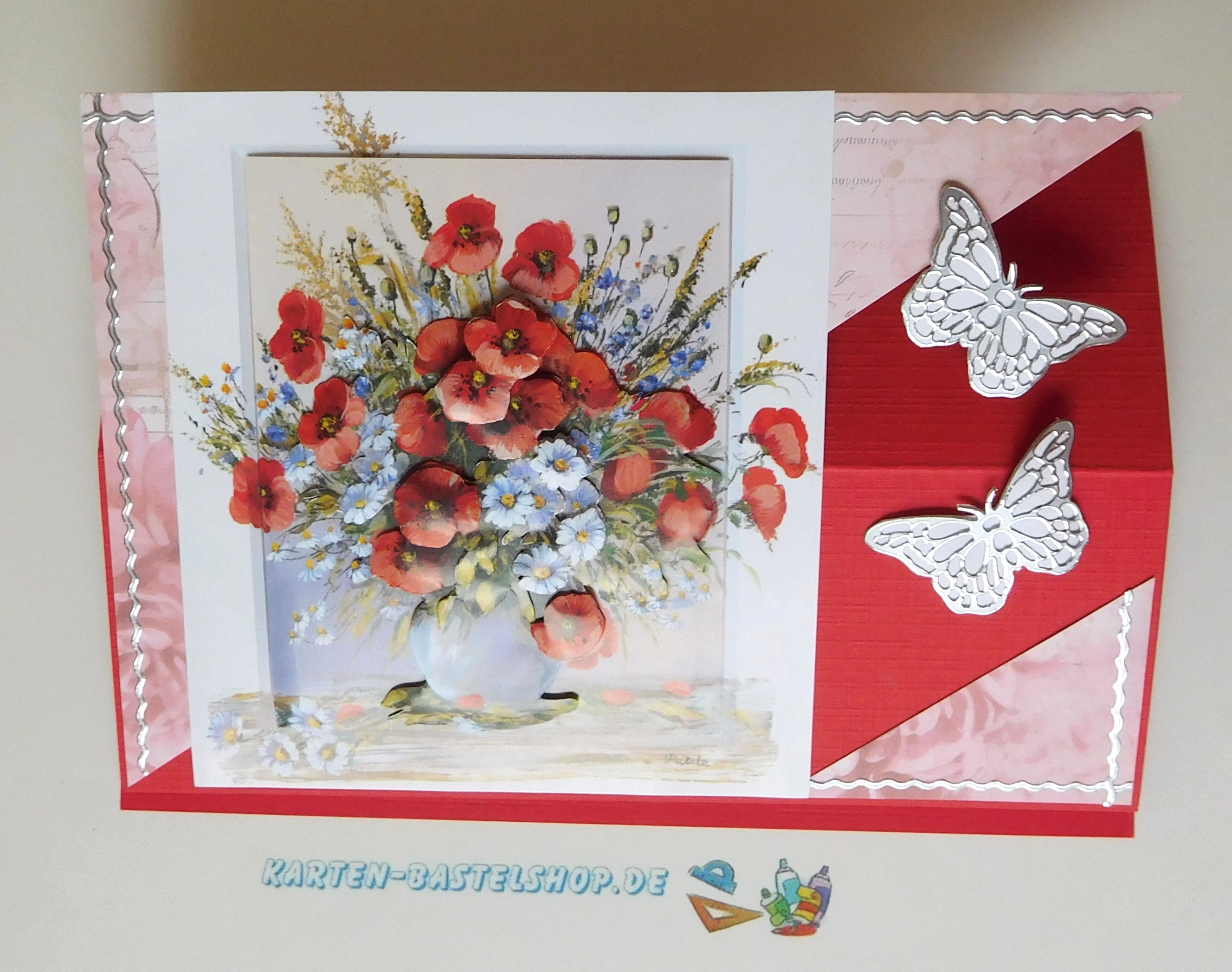 Wir starten mit der roten Klappkarte und dem 3D-Motiv „Mohnblumen im Rahmen“. Für den Hintergrund nutzen wir das Paperpack „Flutter Flair“ in Rosa sowie die Sticker von Jeje (Bordüren Nr. 1.4200, Silber) und Starform (Schmetterlinge Nr. 882, Silber). Wie oben beschrieben, basteln wir zuerst die komplette Vorderseite, danach den Innenteil. Nehmt für die Front bitte einen etwas festeren Karton – die obere Kartenhälfte „schwebt“ später und braucht Stabilität. Das 3D-Bild bekommt auf der Rückseite zusätzlich eine weiße Kartonlage, damit es nicht nach hinten kippt.