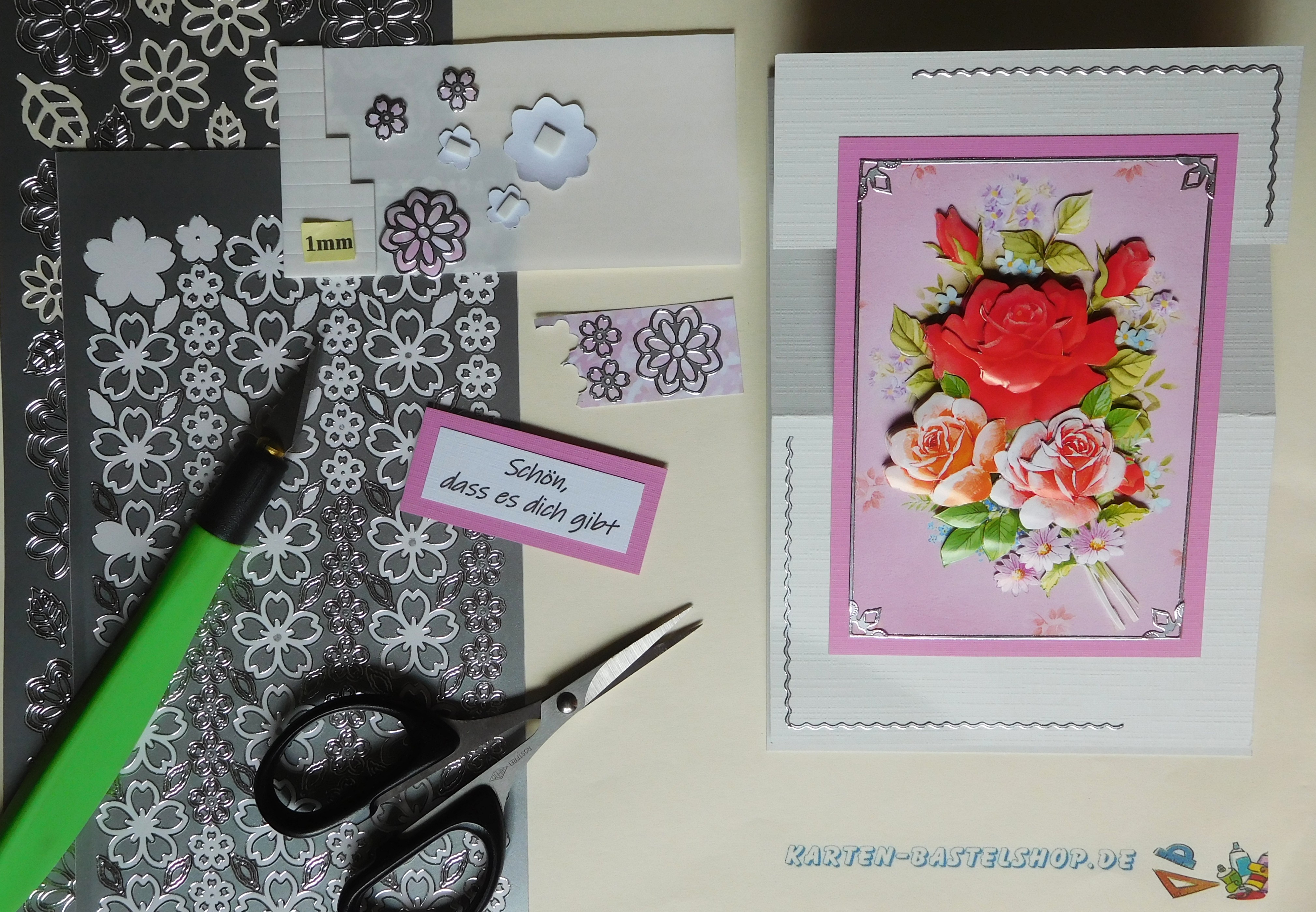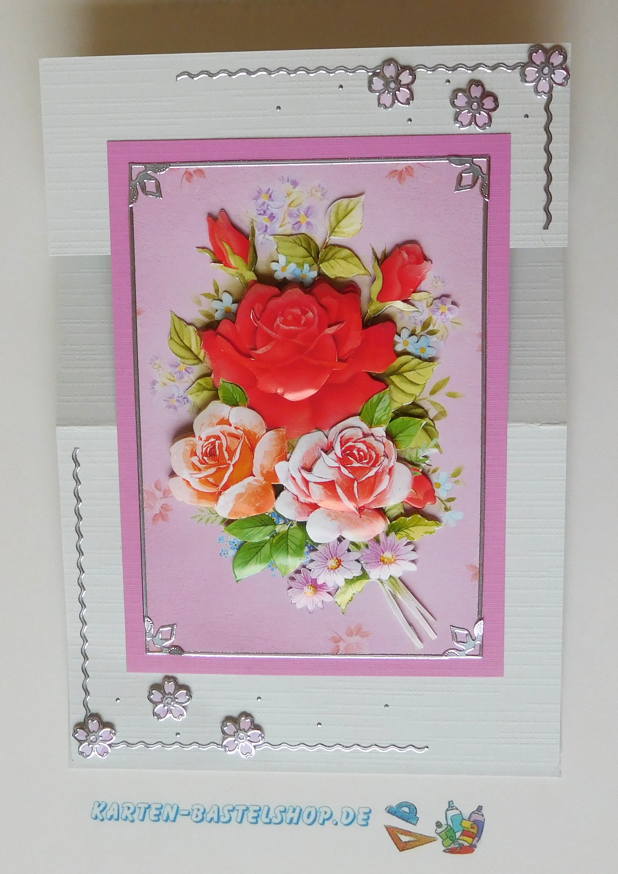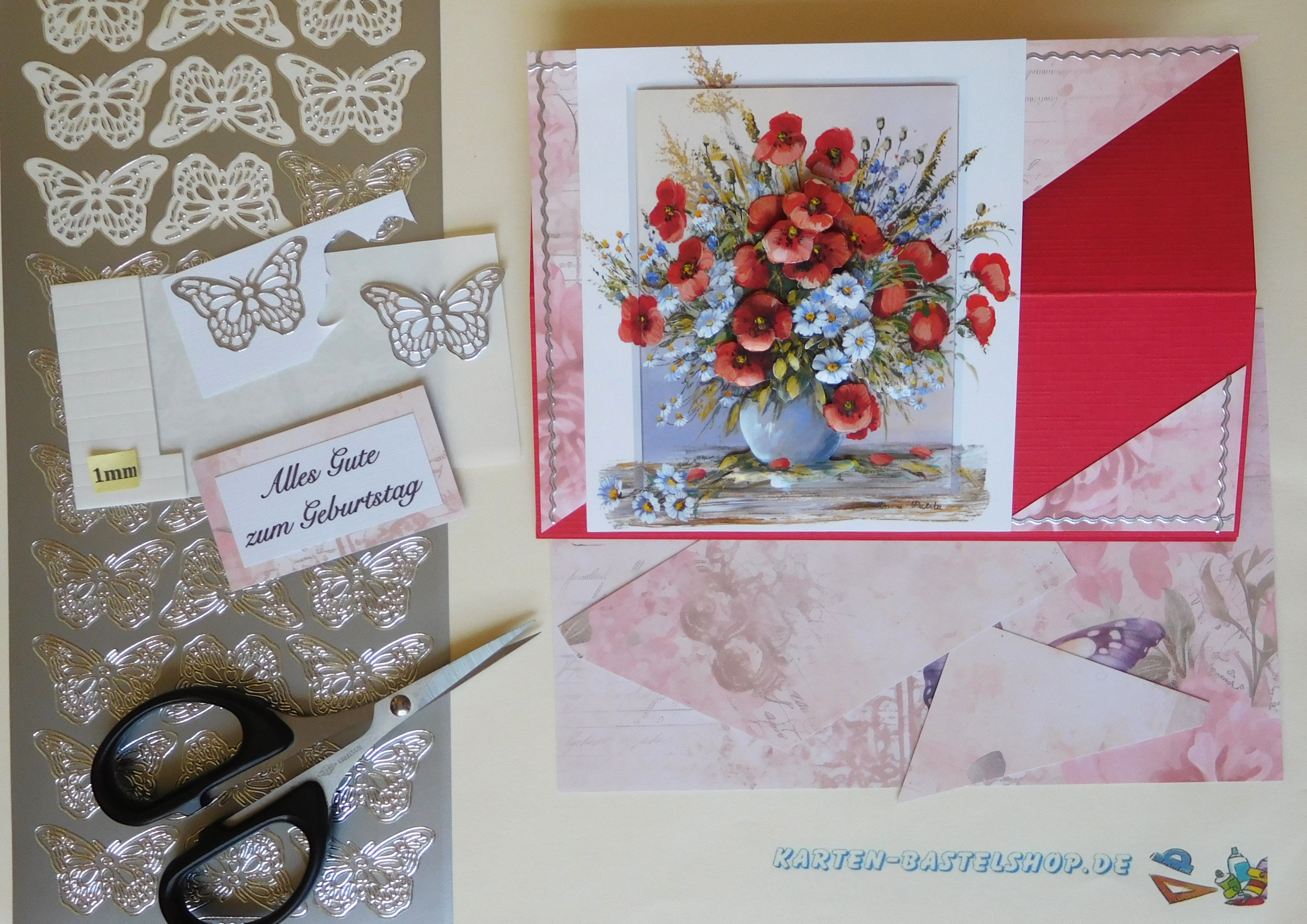 Wir starten mit der roten Klappkarte und dem 3D-Motiv „Mohnblumen im Rahmen“. Für den Hintergrund nutzen wir das Paperpack „Flutter Flair“ in Rosa sowie die Sticker von Jeje (Bordüren Nr. 1.4200, Silber) und Starform (Schmetterlinge Nr. 882, Silber). Wie oben beschrieben, basteln wir zuerst die komplette Vorderseite, danach den Innenteil. Nehmt für die Front bitte einen etwas festeren Karton – die obere Kartenhälfte „schwebt“ später und braucht Stabilität. Das 3D-Bild bekommt auf der Rückseite zusätzlich eine weiße Kartonlage, damit es nicht nach hinten kippt.