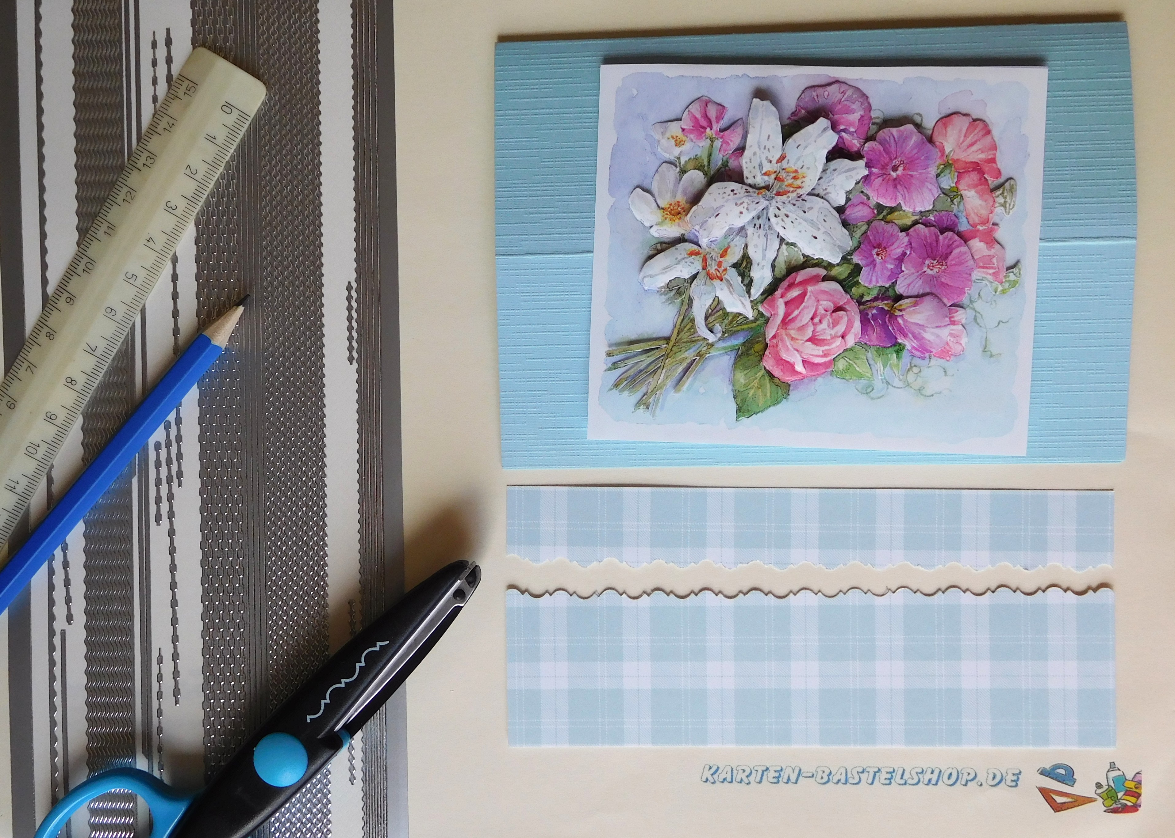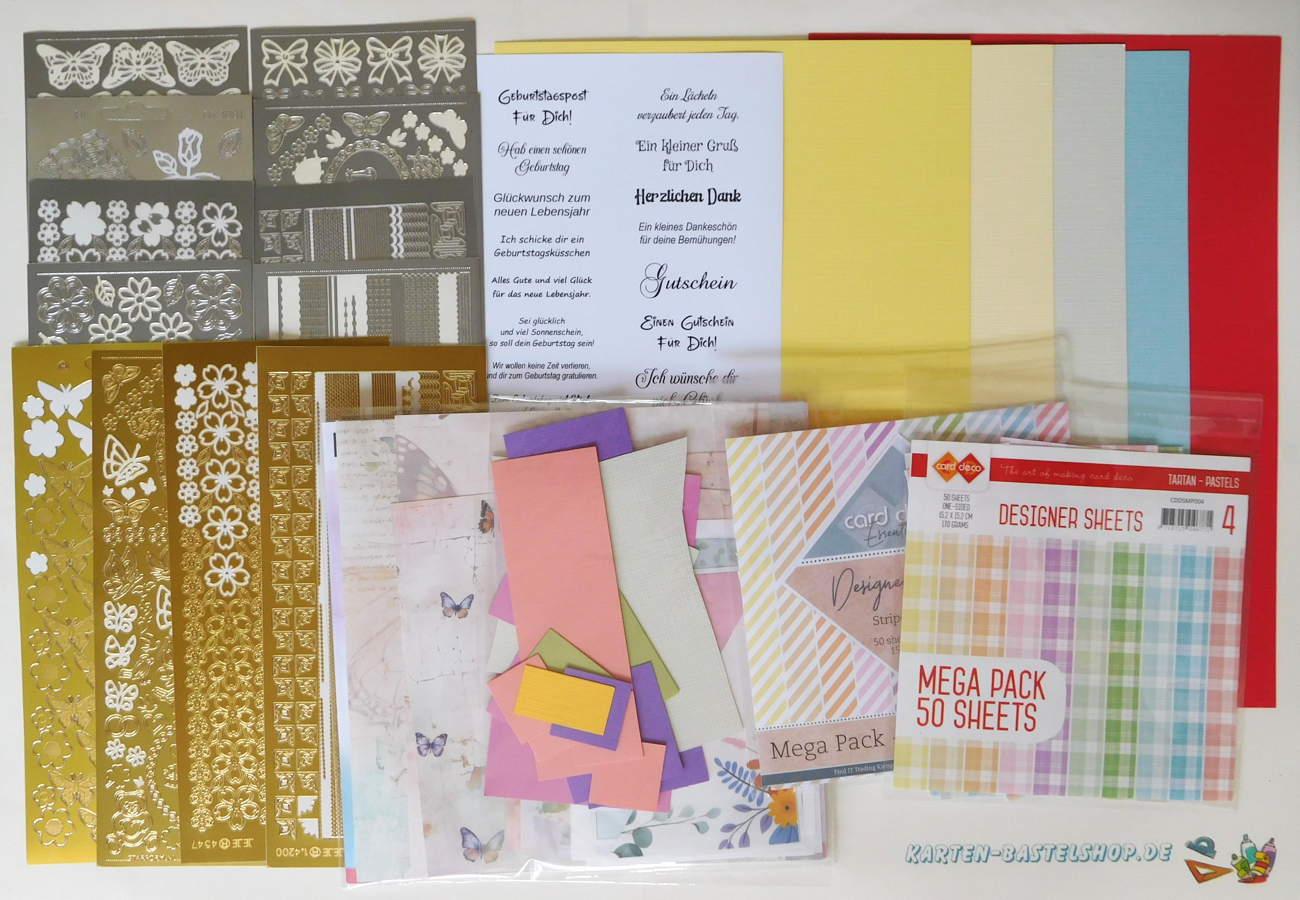 Für die Gestaltung der Flächen greifen wir außerdem zu passendem Hintergrundpapier. Besonders gut hat uns das Paperpack „Flutter Flair“ (Nr. BBPP10017) gefallen, dazu das Bastelpapier von Card Deco in Streifenoptik (Nr. CDDSMP006) und im Schottenkaro-Muster (Nr. CDDSMP004). Mit diesen Kombinationen lassen sich sowohl elegante als auch verspielte Effekte erzielen.