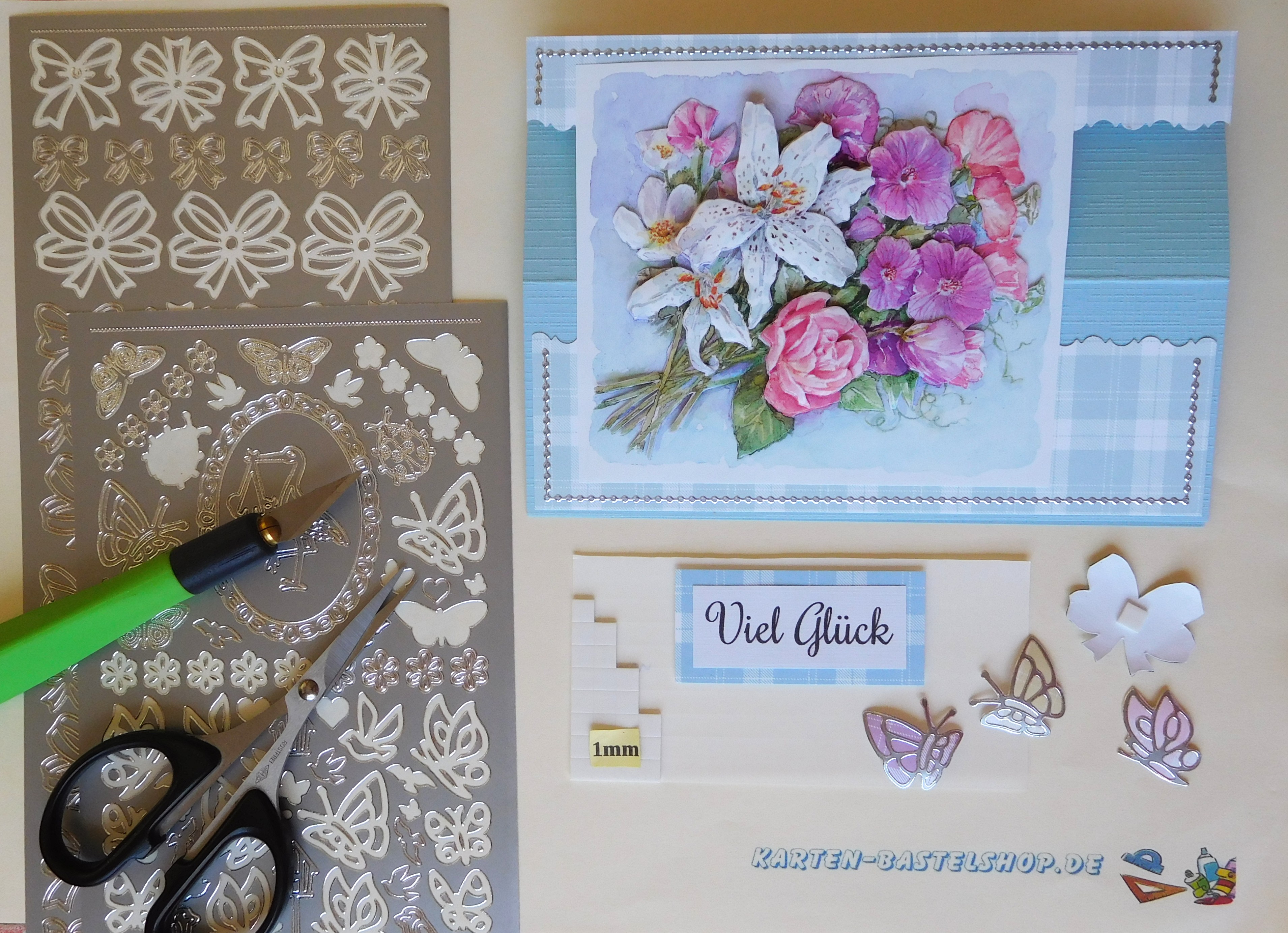 Ein besonderer Hingucker entsteht durch die Verzierungen mit Stickern. Wir haben dafür Bögen von Jeje und Starform verwendet, darunter Bordüren (Nr. 1.4200 und Nr. 1016), Kirschblüten (Nr. 4547), Rosen (Nr. 3081), Schmetterlinge (Nr. 3078, 882 und 885) sowie kleine Schleifen (Nr. 1111). Durch die Mischung aus Gold, Silber und Spiegelglanz wirken die Karten sehr edel und bekommen den letzten Schliff.