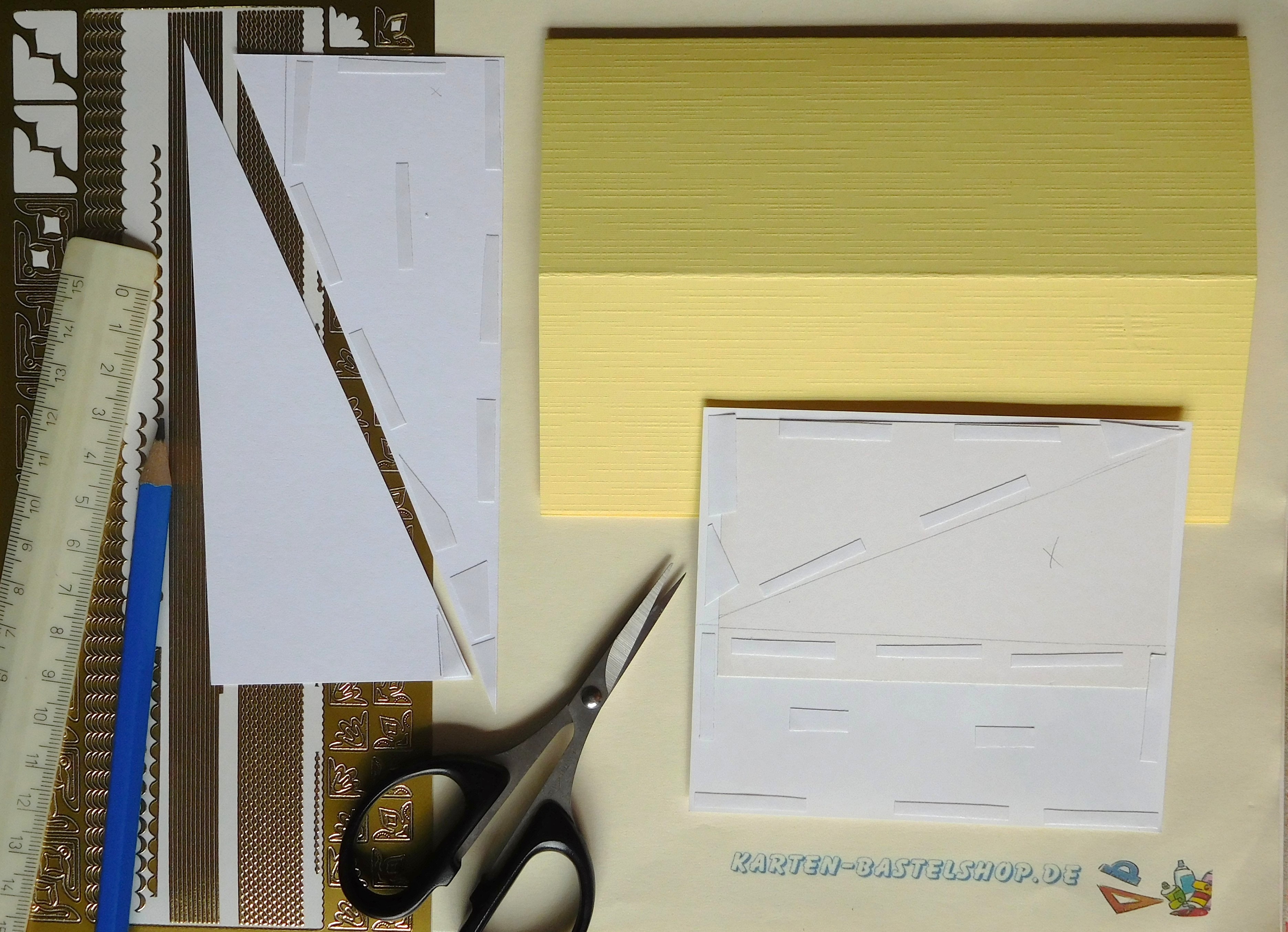 Aus dem gemusterten Bastelkarton schneiden wir ein Rechteck von 8 cm × 9,5 cm und teilen es diagonal. Die beiden Dreiecke kleben wir rechts und links auf die quergelegte Karte – mit je 1 mm Abstand zum Kartenrand. Achtet darauf, das Klebeband nur auf der unteren Kartenhälfte anzubringen, damit die Zeltfunktion erhalten bleibt.