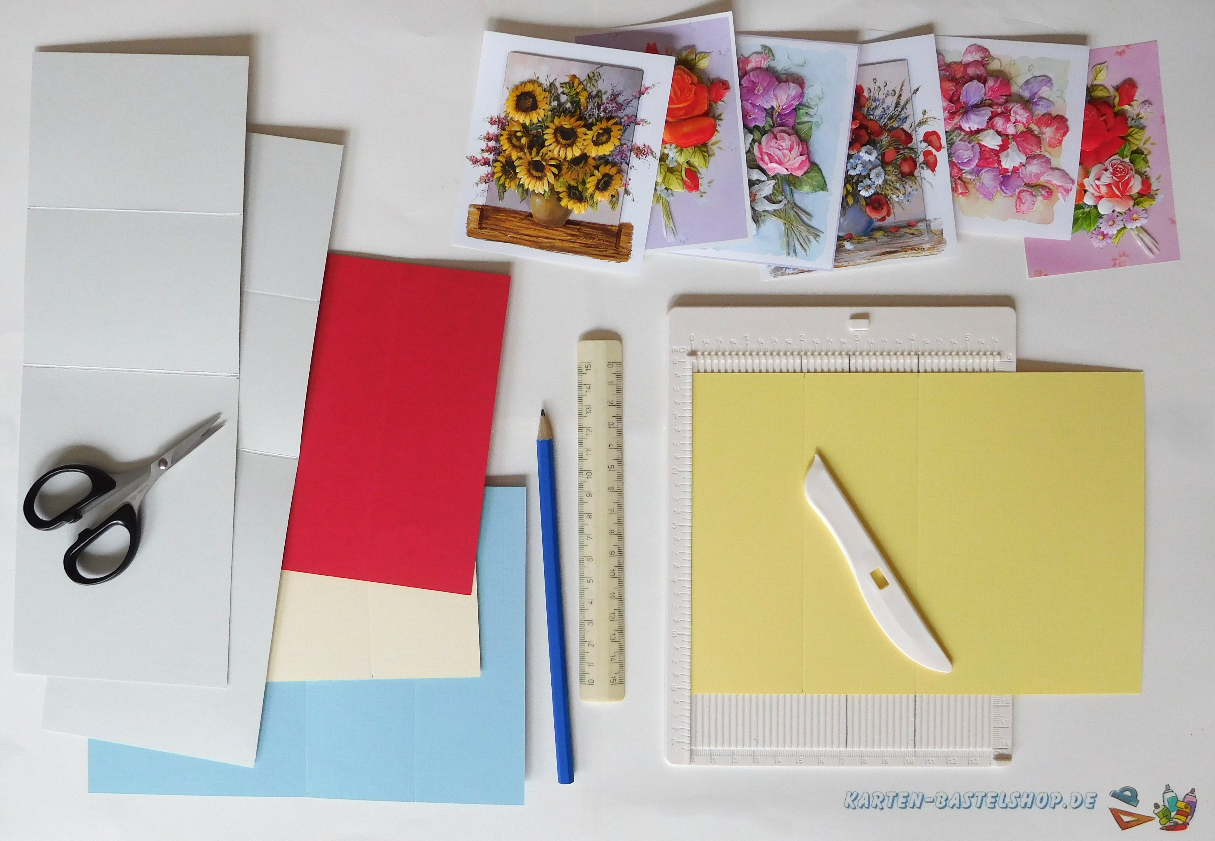 Zum Verarbeiten braucht ihr außerdem Klebepads in 1 mm Höhe, doppelseitiges Klebeband und unsere kostenlose PDF-Datei „Grüße und Wünsche“. Als Werkzeuge reichen Schneideunterlage, Schere, Bastelmesser und eine Zackenschere, dazu Bleistift und Lineal. Damit seid ihr bestens ausgestattet, um direkt loszulegen und eure eigenen Aufstellkarten zu basteln.