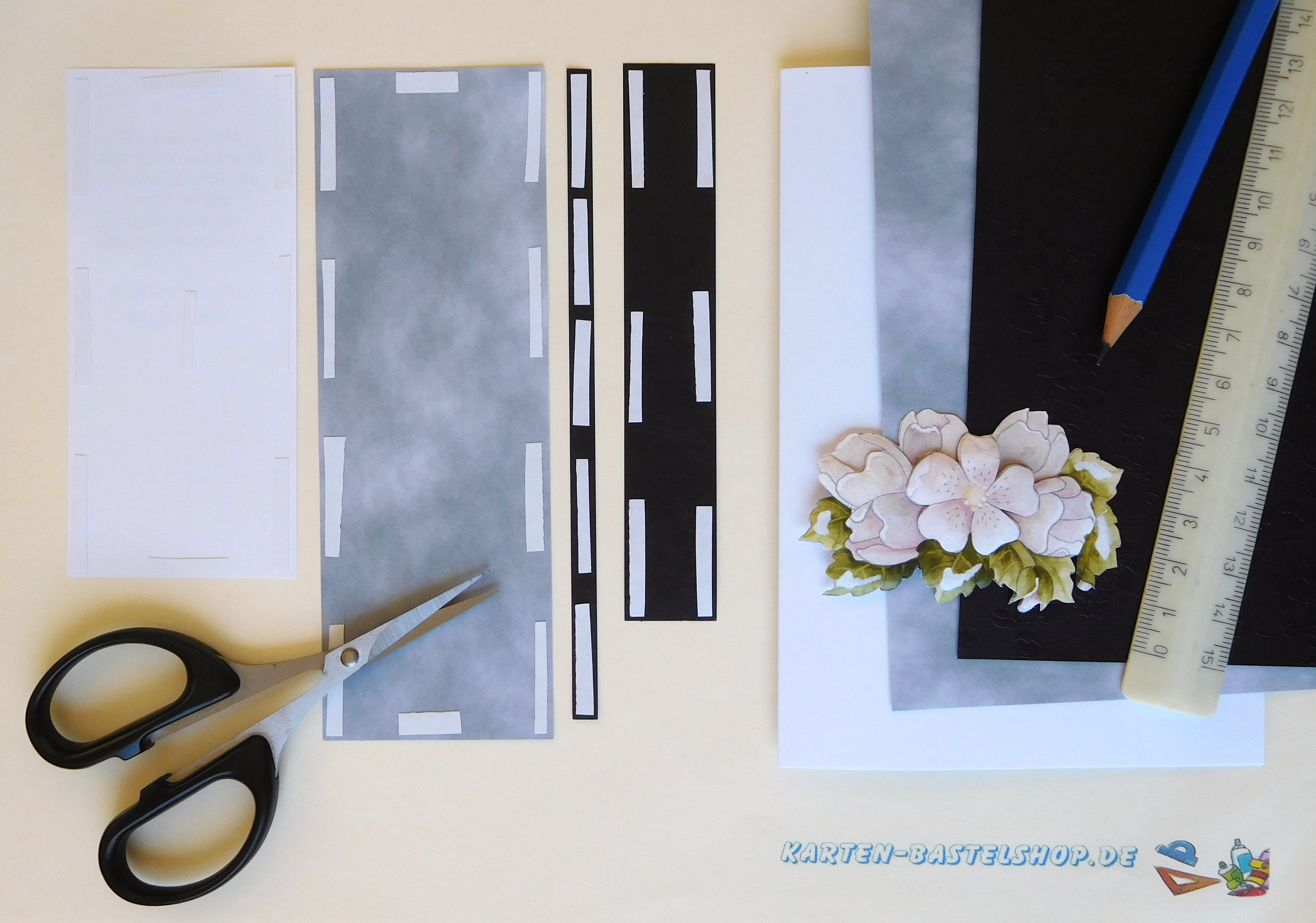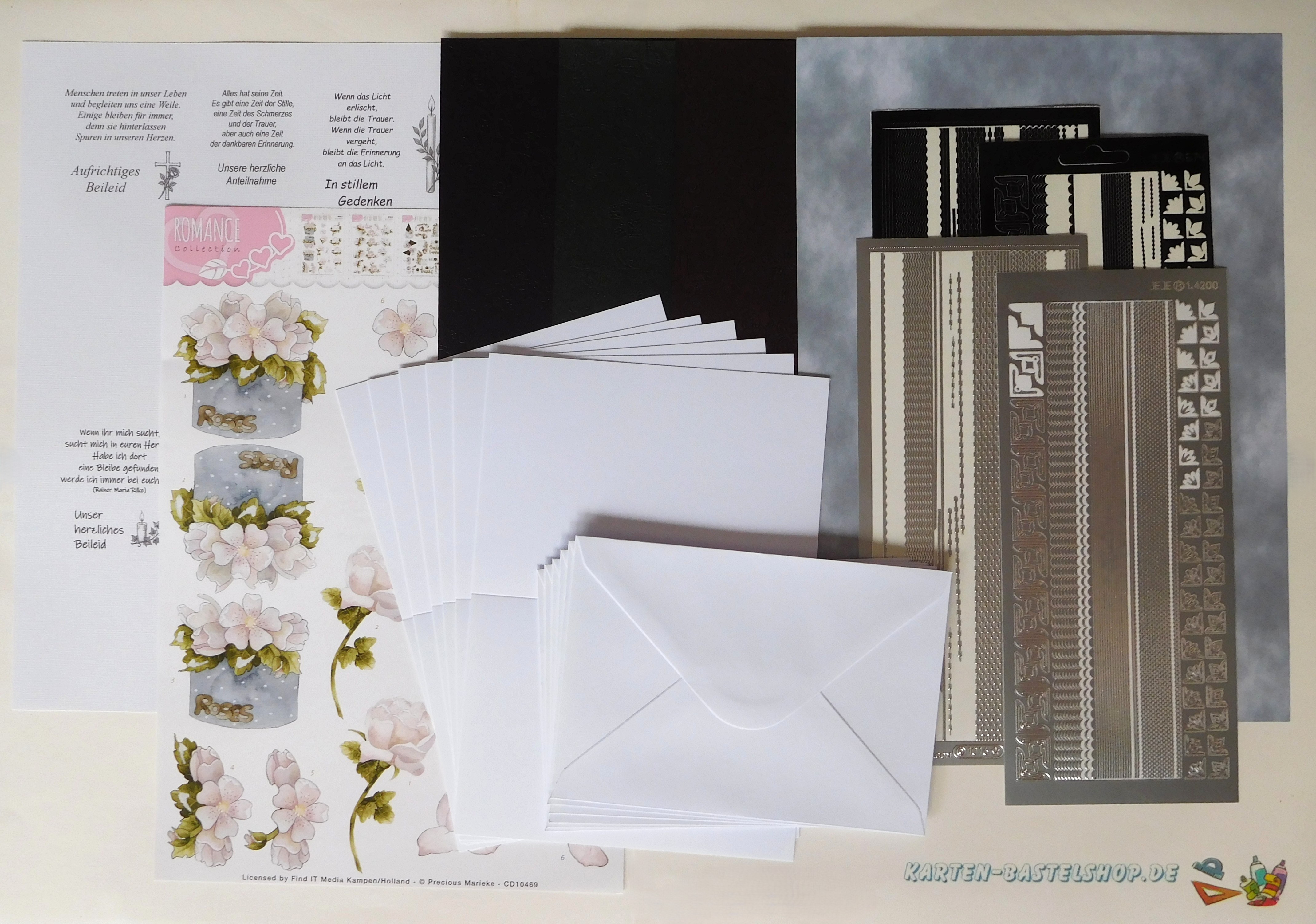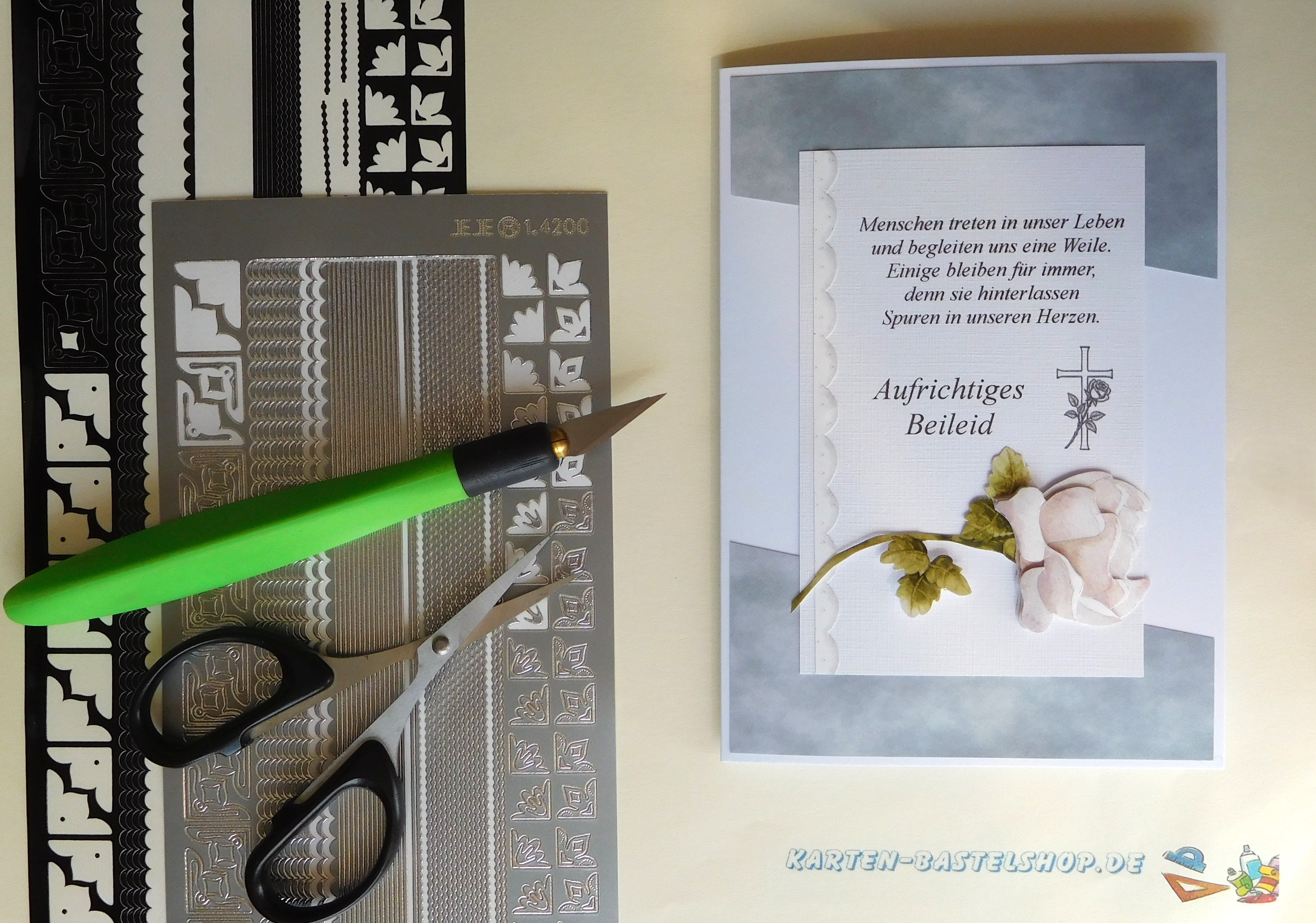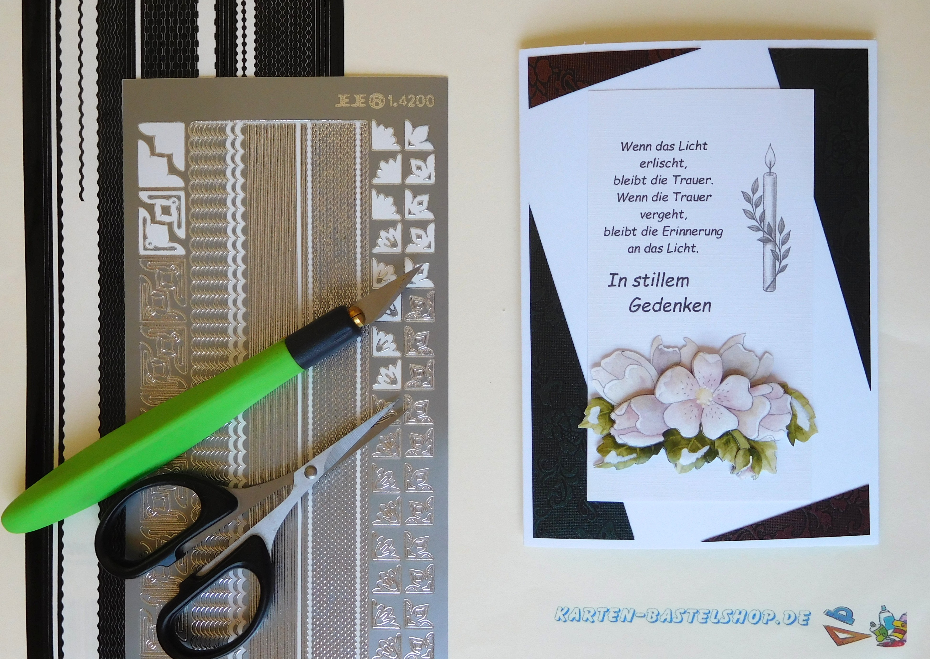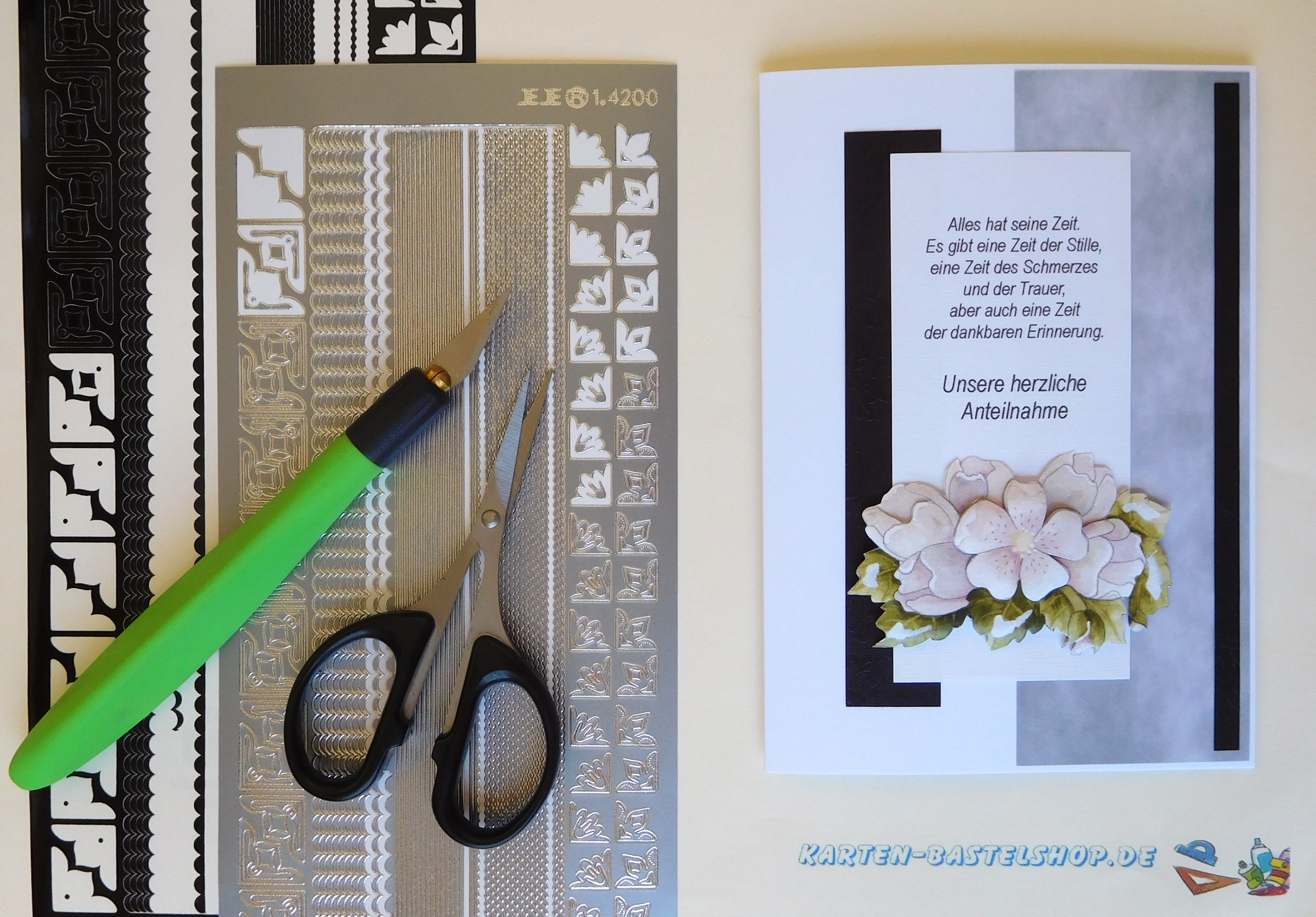 Für feine Akzente sorgen Stickerbögen von Jeje, Nr. 1.4200, mit eleganten Ecken und Bordüren in Silber und Schwarz, sowie die Bordüren-Sticker von Starform, Nr. 1016, ebenfalls in beiden Farben. Zum Aufbauen der 3D-Motive nutzt Ihr am besten Klebepads in 1 mm Stärke und doppelseitiges Klebeband, um die verschiedenen Ebenen sauber zu fixieren. Ergänzend kommt unsere kostenlose PDF-Datei „Kartenaufleger Trauerkarten“ zum Einsatz, die Ihr auf Briefpapier mit Leinenstruktur (Nr. Leinen-100) ausdrucken könnt. Sie enthält sechs geschmackvoll gestaltete Textaufleger mit einfühlsamen Grüßen, die perfekt zu diesem Thema passen.