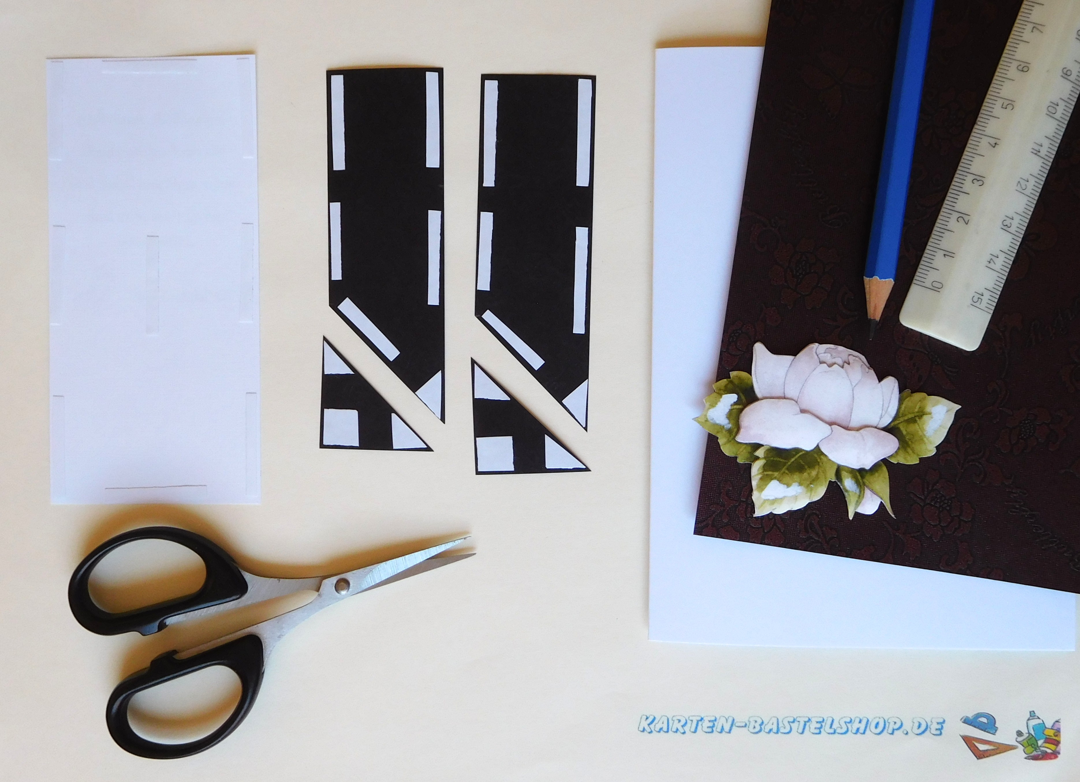 Wiederholt den Vorgang beim zweiten Rechteck. Die so entstandenen Formen klebt Ihr in die rechte untere und die linke obere Ecke der Karte. Achtet darauf, dass die lange Spitze jeweils an der Außenkante liegt und rundum etwa 2 mm Abstand zum Kartenrand bleibt.