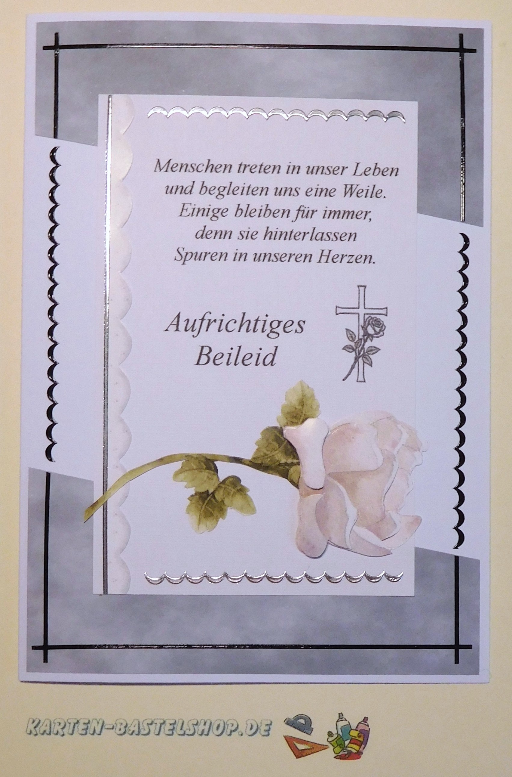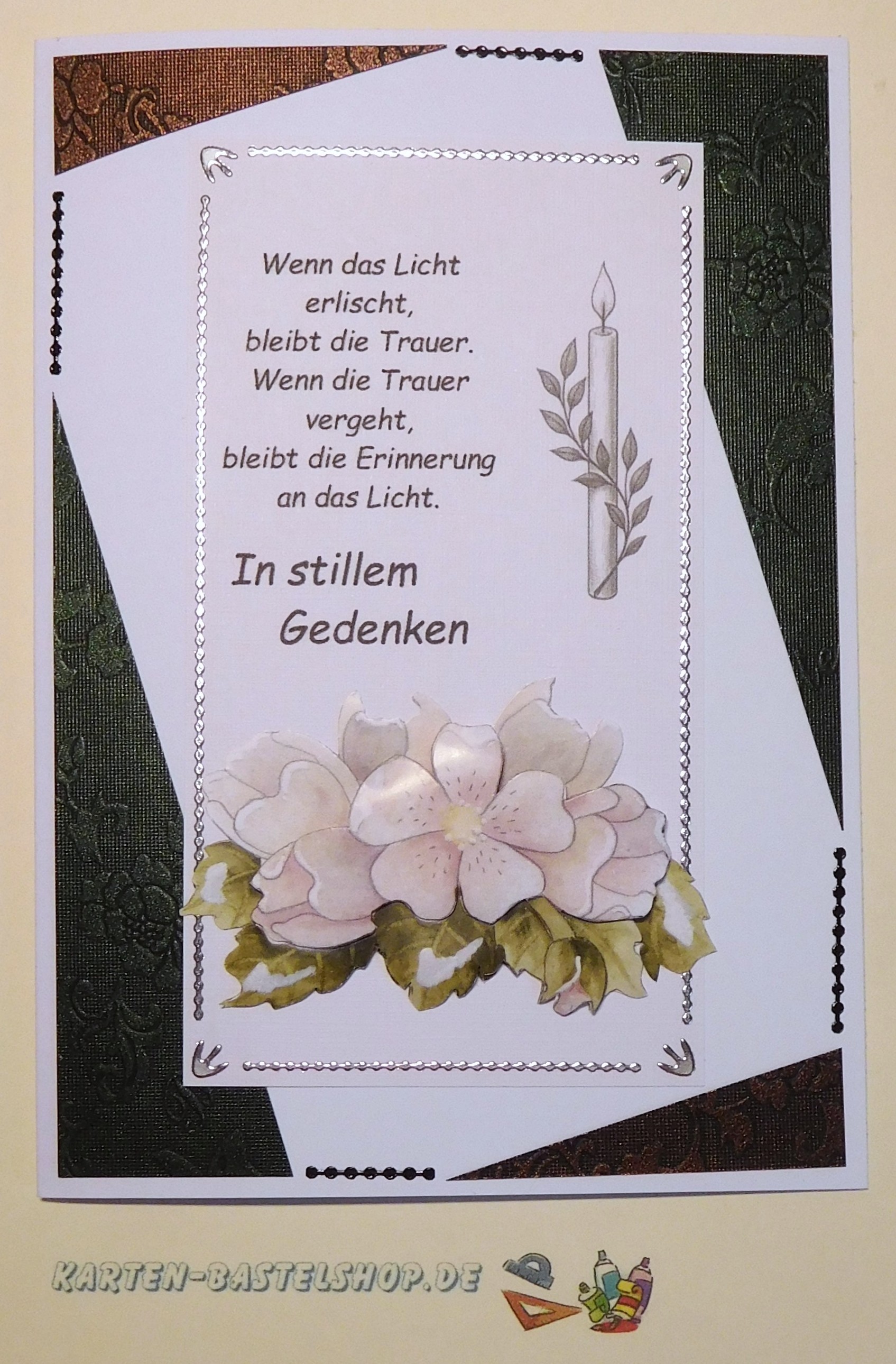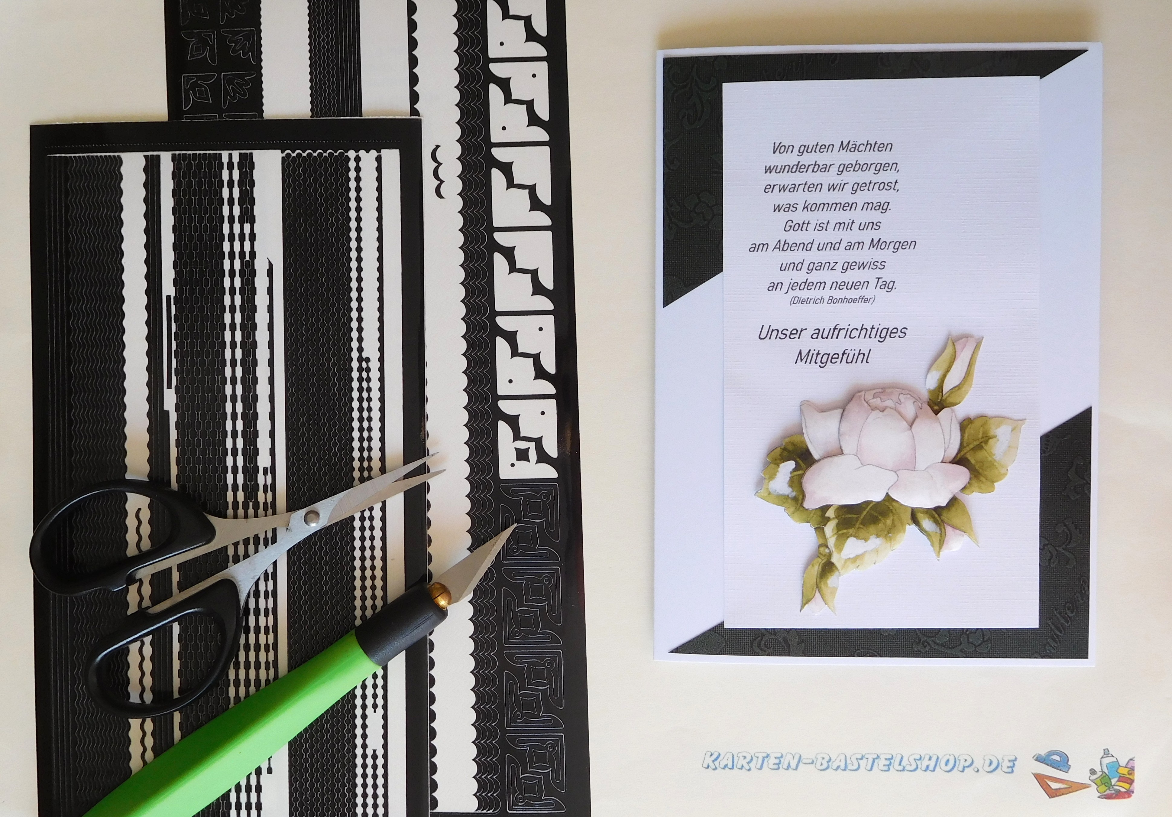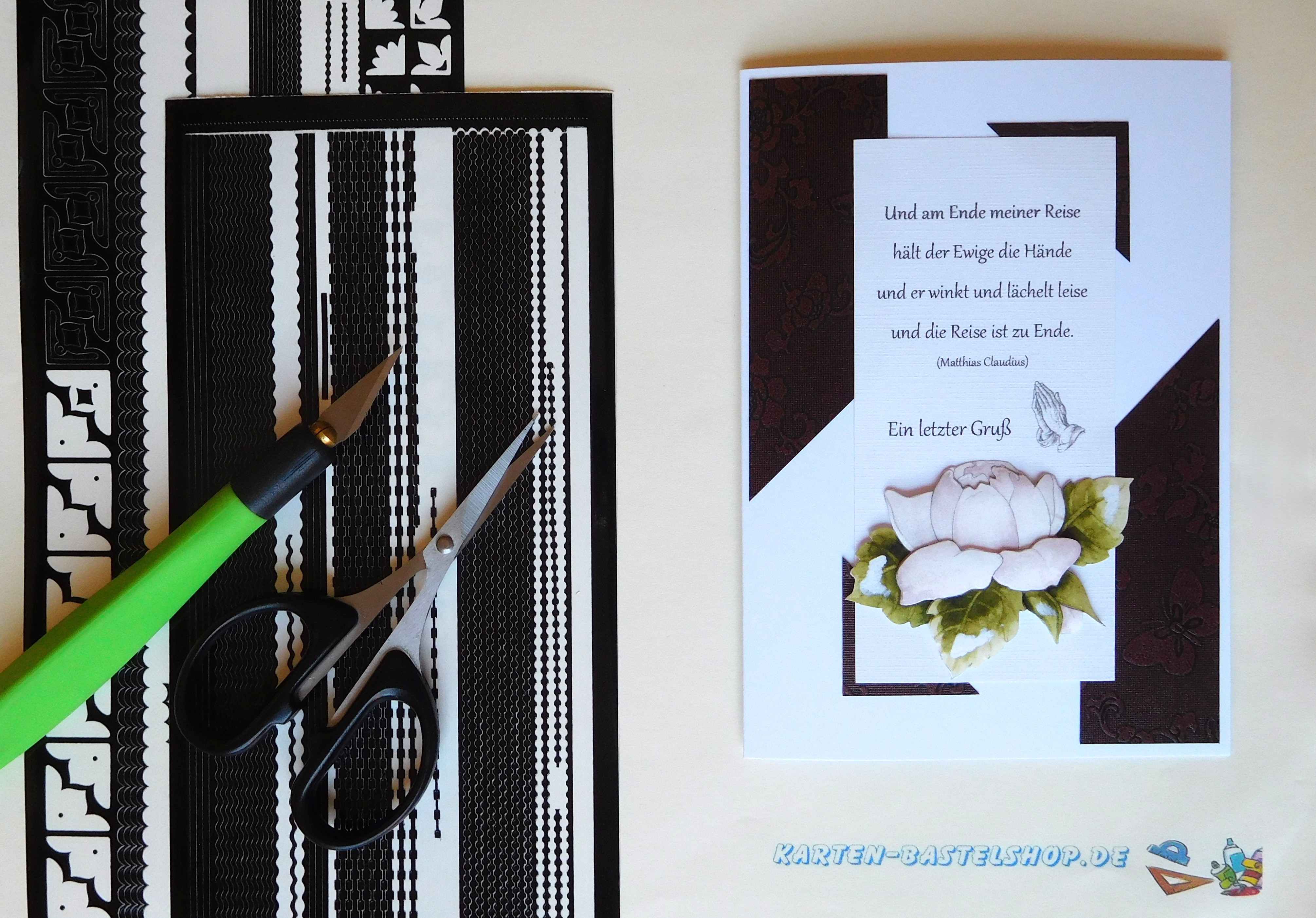 Nun schneidet Ihr den Kartenaufleger auf 7 × 11 cm zu. Auf der linken Seite bleibt ein Rand von etwa 1,5 cm, bis beim Textaufdruck das „A“ des Beileidsgrußes beginnt. Bevor die Rosenmotive auf dem 3D-Bogen starten, befindet sich im Kopfbereich eine zarte Bogenbordüre – diese könnt Ihr ebenfalls verwenden.