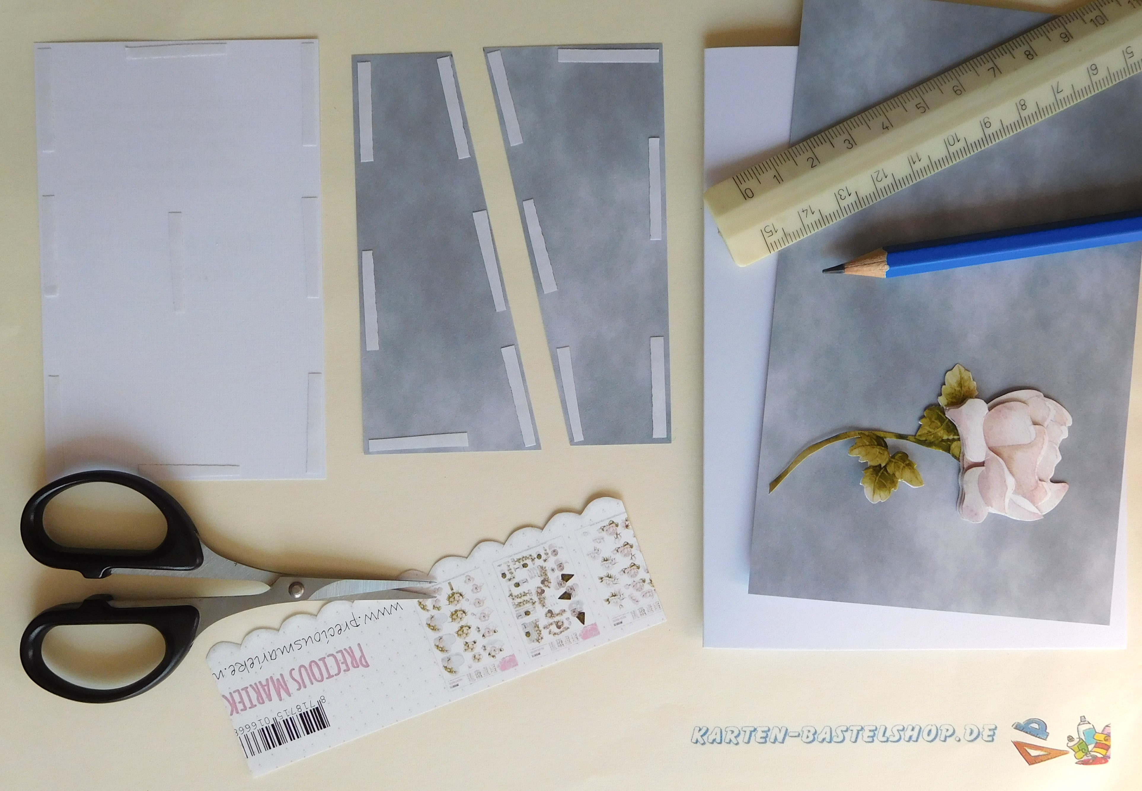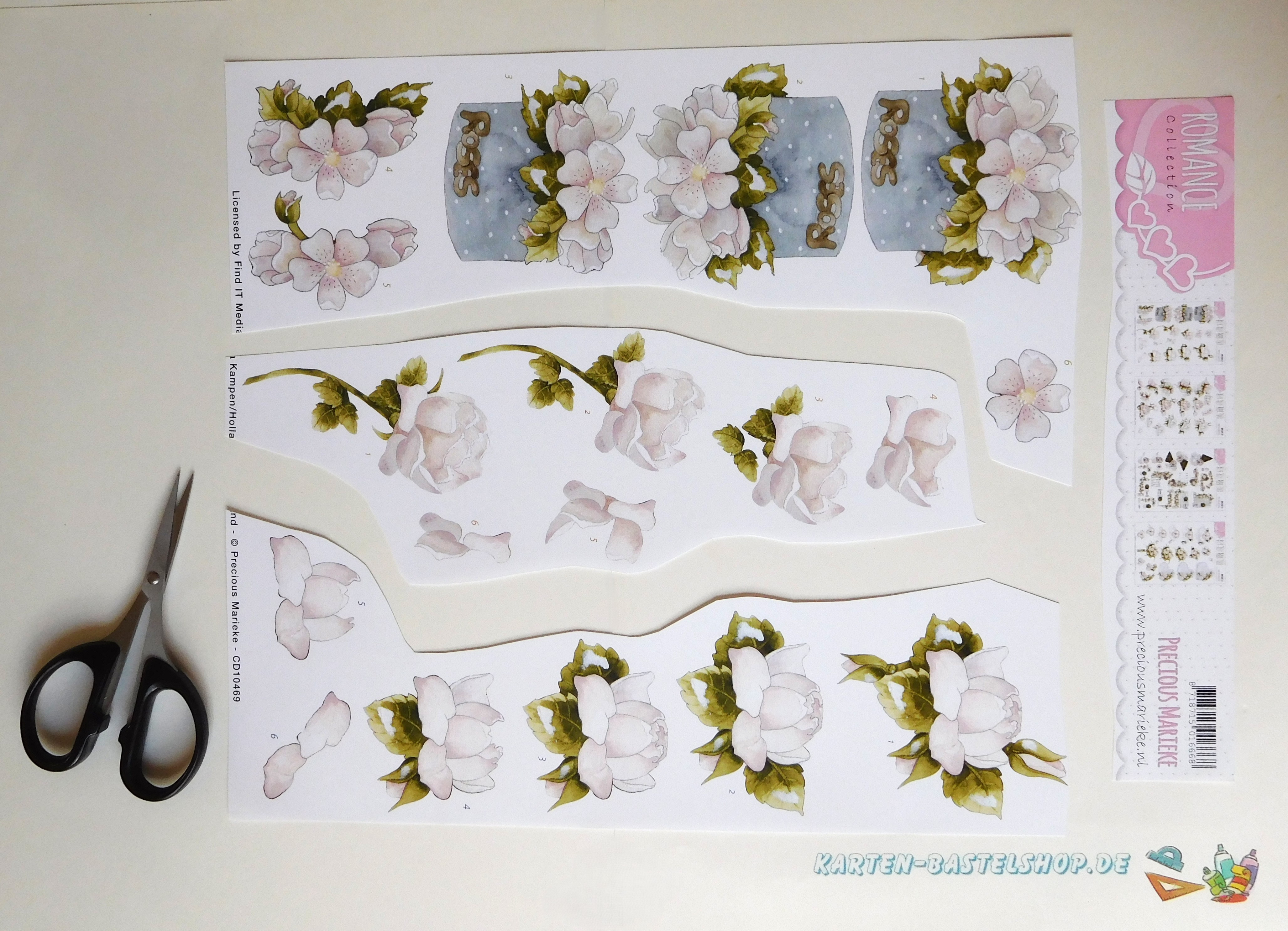 Für diesen Basteltipp verwenden wir den 3D-Blumenbogen von Findit, Nr. CD10469 „Rosen“. Dazu passen wunderbar die weißen Doppelkarten mit Umschlag aus dem Card-Deco Sparpack, Nr. CC23111. Als Hintergrund eignen sich zwei verschiedene Papiere: das Bastelpapier von LeSuh Nr. 412674 „Butterfly 2“ sowie das marmorierte Papier in Grau, Nr. MP-grau-20. Beide Varianten lassen sich je nach gewünschter Wirkung kombinieren oder einzeln einsetzen.