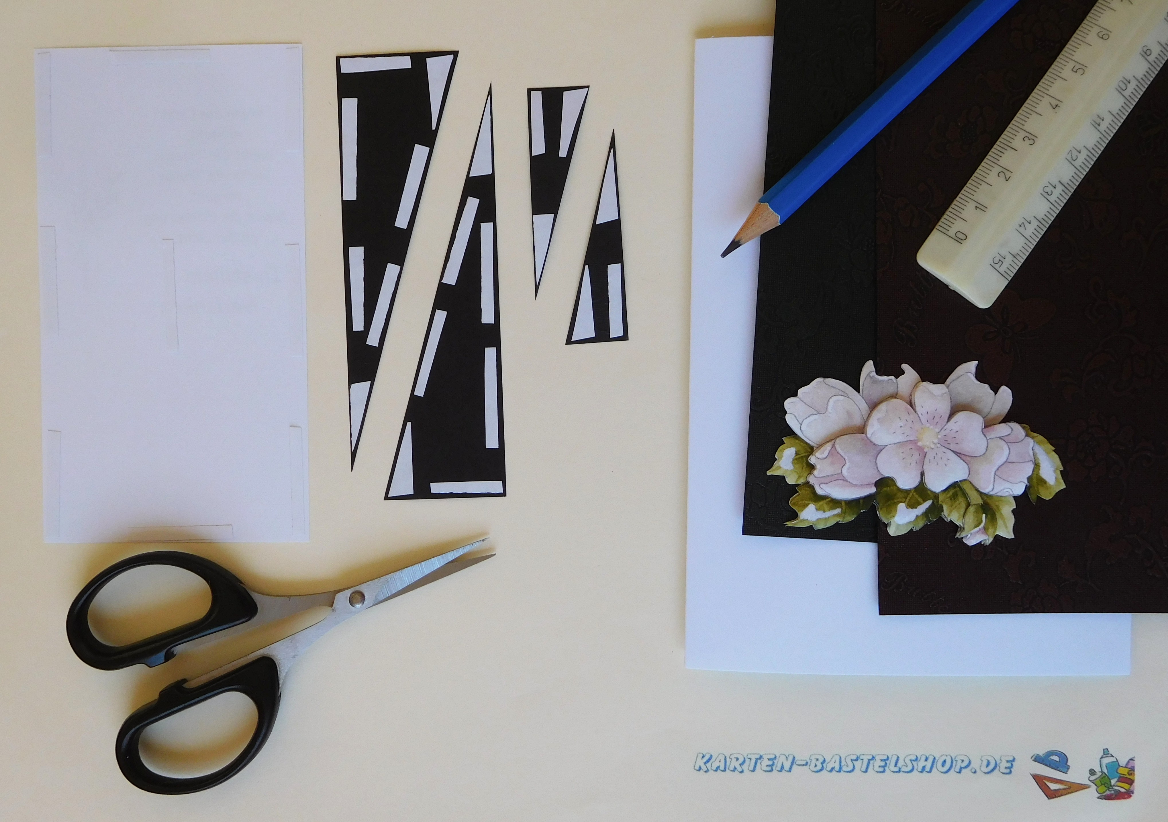 Schneidet zunächst vom dunkelgrünen Bastelpapier ein Rechteck von 3 × 10 cm und teilt es diagonal. Danach folgt ein Stück des dunkelbraunen Bastelpapiers in 1,5 × 5 cm, ebenfalls diagonal halbiert. Die beiden längeren Dreiecke werden hochkant in die rechte obere und linke untere Ecke der Karte geklebt.