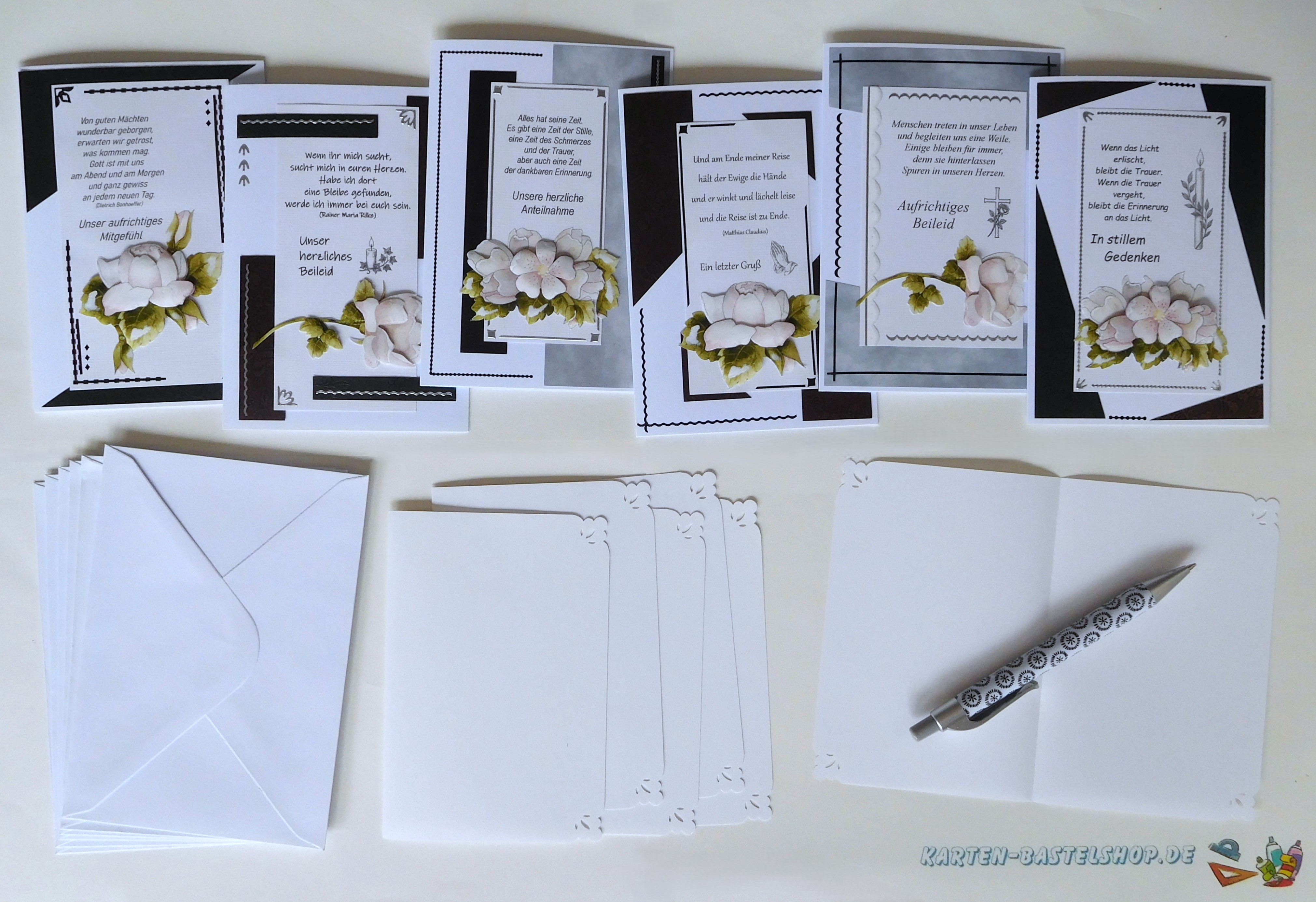 Fertig sind die sechs Karten für einen Kondolenz-Gruß – passende Umschläge liegen bereits bereit. Nun fehlt nur noch das Einlegeblatt, damit Ihr Eure persönlichen Worte stilvoll hinzufügen könnt.