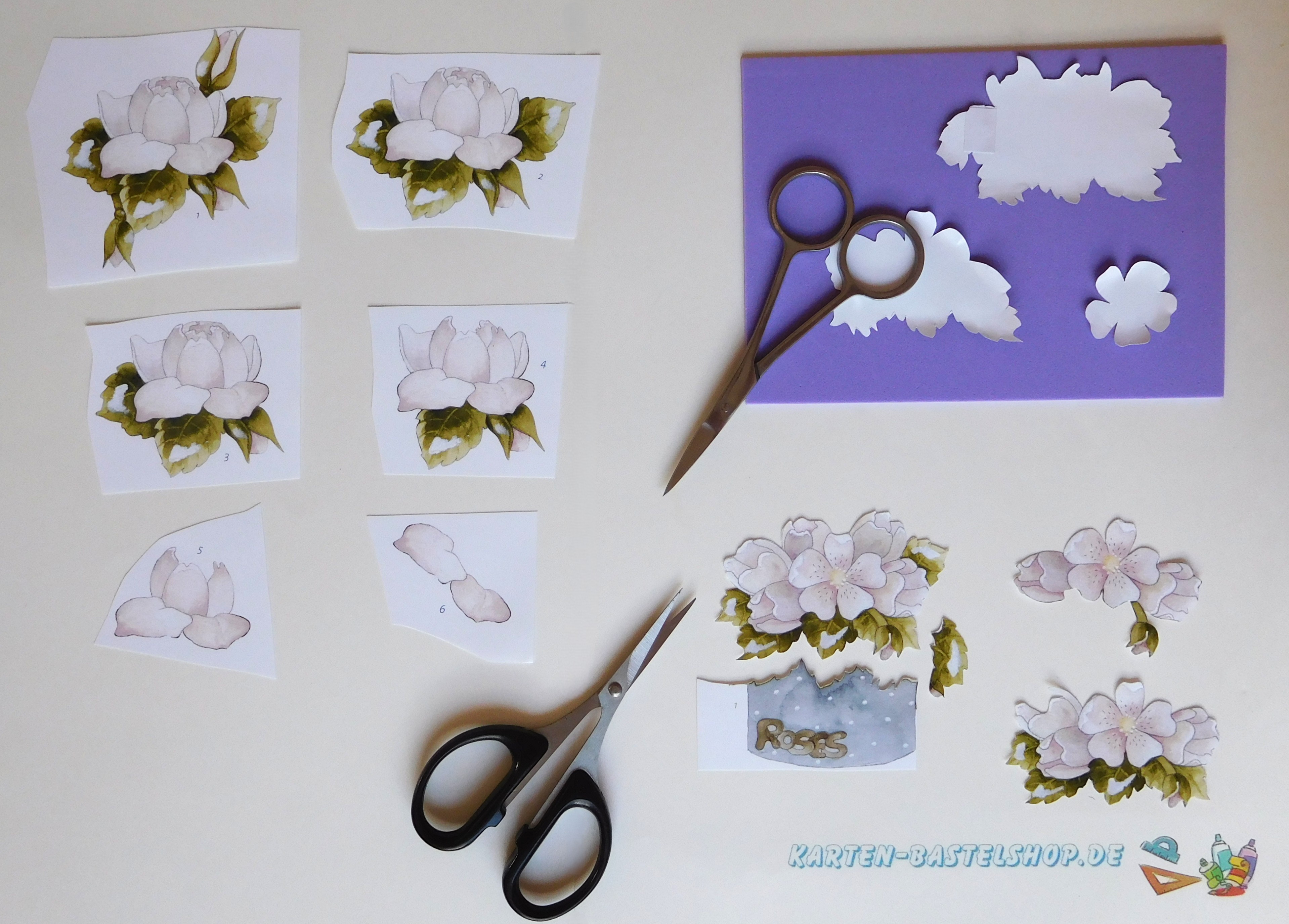 Stört auf einem Motiv ein Detail, wie etwa ein Blumentopf oder ein unpassendes Accessoire, dürft Ihr das natürlich entfernen. In unserem Beispiel wurde der Topf unter den Rosen einfach weggeschnitten. Das dahinterliegende Blatt kann jedoch weiterverwendet werden: Schneidet es aus und klebt es mit einem Stück doppelseitigem Klebeband wieder an passender Stelle fest. So bleibt das Motiv stimmig und geschlossen.