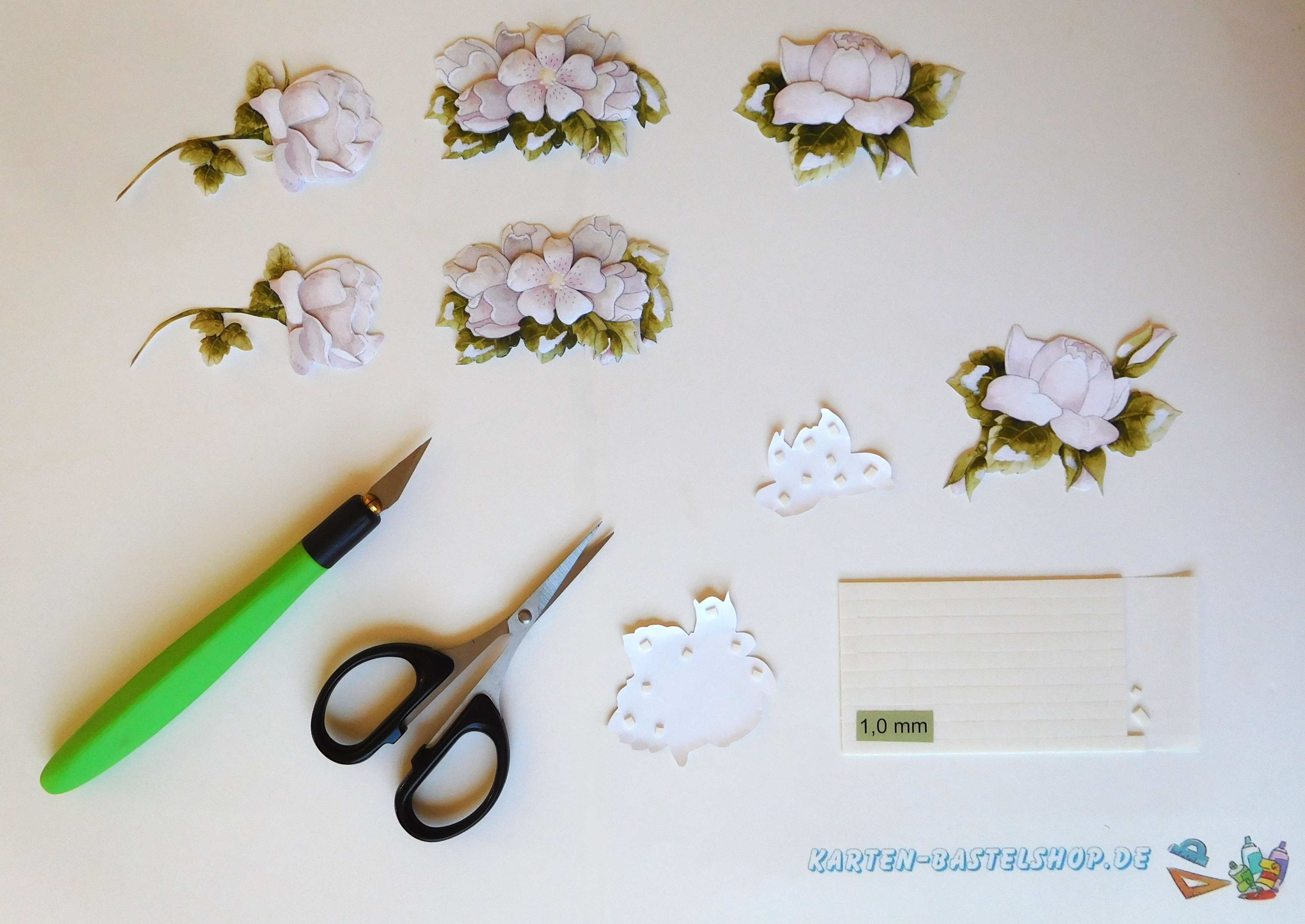 Zum Schluss werden alle Bildteile sorgfältig ausgeschnitten. Legt sie mit der Rückseite nach oben auf eine weiche Unterlage, etwa Moosgummi, und wölbt sie leicht mit der Scherenspitze. Danach klebt Ihr die Teile mit 1 mm Klebepads schichtweise aufeinander – vom größten zum kleinsten Motivteil. So entstehen schöne, plastische Blumenmotive, die dennoch dezent bleiben und perfekt zu diesem Anlass passen.