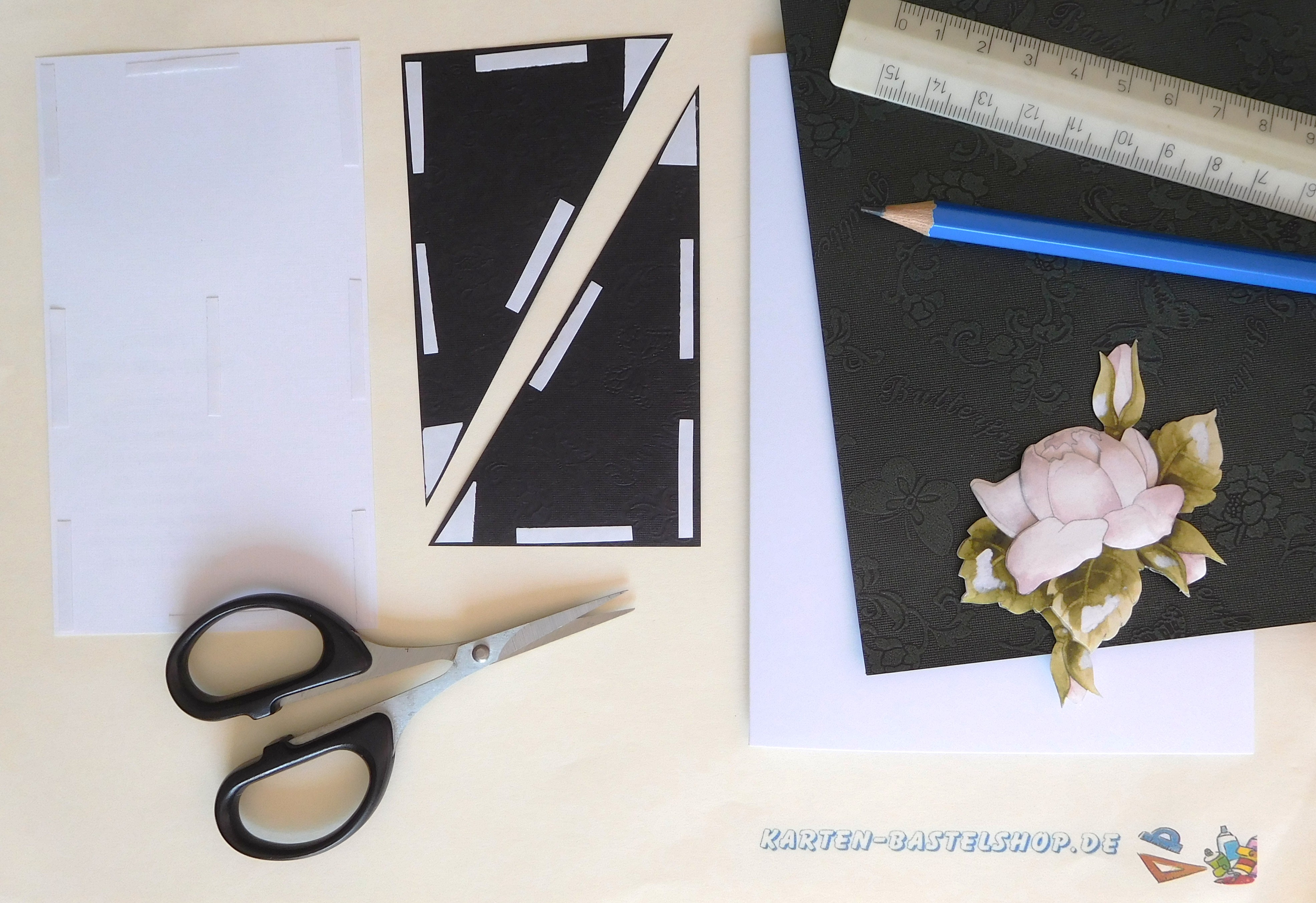 Der Kartenaufleger wird auf 5,5 cm Breite und 11,5 cm Länge zugeschnitten. Beim Auflegen soll der Text oben mit etwa 1,5 cm Abstand zum Kartenrand beginnen. Die zuvor abgeschnittenen Dreiecke werden nun auf der Rückseite des Auflegers hinter die rechte obere und linke untere Ecke geklebt, sodass von vorne eine feine 2 mm Umrandung sichtbar bleibt. Danach befestigt Ihr den Aufleger mittig auf der Karte.